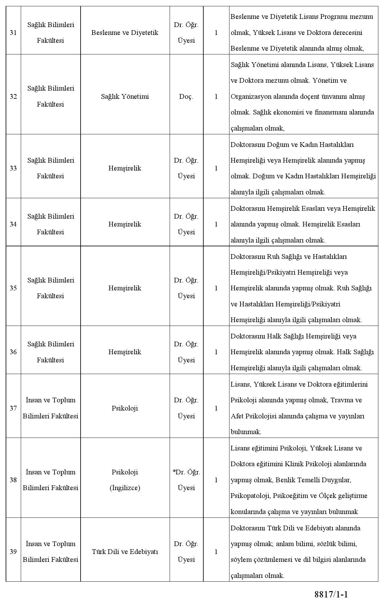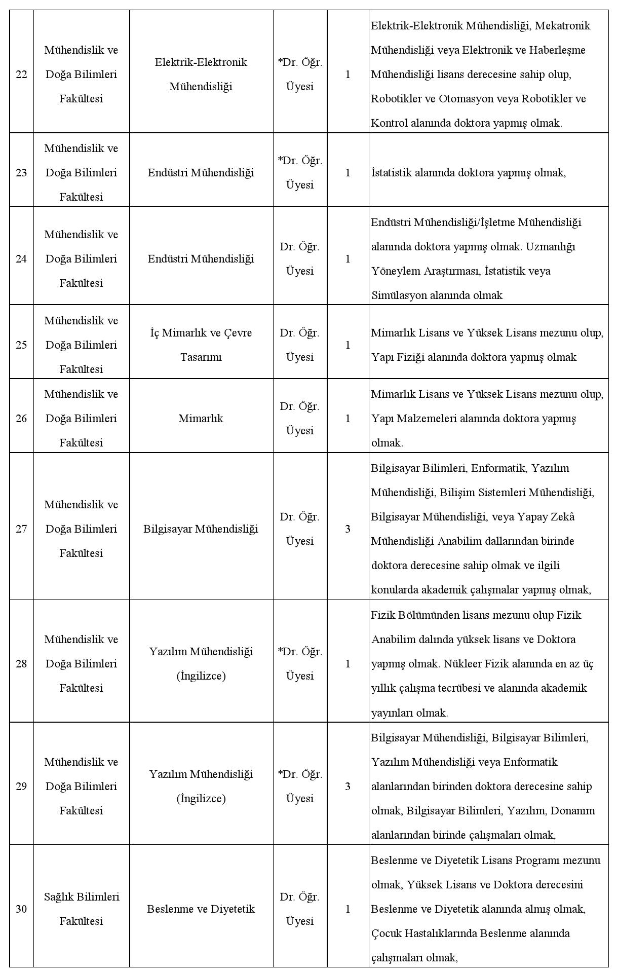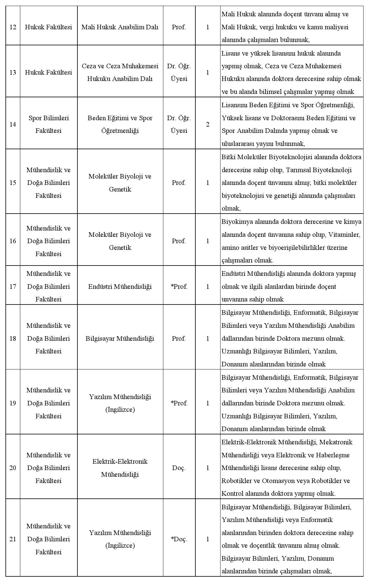 Üniversitemizin aşağıda belirtilen fakülte ve bölümlerine, 2547 sayılı Yükseköğretim Kanunu'nun 23, 24 ve 26. maddeleri ile 12.06.2018 tarihli Resmi Gazete'de yayımlanan "Öğretim Üyeliğine Yükseltilme ve Atanma Yönetmeliğinin yürürlükteki ilgili maddelerine ve Üniversitemizin "Akademik Yükseltilme ve Atama Kriterlerine" göre öğretim üyesi alınacaktır.