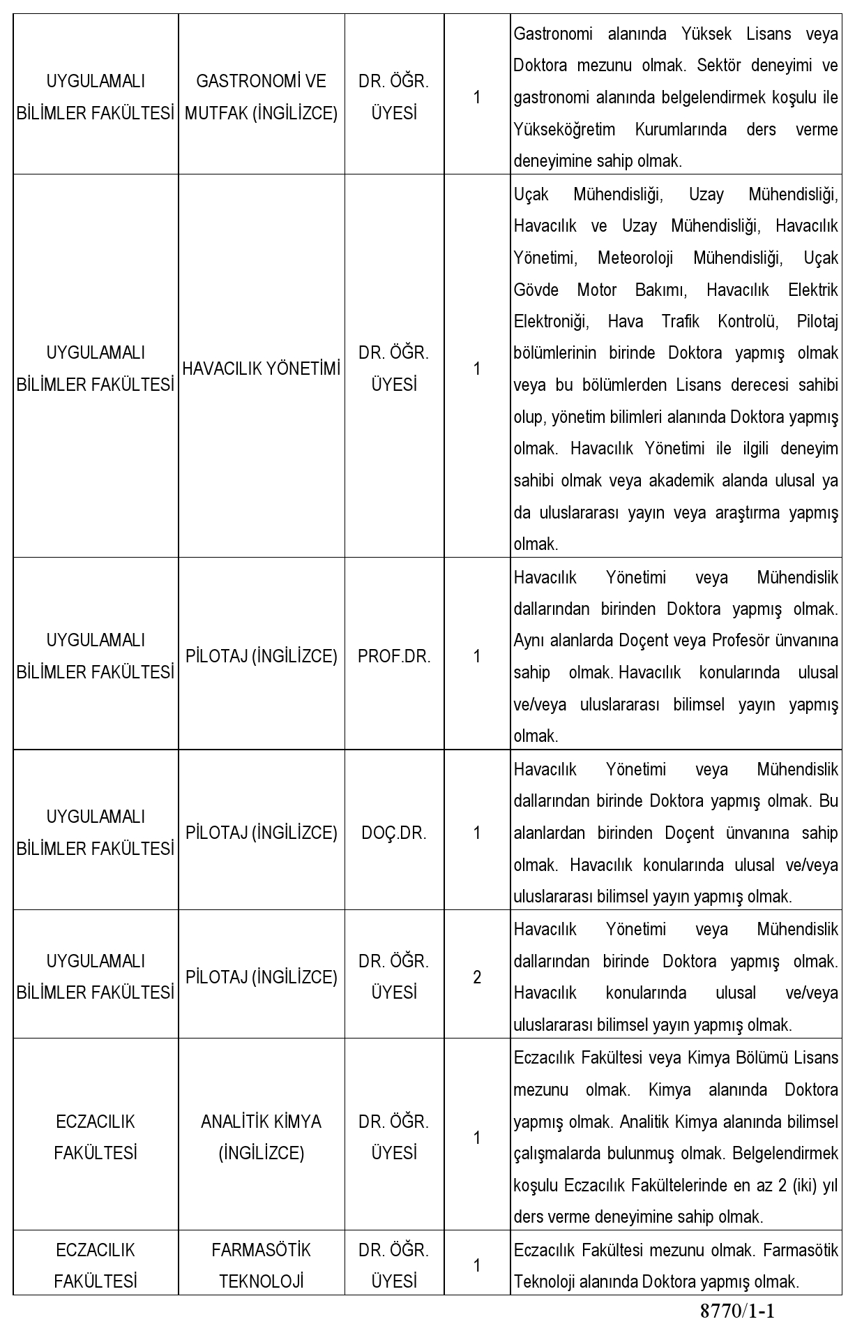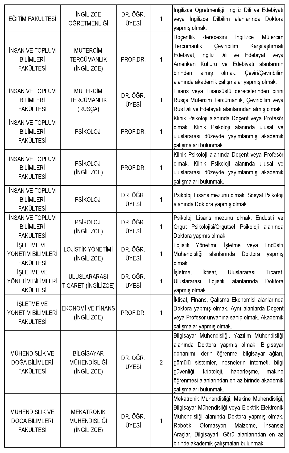 Üniversitemize 2547 sayılı Yükseköğretim Kanunu ve 12.06.2018 tarih ve 30449 sayılı Resmi Gazete'de yayımlanarak yürürlüğe giren "Öğretim Üyeliği Yükseltilme ve Atanma Yönetmeliği'nin" ilgili maddeleri uyarınca aşağıda nitelikleri belirtilen kadrolara Öğretim Üyeleri alınacaktır.