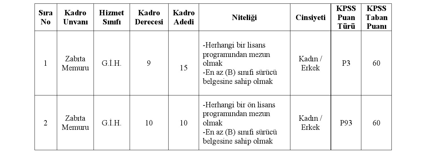 Mardin ili Midyat Belediye Başkanlığı bünyesinde, 657 sayılı Devlet Memurları Kanununa tabi olarak istihdam edilmek üzere; Belediye Zabıta Yönetmeliği hükümlerine göre aşağıda unvanı, sınıfı, derecesi, adedi, nitelikleri, KPSS puan türü, KPSS taban puanı ve diğer şartları taşımak kaydıyla belirtilen boş zabıta memuru kadrolarına açıktan atama yoluyla zabıta memuru alımı yapılacaktır.
