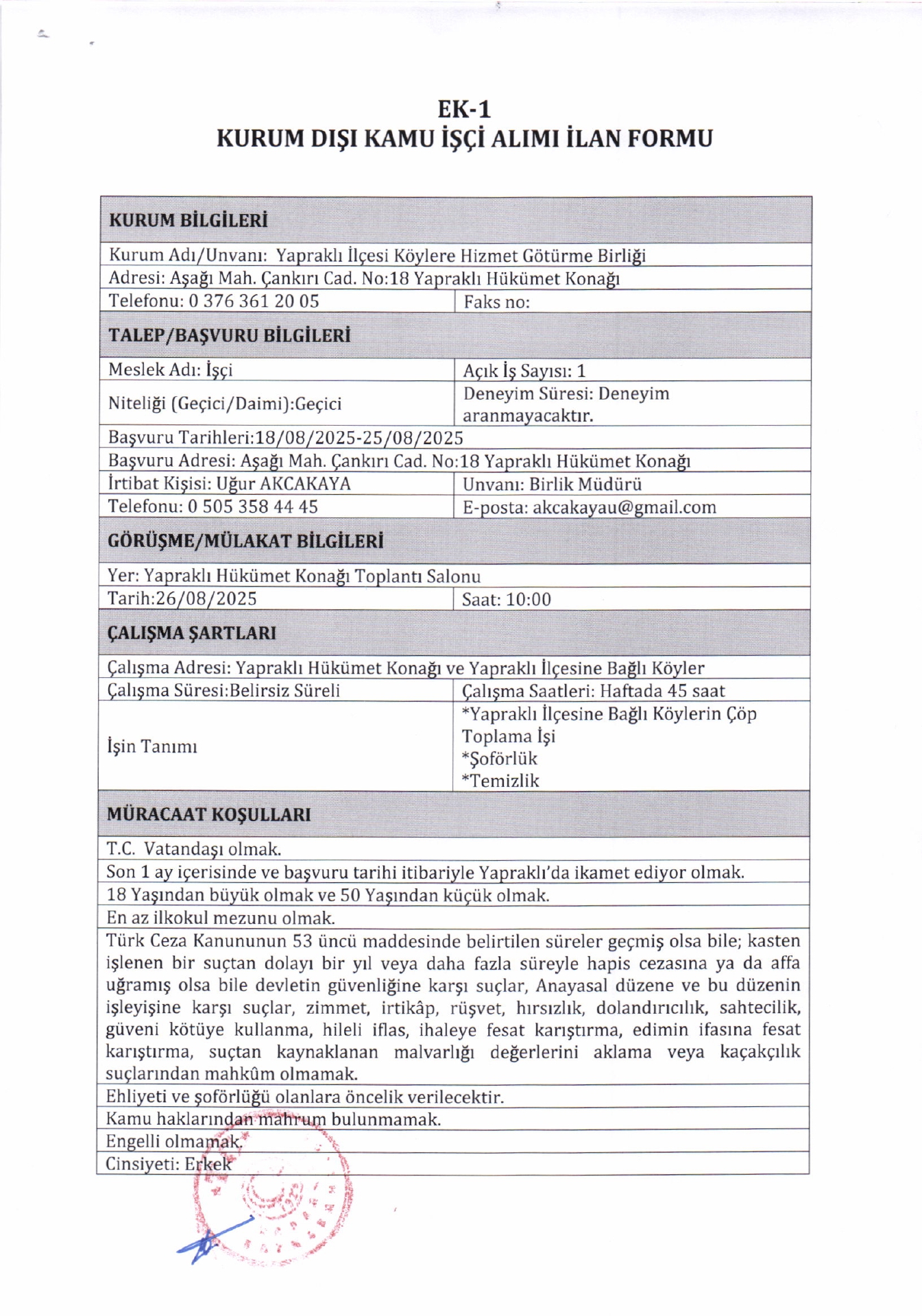 Çankırı Yapraklı SYDV Geçici 1 İşçi Alacak. Son başvuru tarihi 25 ağustos 2025