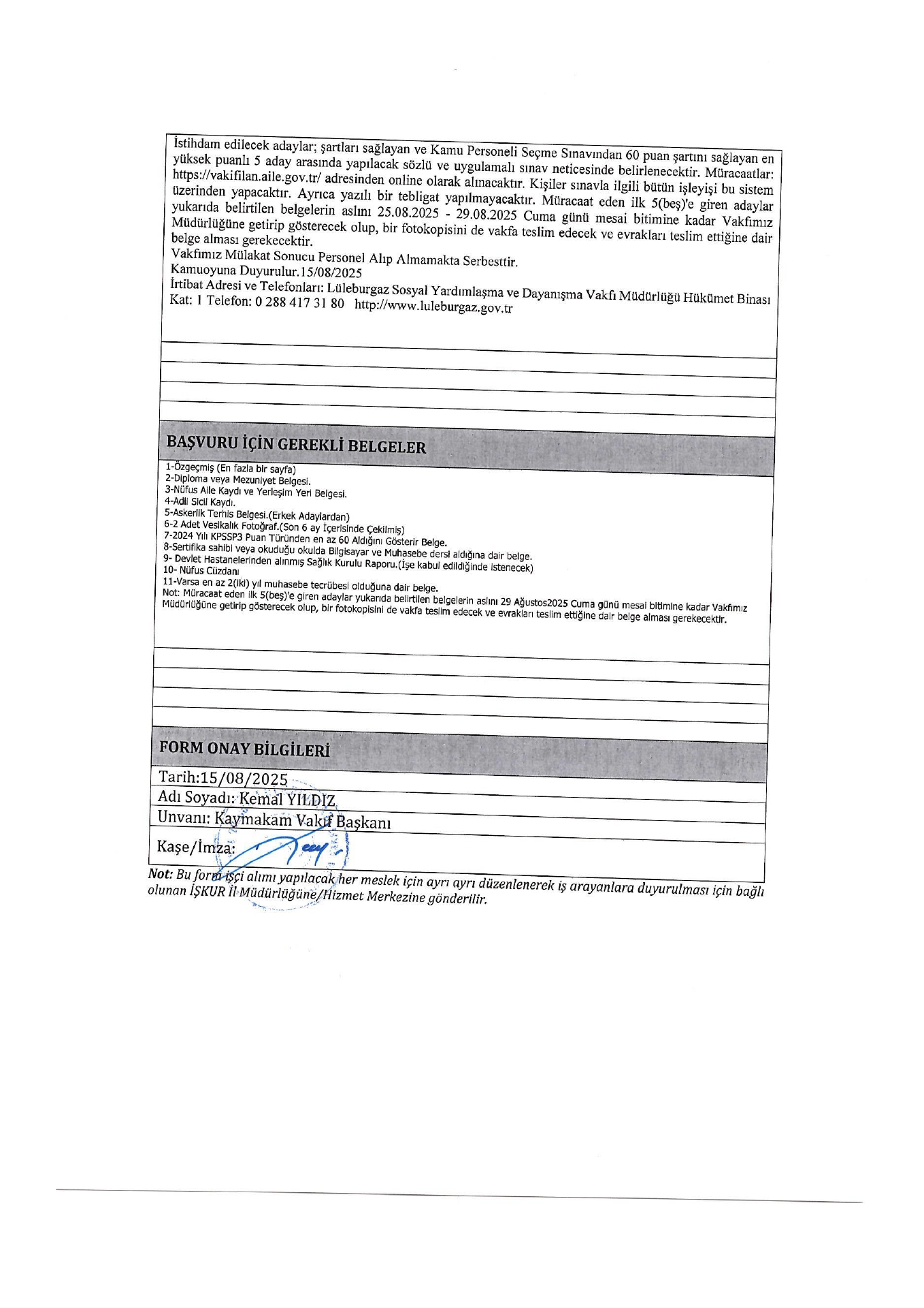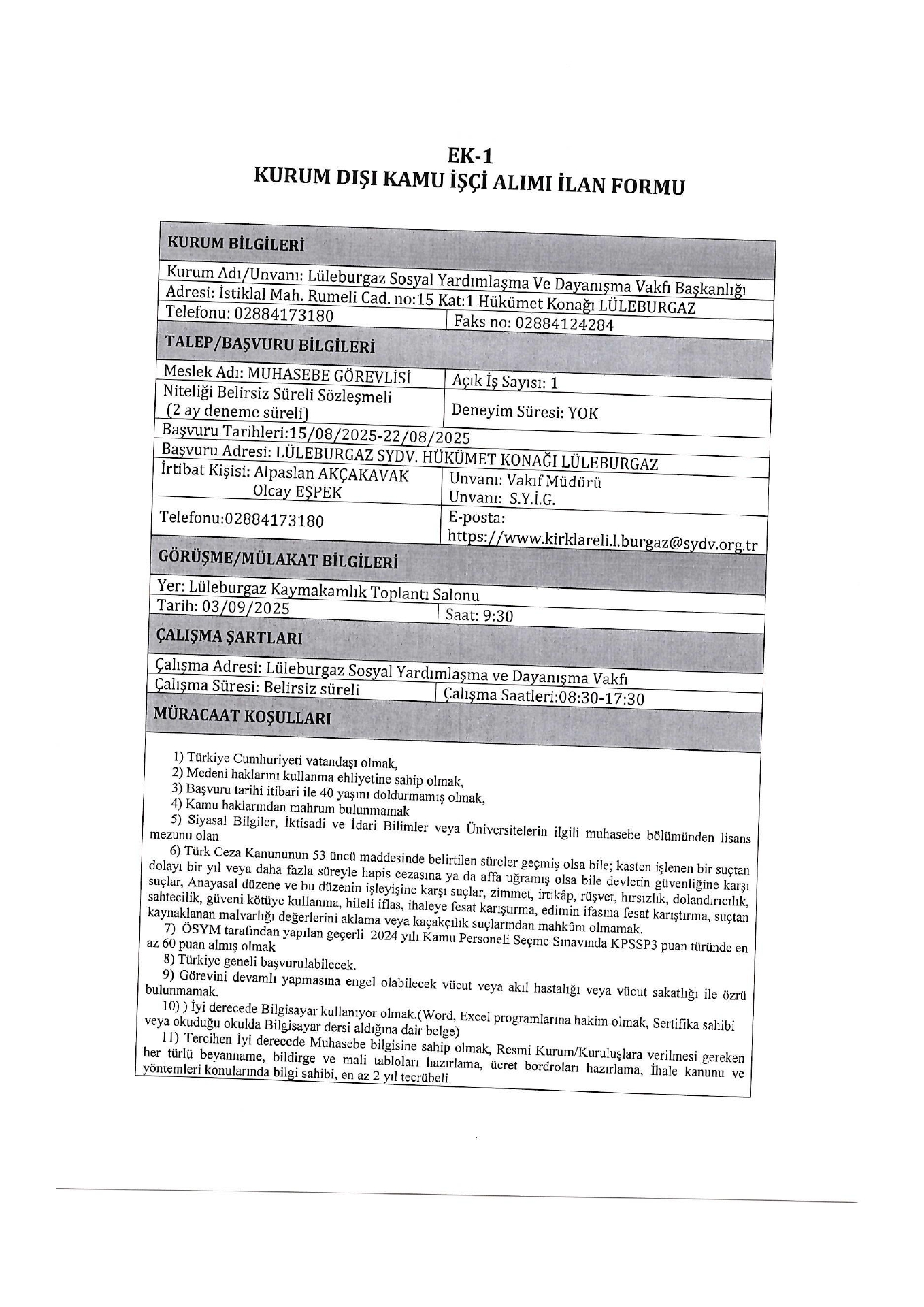 Lüleburgaz SYDV 1 İşçi Alacak. Son başvuru tarihi 22 ağustos 2025