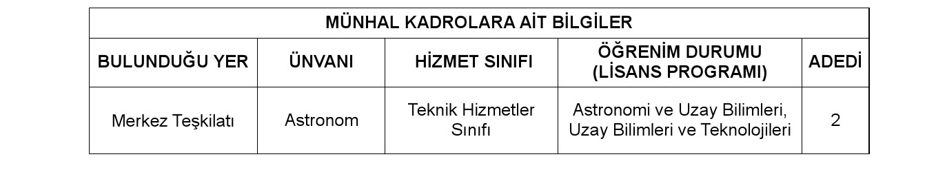 Diyanet İşleri Başkanlığımız Merkez Teşkilatında münhal bulunan ve aşağıdaki tabloda bilgileri yer alan astronom kadrolarına Kamu Personel Seçme Sınavı (KPSS) puan sırası esas alınarak tabloda belirtilen boş kadro sayısının 3 (üç) katı kadar çağrılacak adaylar için yapılacak sözlü sınav başarı sırasına göre açıktan alım yapılacaktır.