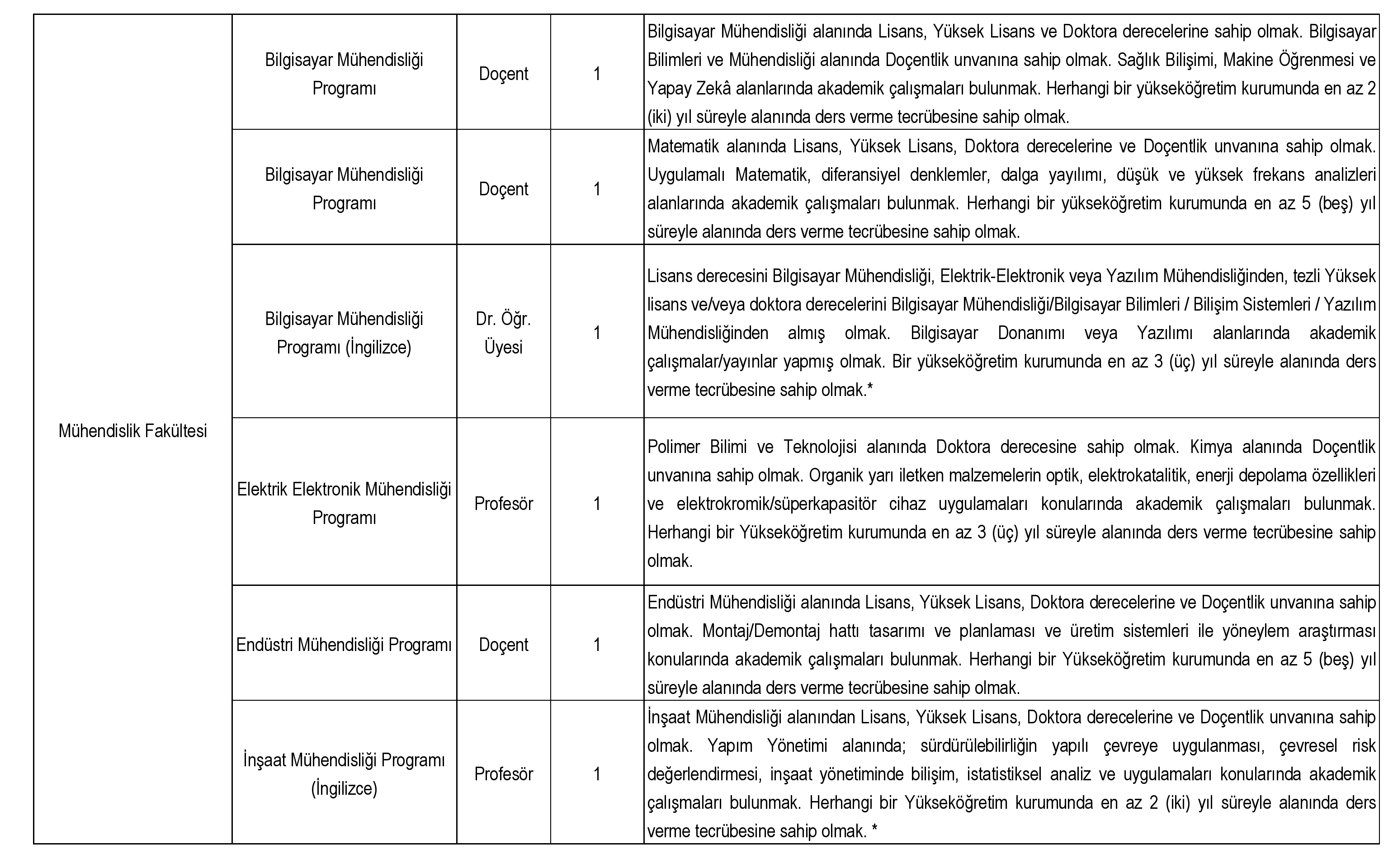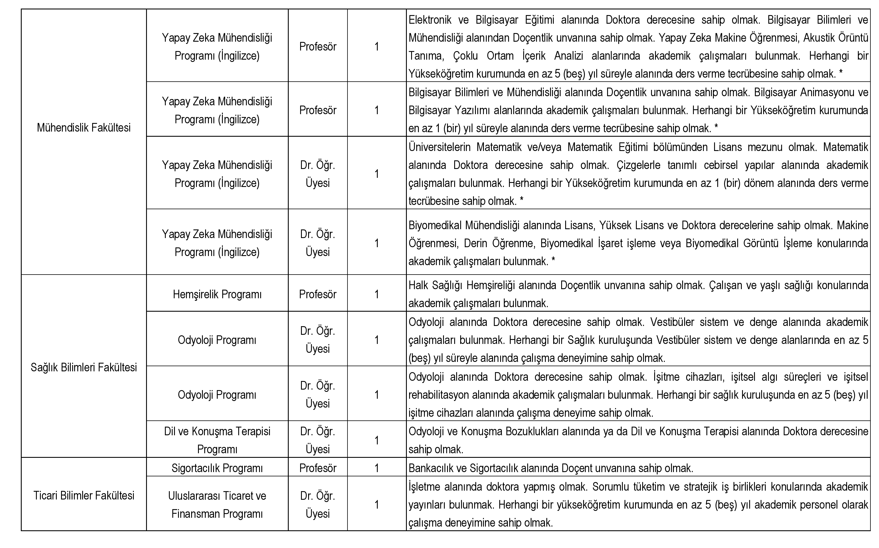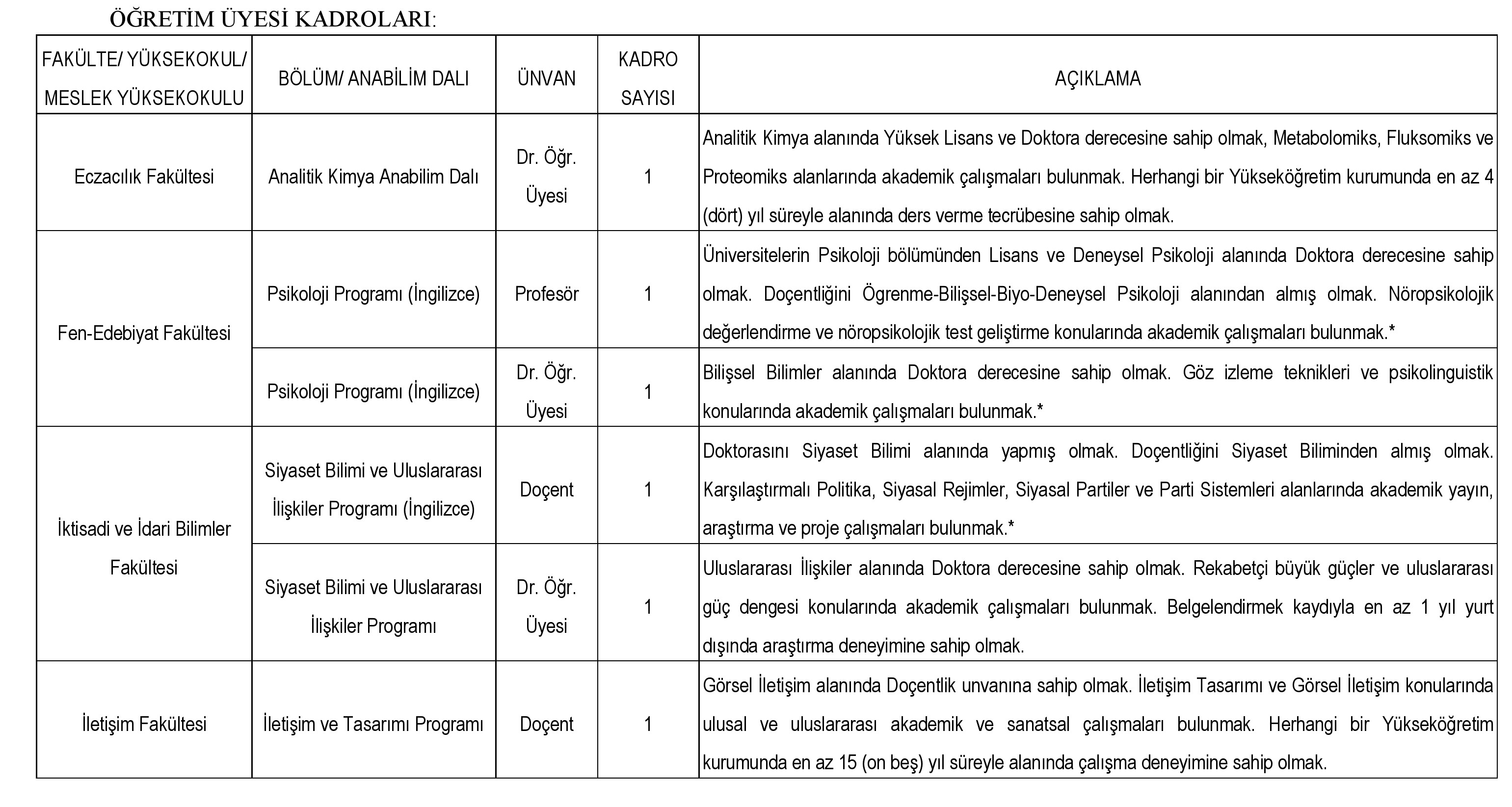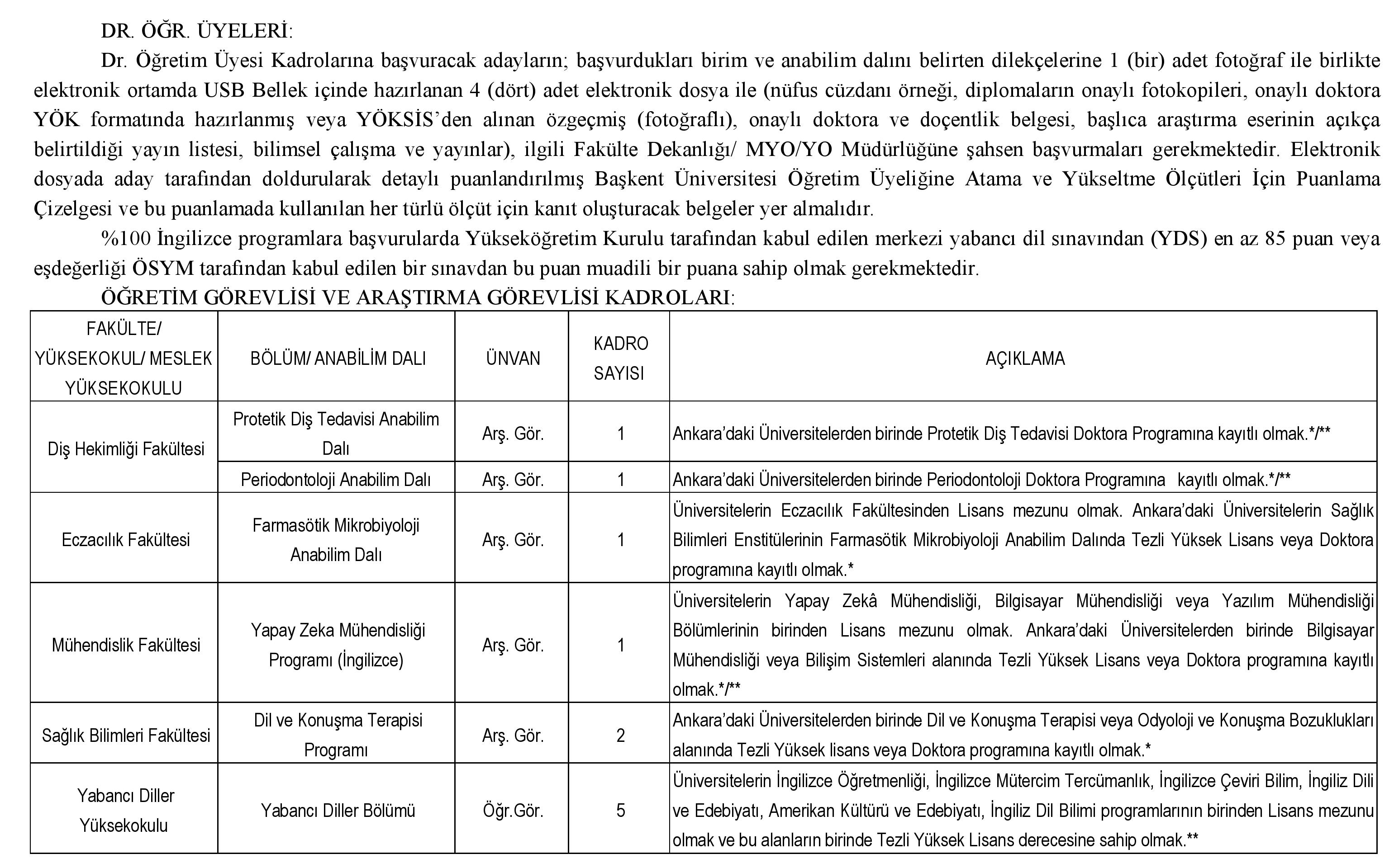 BAŞKENT ÜNİVERSİTESİ'NİN AŞAĞIDA BELİRTİLEN BÖLÜMLERİNE ÖĞRETİM ÜYESİ, ÖĞRETİM GÖREVLİSİ VE ARAŞTIRMA GÖREVLİSİ ALINACAKTIR.