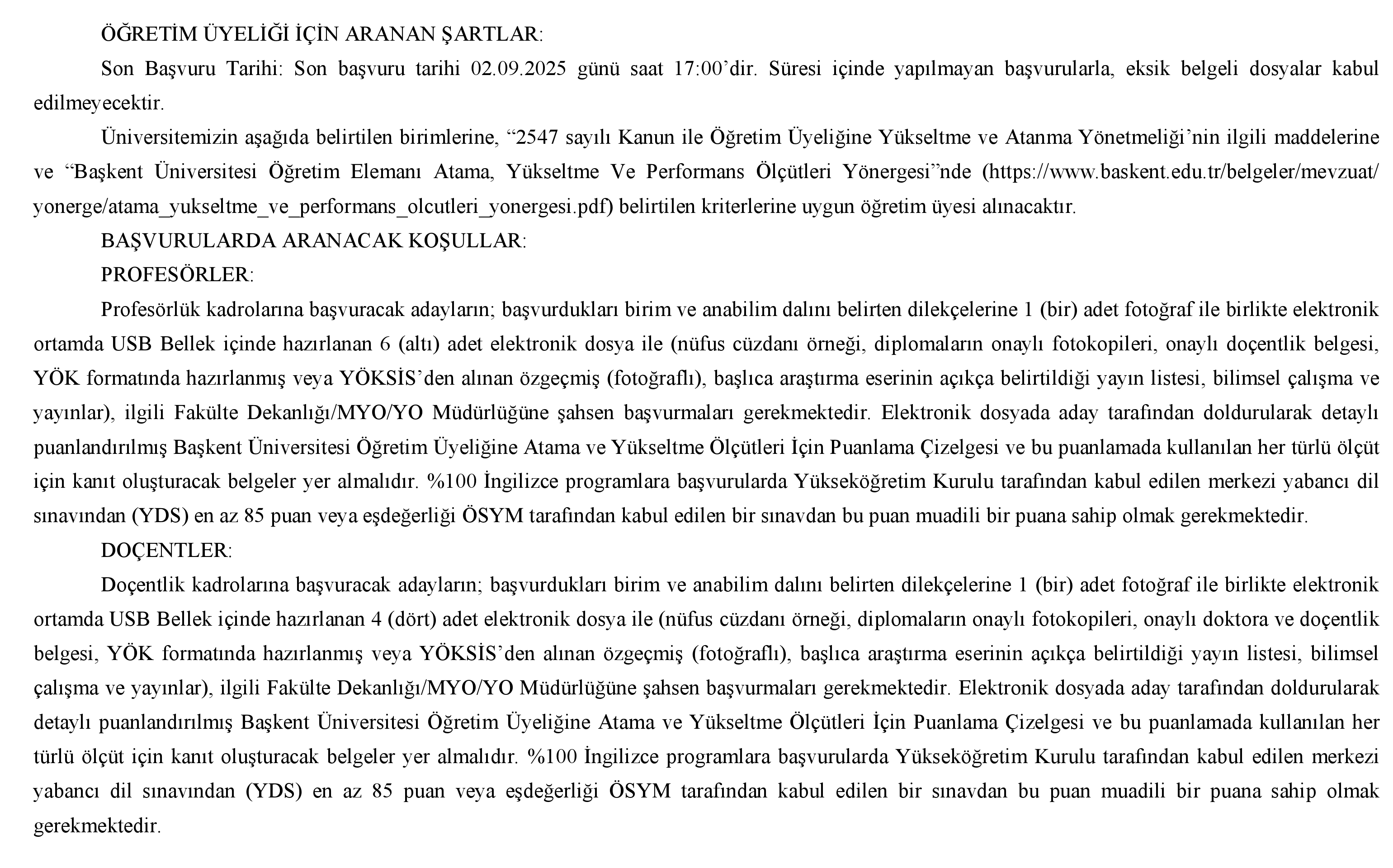 Başkent Üniversitesi Öğretim Üyesi ve Elemanı Alım İlanı. Son başvuru tarihi 1 eylül 2025