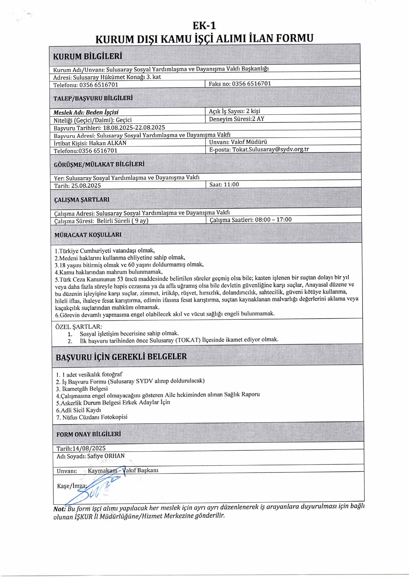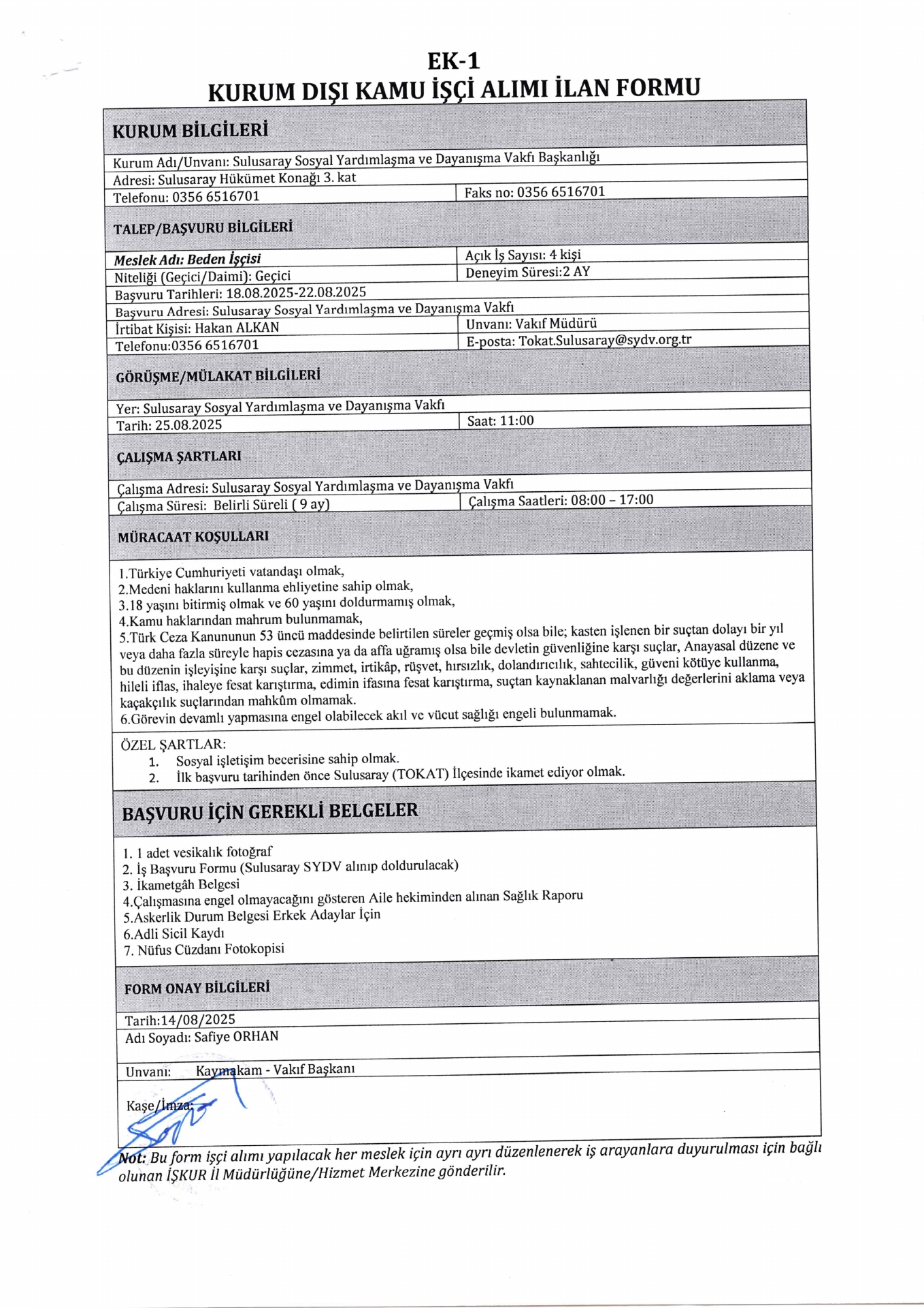 Tokat Sulusaray SYDV Geçici 7 İşçi Alacak. Son başvuru tarihi 22 ağustos 2025