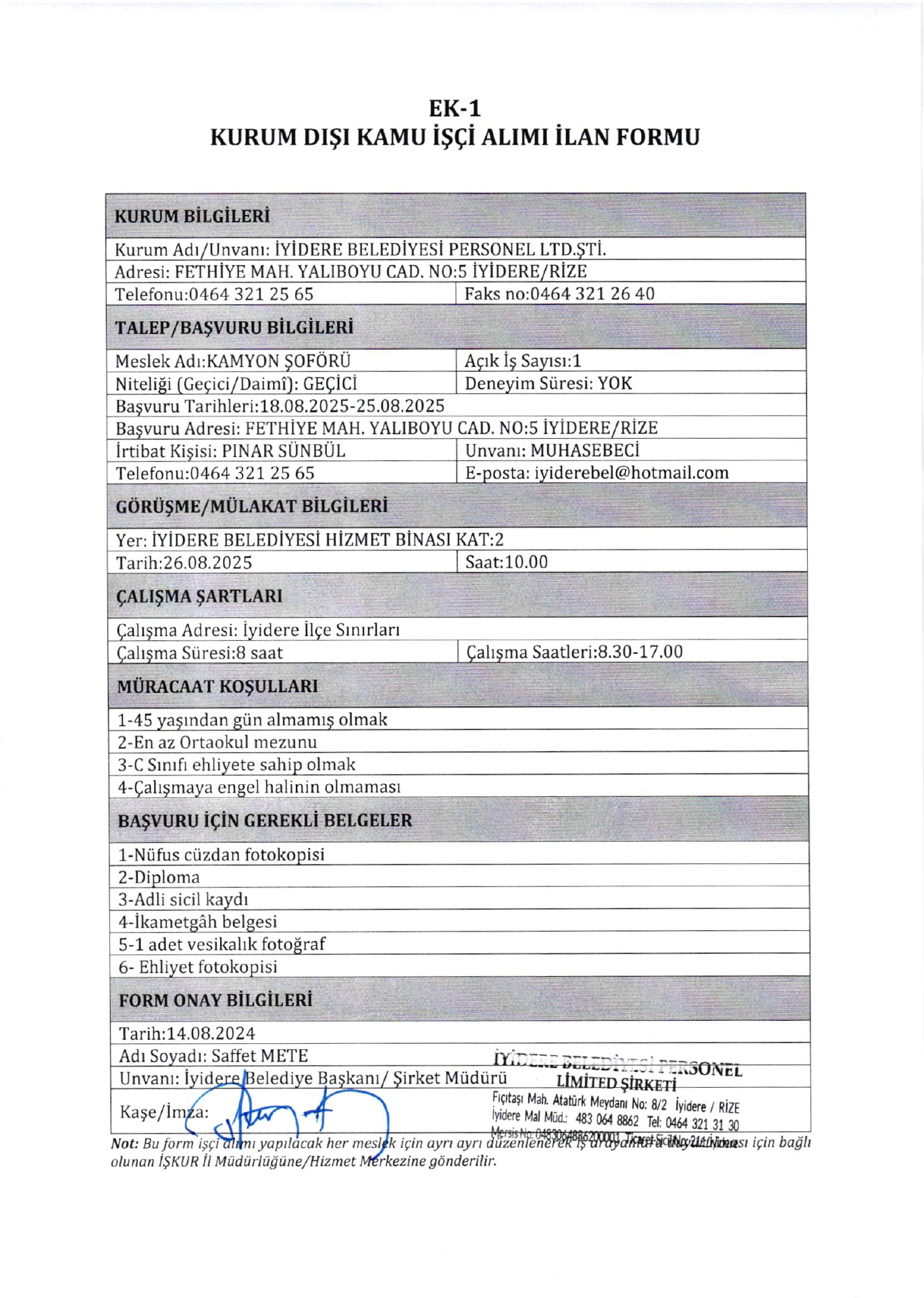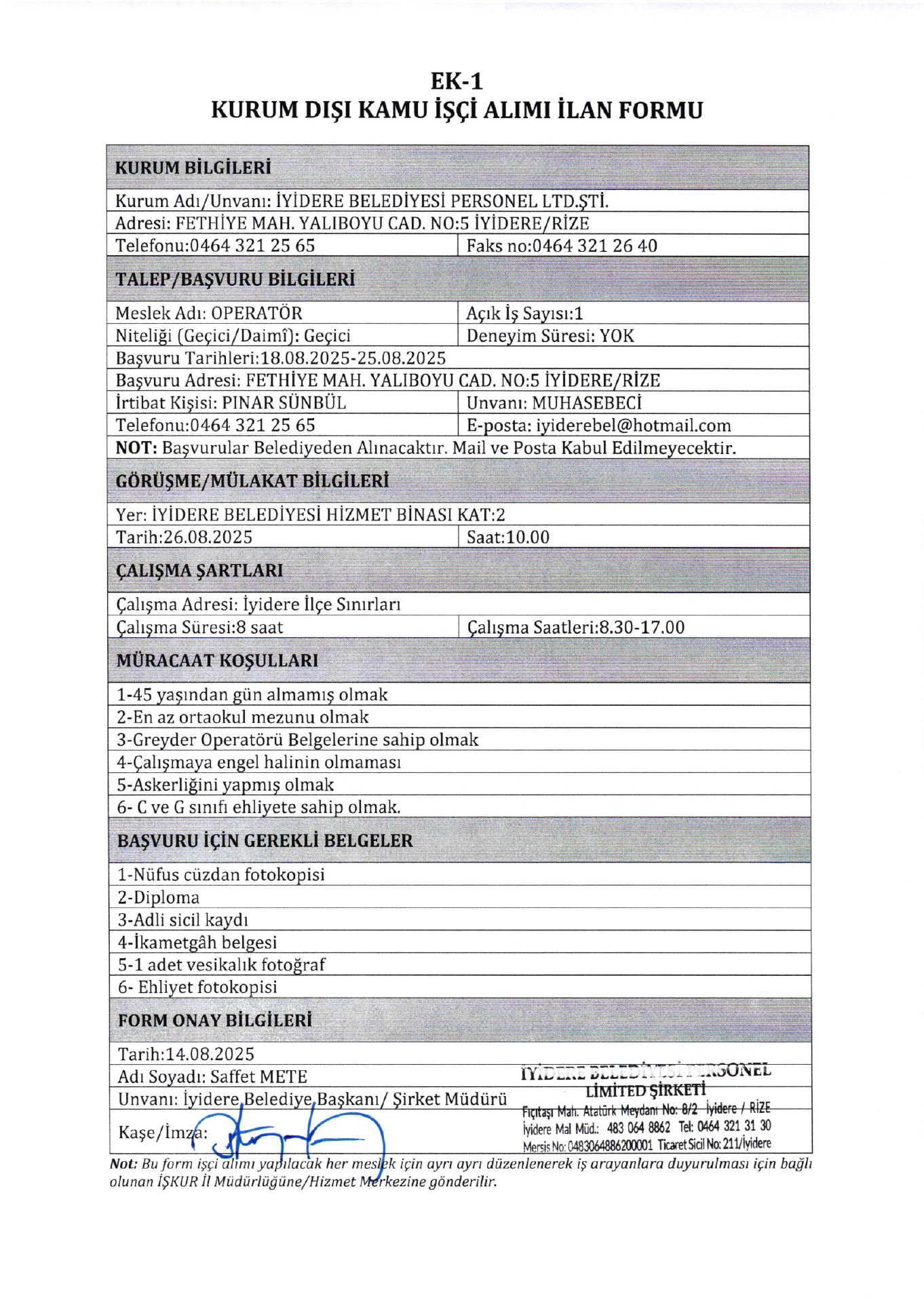 Rize İyidere Belediyesi Geçici 2 İşçi Alacak. Son başvuru tarihi 25 ağustos 2025