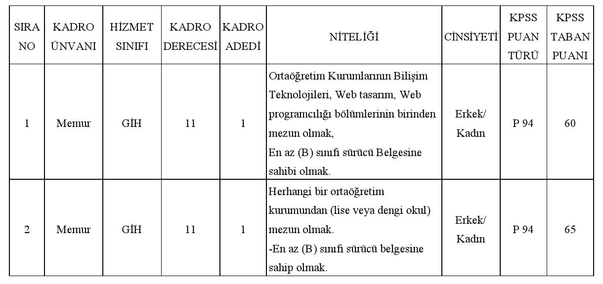 Yozgat ili Baydiğin Belediye Başkanlığı bünyesinde 657 sayılı Devlet Memurları Kanununa tabi olarak istihdam edilmek üzere; Mahalli İdarelere İlk Defa Atanacaklara Dair Sınav ve Atama Yönetmeliği hükümlerine göre aşağıda unvanı, sınıfı, derecesi, adedi, nitelikleri, KPSS puan türü, KPSS taban puanı ve diğer şartları taşımak kaydıyla, belirtilen boş kadrolara açıktan atama yoluyla memur alınacaktır.
