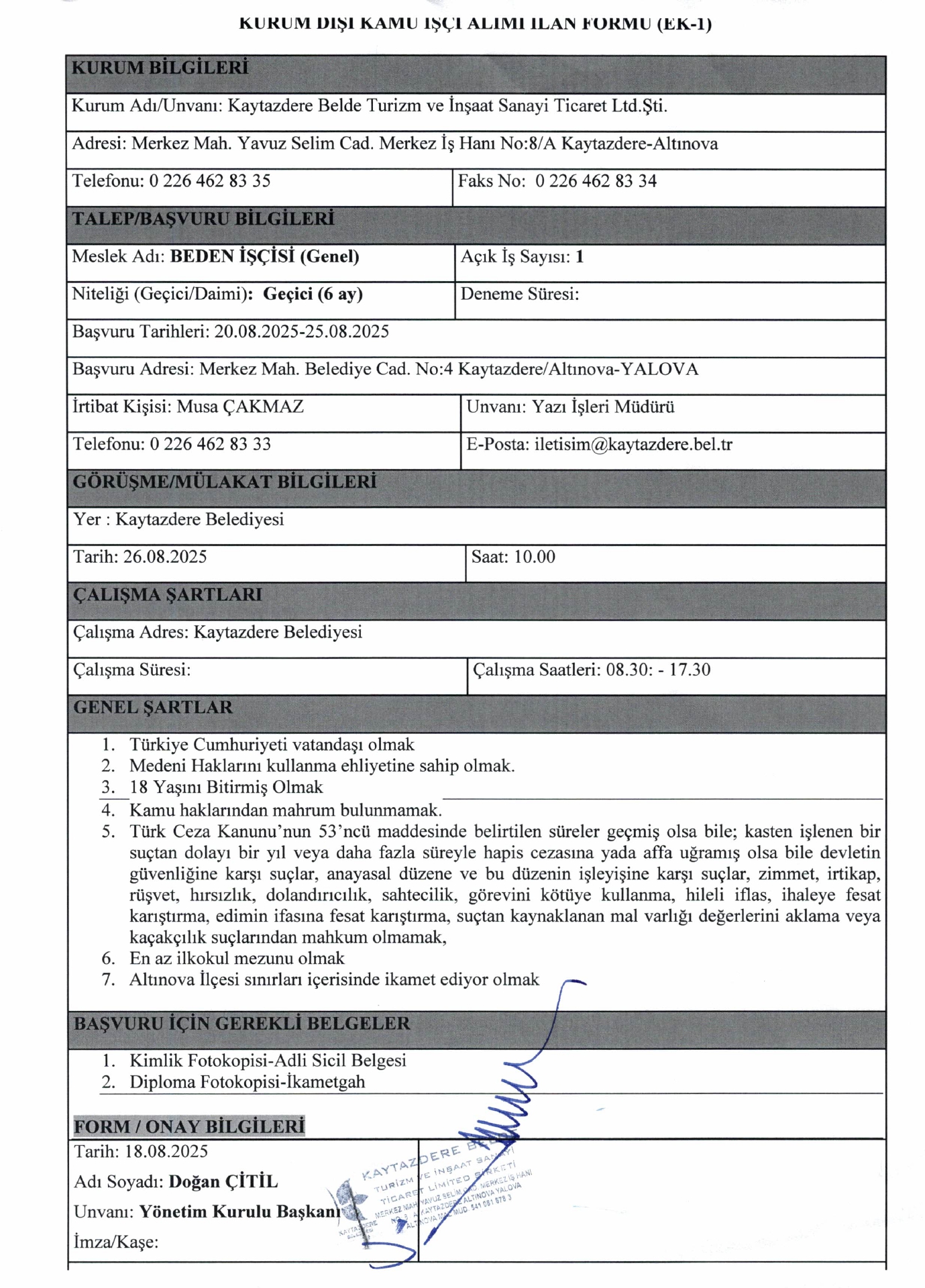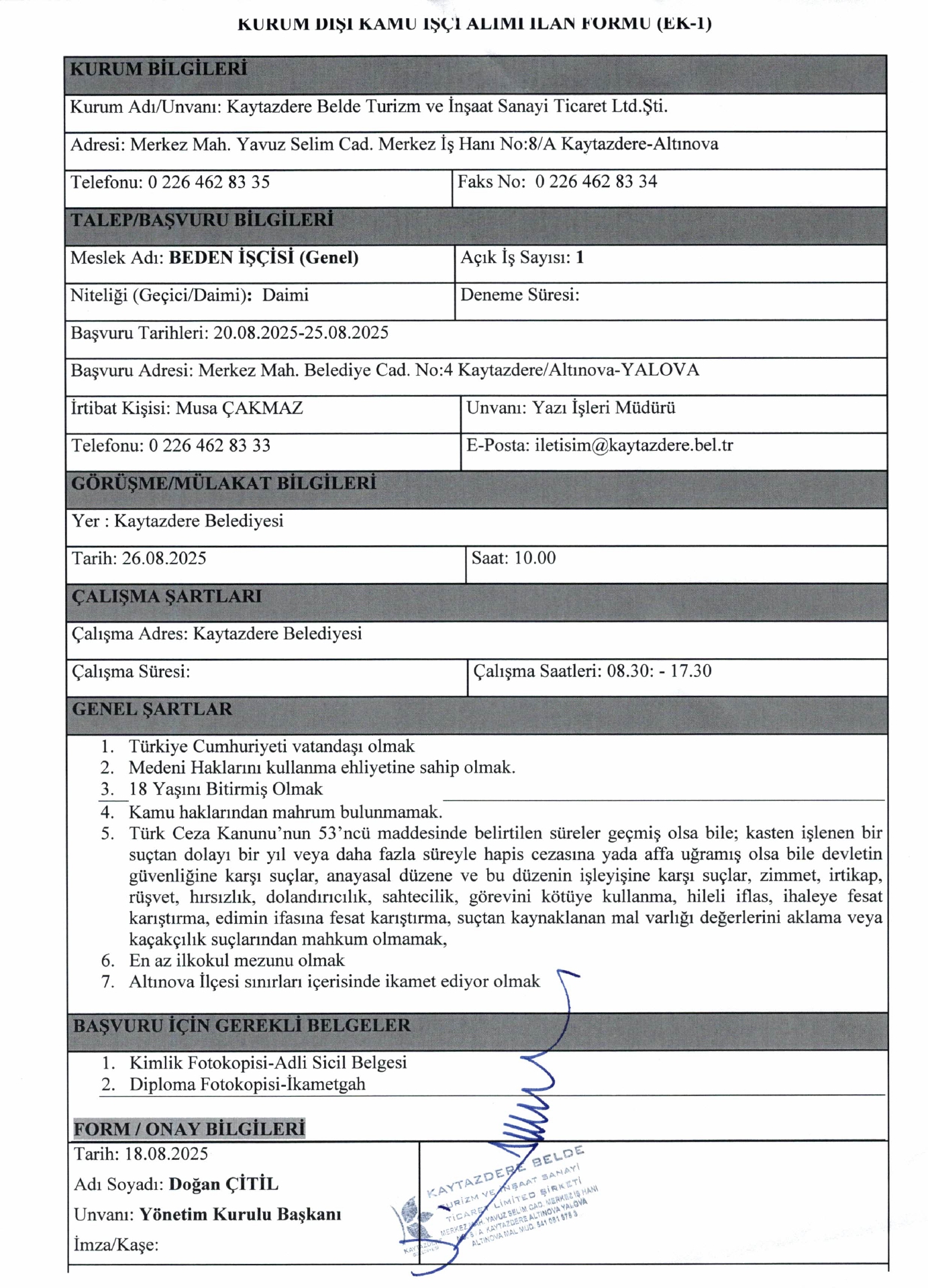 Yalova Kaytazdere Belde Turizm 2 İşçi Alacak. Son başvuru tarihi 25 ağustos 2025