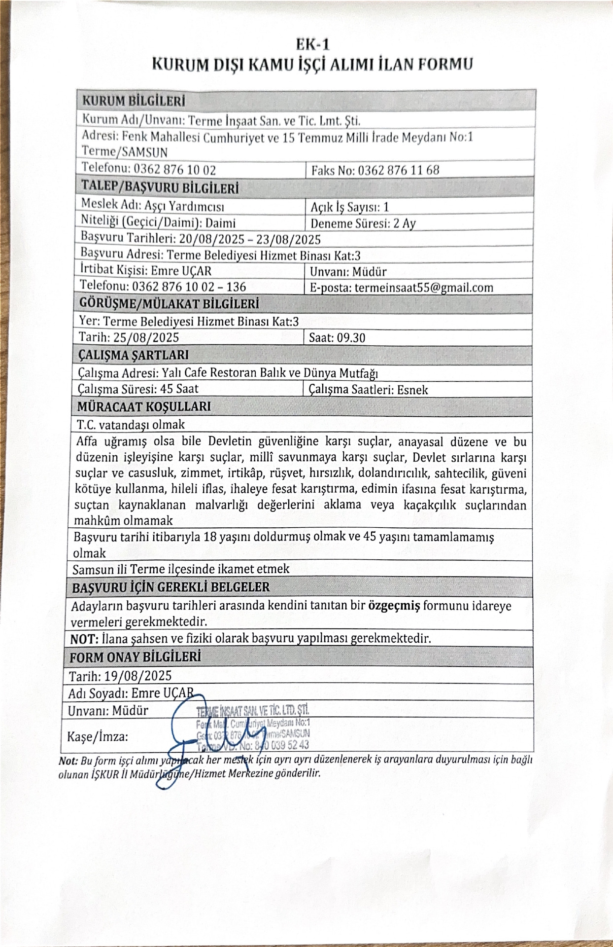 Samsun Terme İnşaat 1 İşçi Alacak. Son başvuru tarihi 23 ağustos 2025