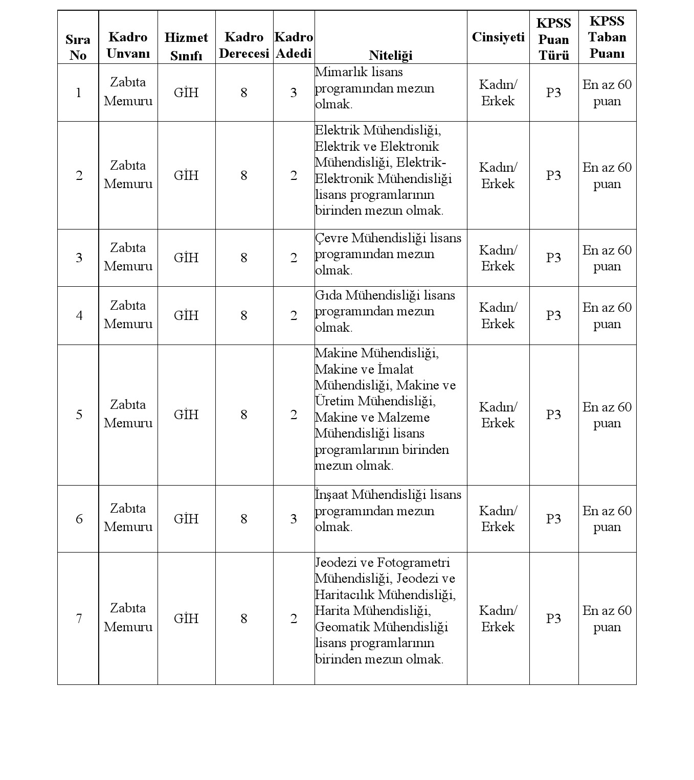Gaziantep ili Şehitkamil Belediye Başkanlığı bünyesinde, 657 sayılı Devlet Memurları Kanunu'na tabi olarak istihdam edilmek üzere; "Belediye Zabıta Yönetmeliği" hükümlerine göre aşağıda unvanı, sınıfı, derecesi, adedi, nitelikleri, KPSS puan türü, KPSS taban puanı ve diğer şartları taşımak kaydıyla, belirtilen boş kadrolara açıktan atama yoluyla zabıta memuru alımı yapılacaktır.