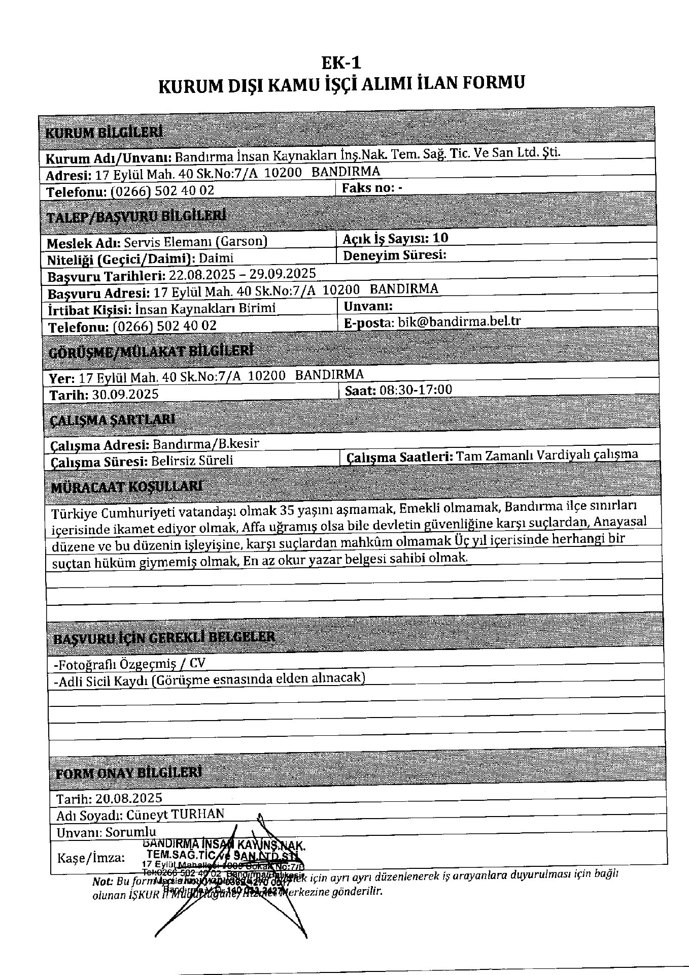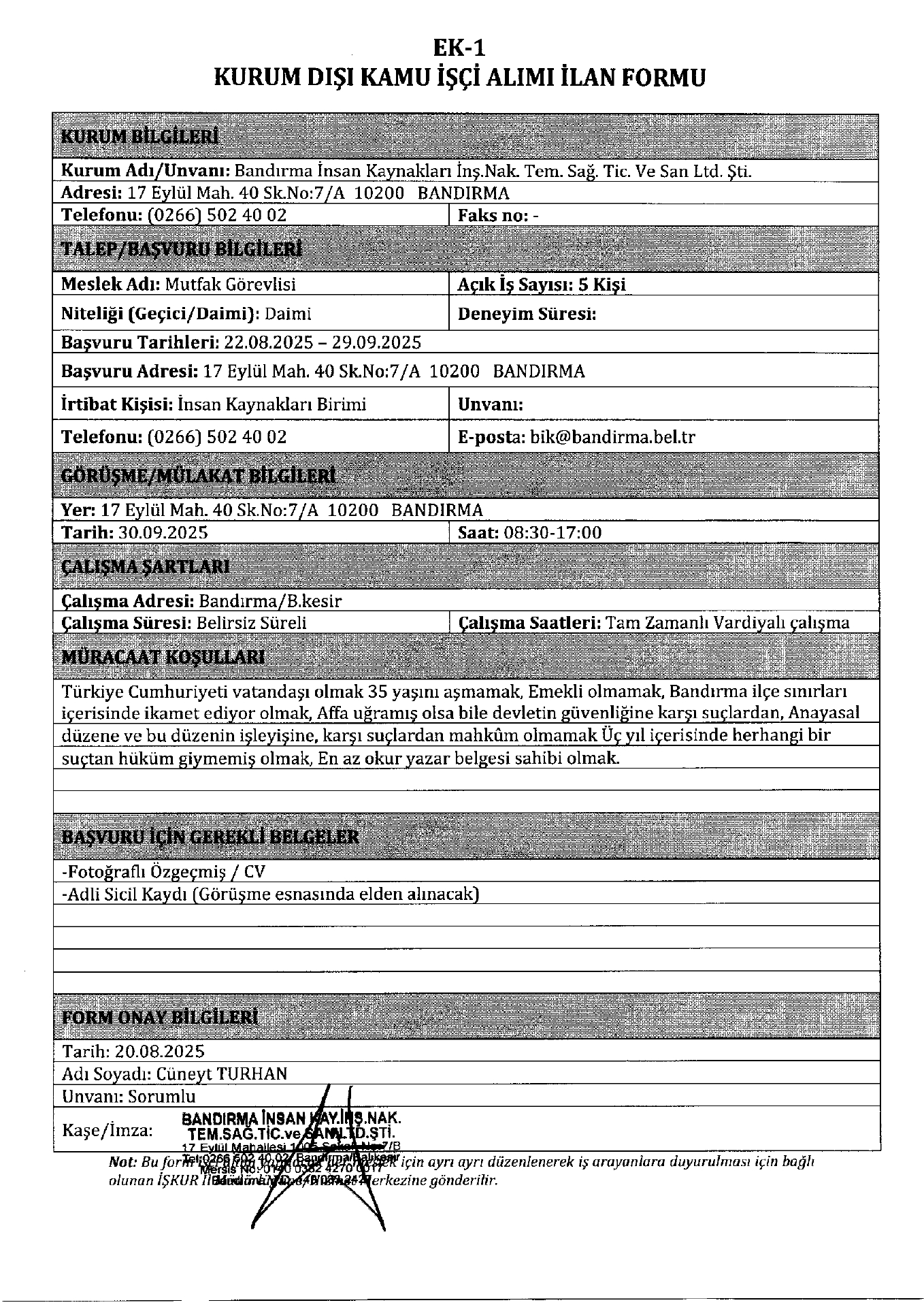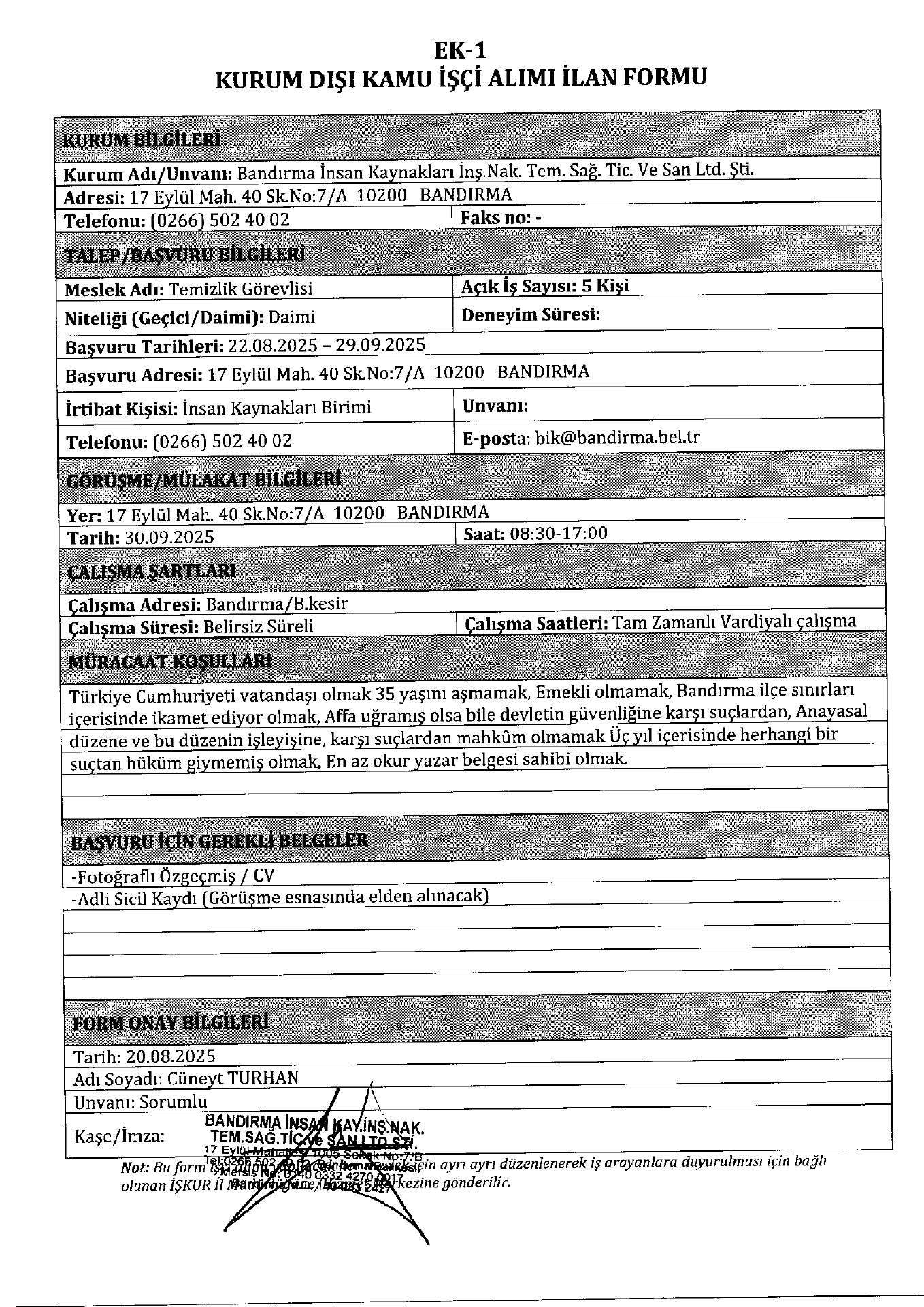 Bandırma İnsan Kaynakları 20 İşçi Alacak. Son başvuru tarihi 29 eylül 2025