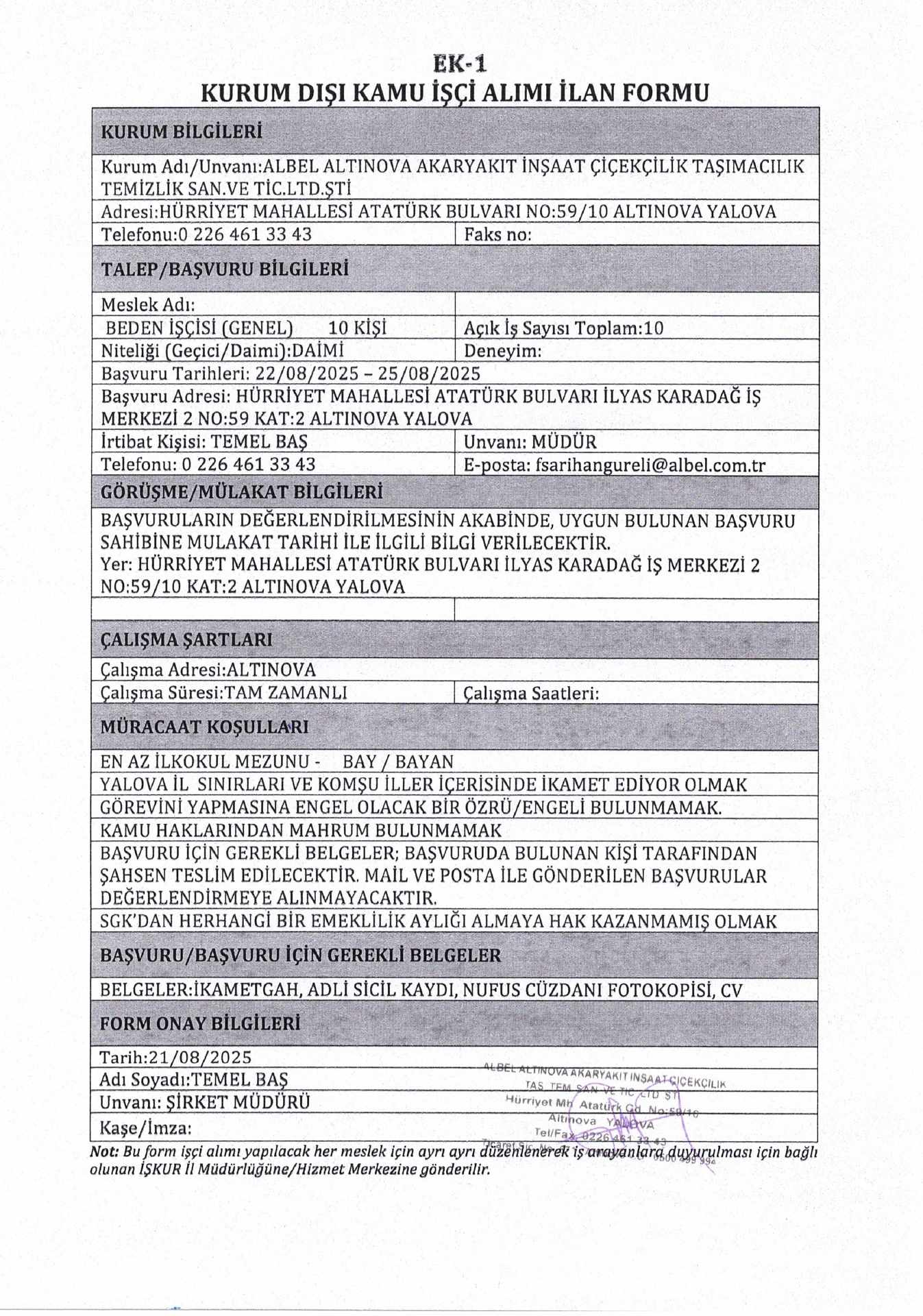 Yalova Albel Altınova Akaryakıt 10 İşçi Alacak. Son başvuru tarihi 25 ağustos 2025