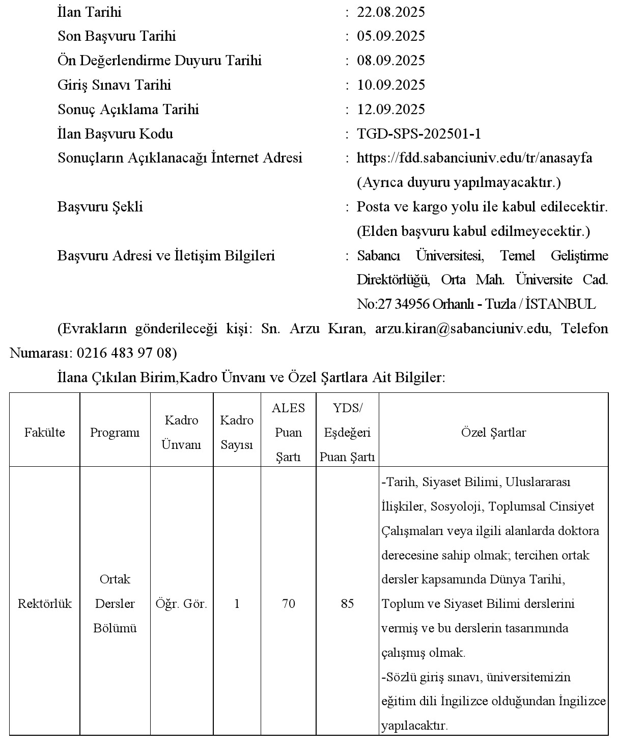 Sabancı Üniversitesi Öğretim Elemanı Alım İlanı. Son başvuru tarihi 5 eylül 2025