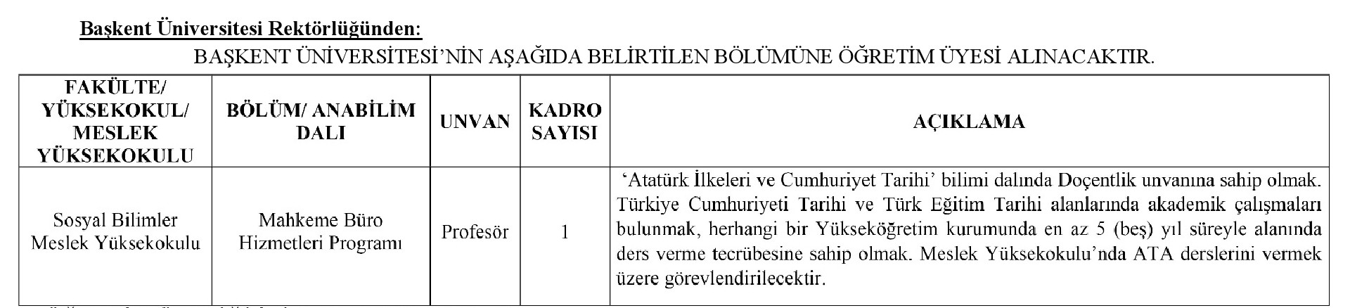 Üniversitemizin aşağıda belirtilen birimlerine, "2547 sayılı Kanun ile Öğretim Üyeliğine Yükseltme ve Atanına Yönetmeliği'nin ilgili maddelerine ve "Başkent Üniversitesi Öğretim Elemanı Atama, Yükseltme Ve Performans Ölçütleri Yönergesinde (https://www.baskent.edu.tr/belgeler/mevzuat/yonerge/atama_yukseltme_ve_performans_olcutleri_yonergesi.pdf') belirtilen kriterlerine uygun öğretim üyesi alınacaktır.