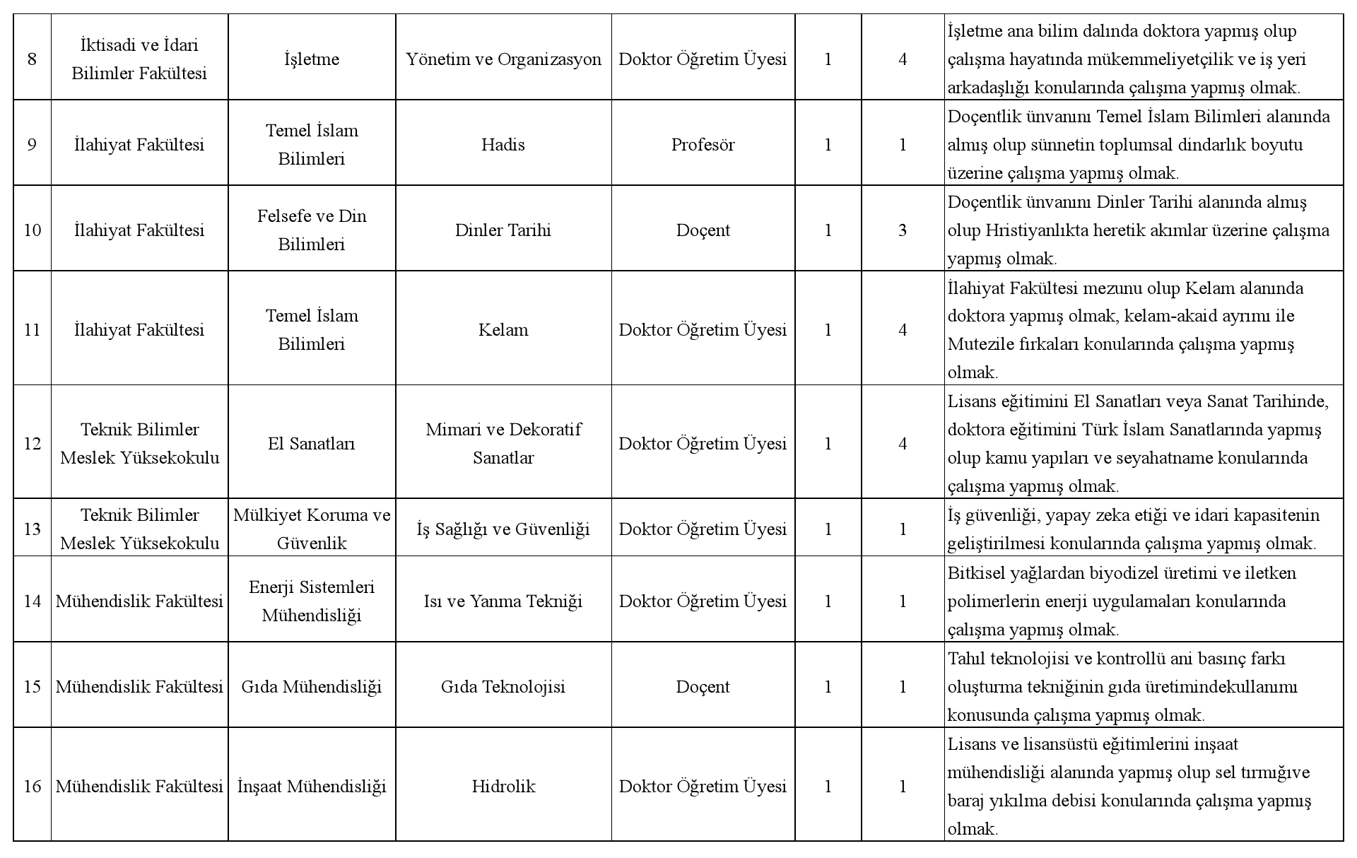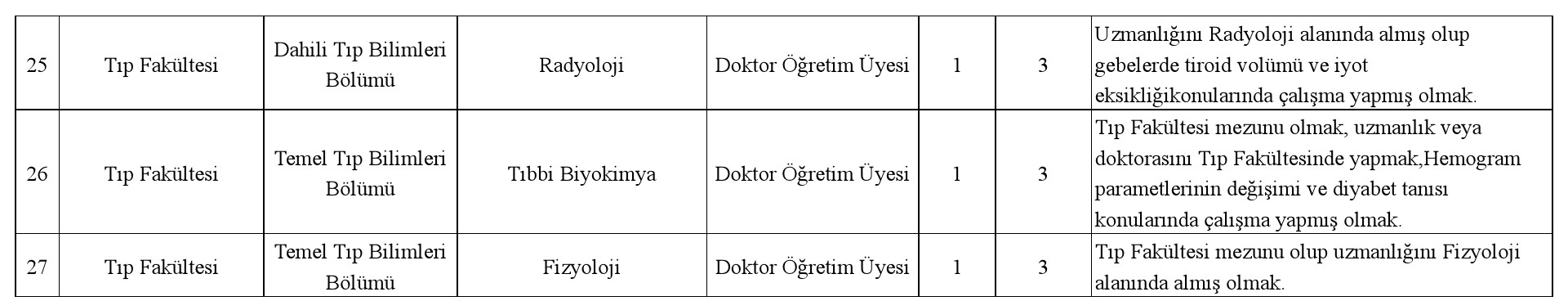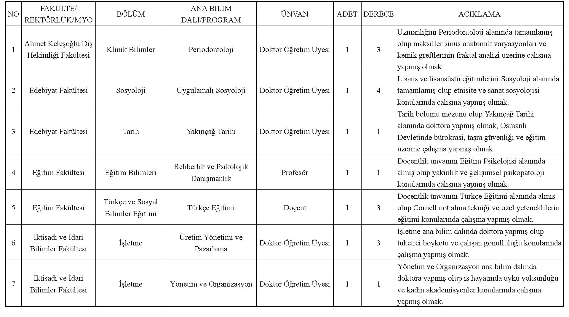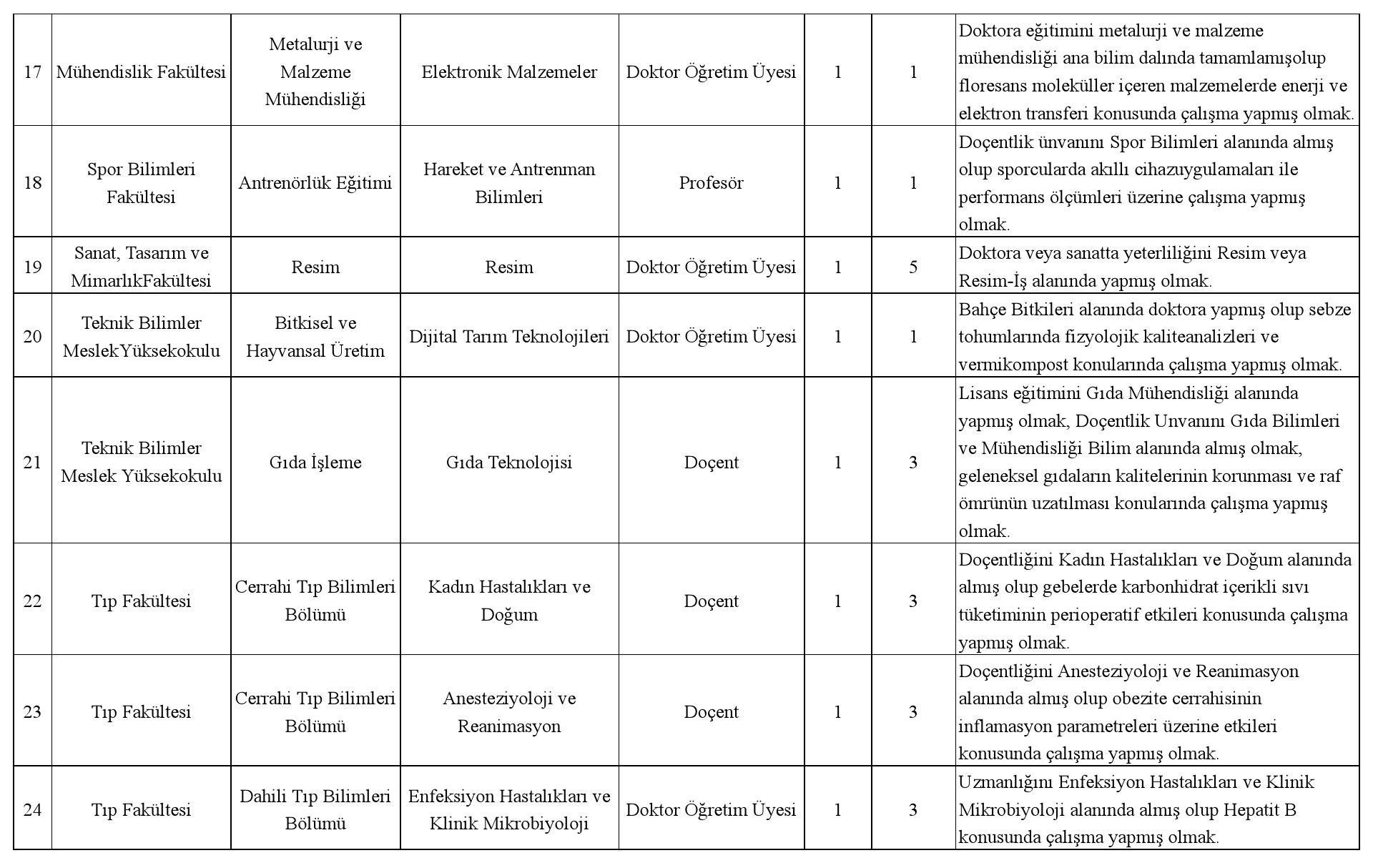 Üniversitemizin aşağıda belirtilen birimlerine, 2547 sayılı Yükseköğretim Kanunu ile Öğretim Üyeliğine Yükseltilme ve Atanma Yönetmeliği'nin ilgili maddeleri gereğince öğretim üyesi alınacaktır.
