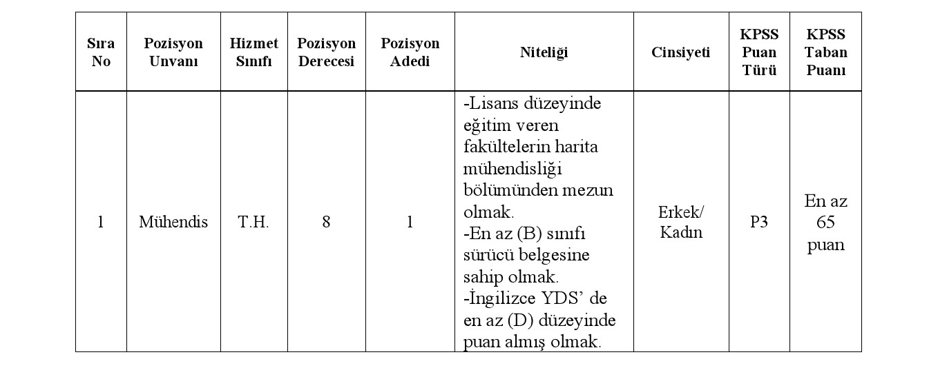 Ardahan Belediye Başkanlığı bünyesinde 5393 sayılı Belediye Kanunu'nun 49 uncu maddesi ile Mahalli İdarelere İlk Defa Atanacaklara Dair Sınav ve Atama Yönetmeliği hükümlerine göre aşağıda unvanı, sınıfı, derecesi, adedi, nitelikleri, KPSS puan türü, KPSS taban puanı ve diğer şartları taşımak kaydıyla, belirtilen boş pozisyona tam zamanlı sözleşmeli personel alınacaktır.