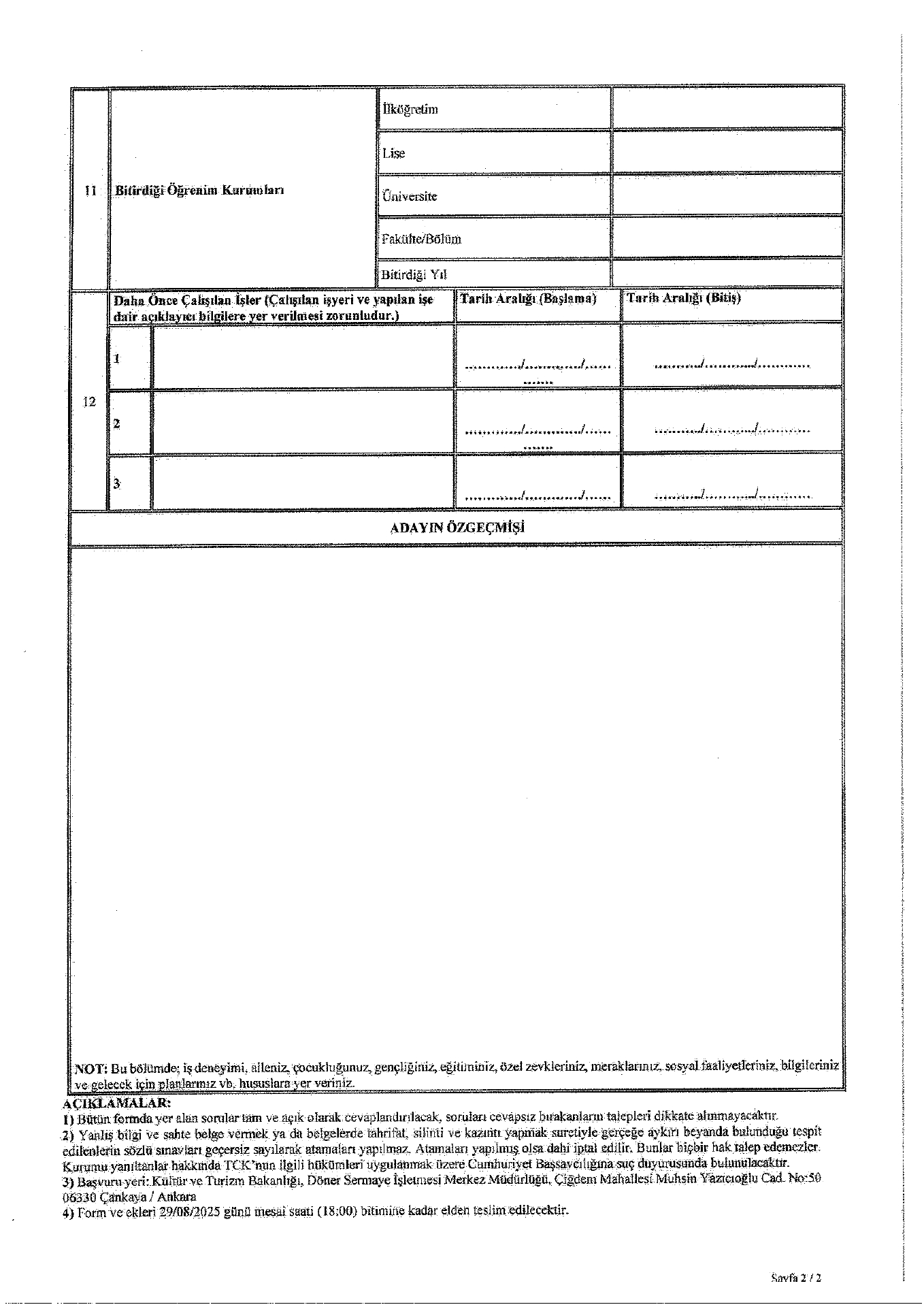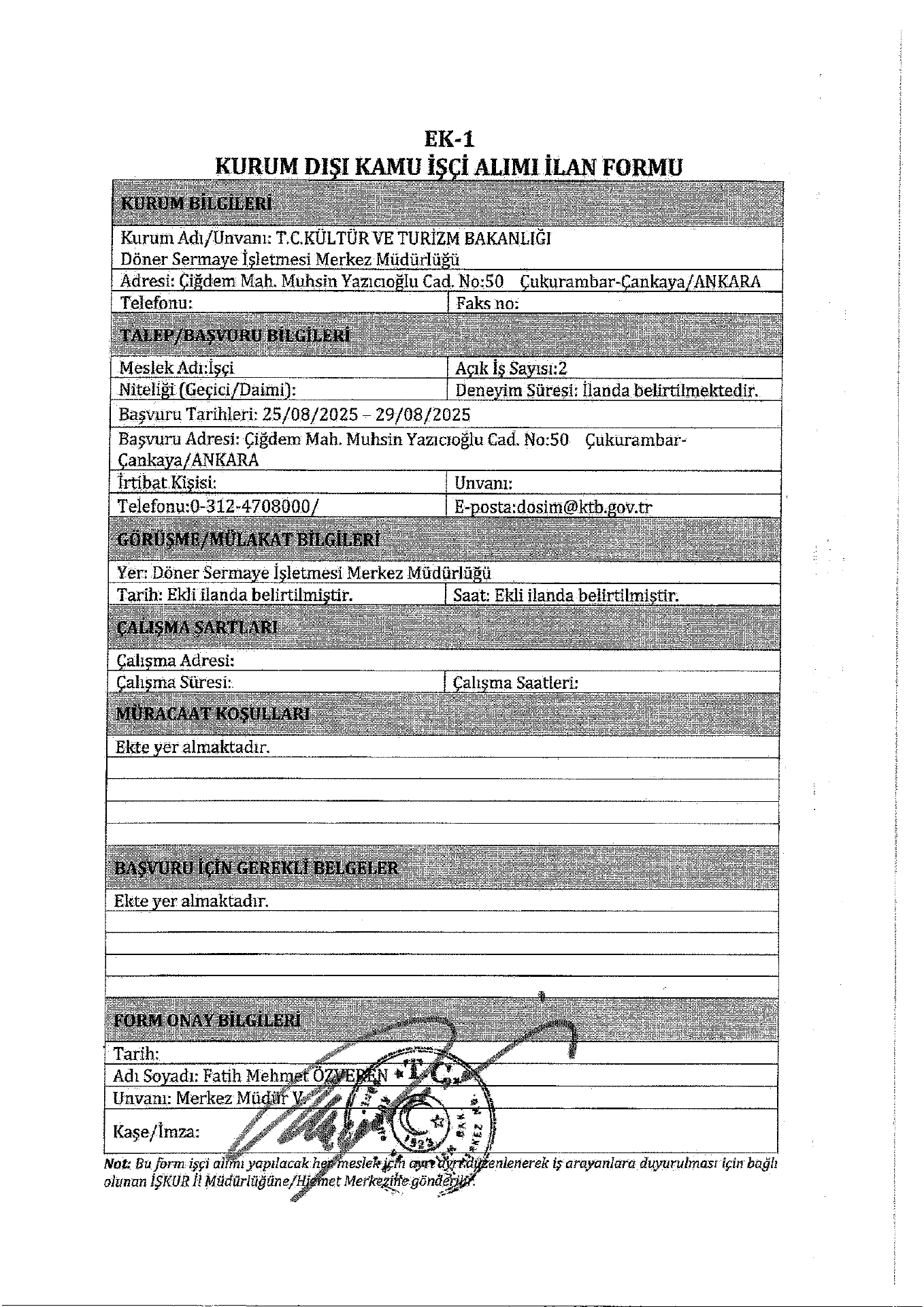 Kültür ve Turizm Bakanlığı 2 İşçi Alacak. Son başvuru tarihi 29 ağustos 2025