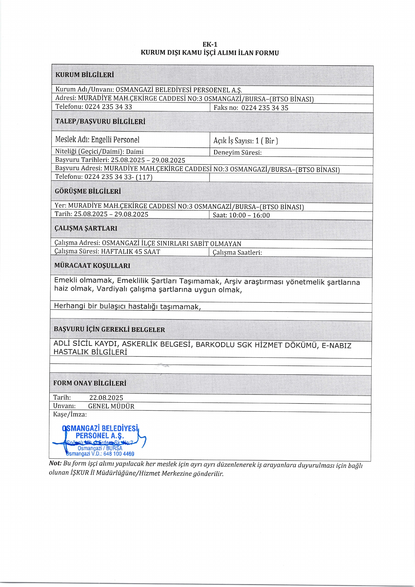 Bursa Osmangazi Belediyesi 1 Engelli İşçi Alacak. Son başvuru tarihi 29 ağustos 2025