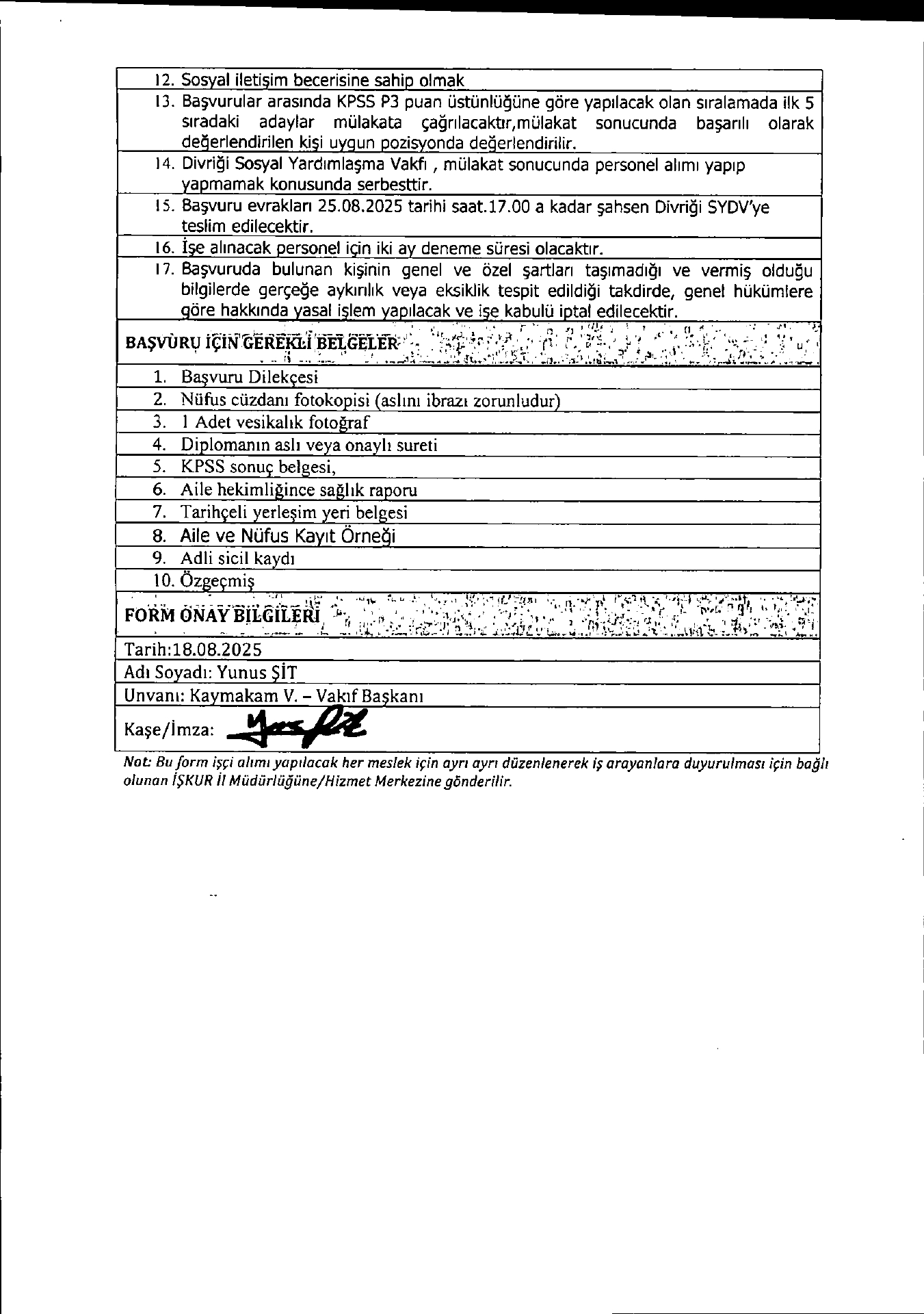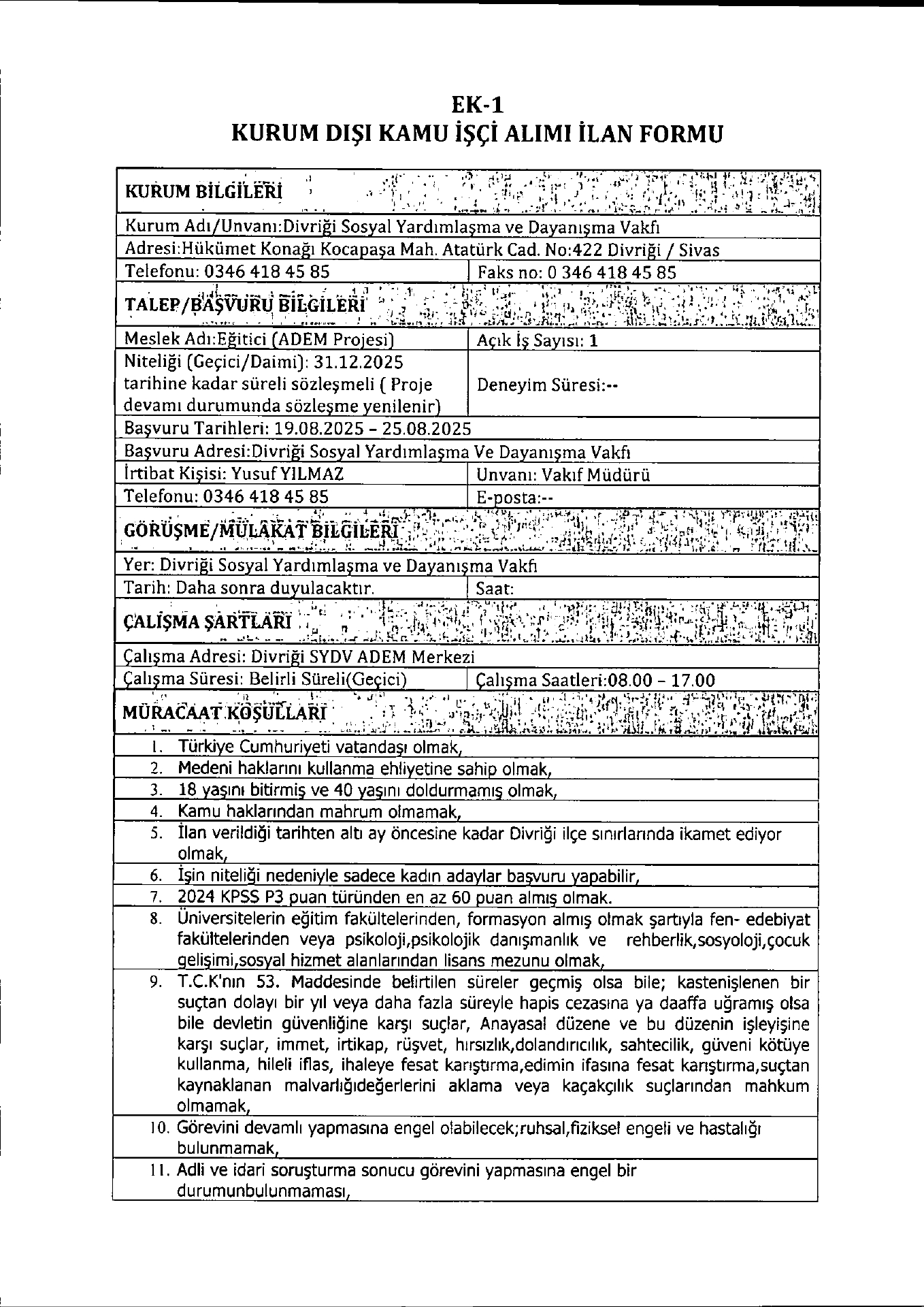 Sivas Divriği SYDV 1 İşçi Alacak. Son başvuru tarihi 25 ağustos 2025