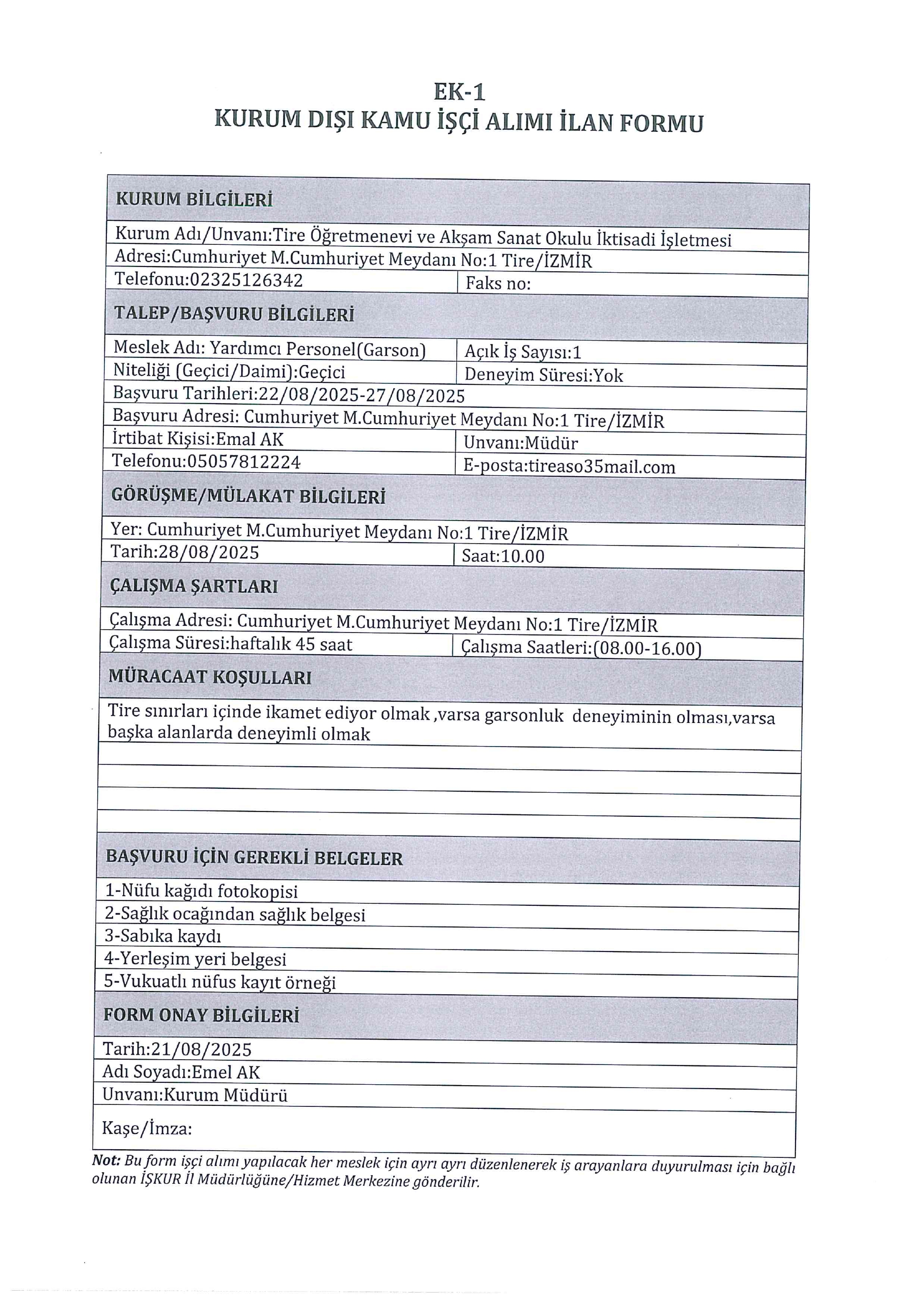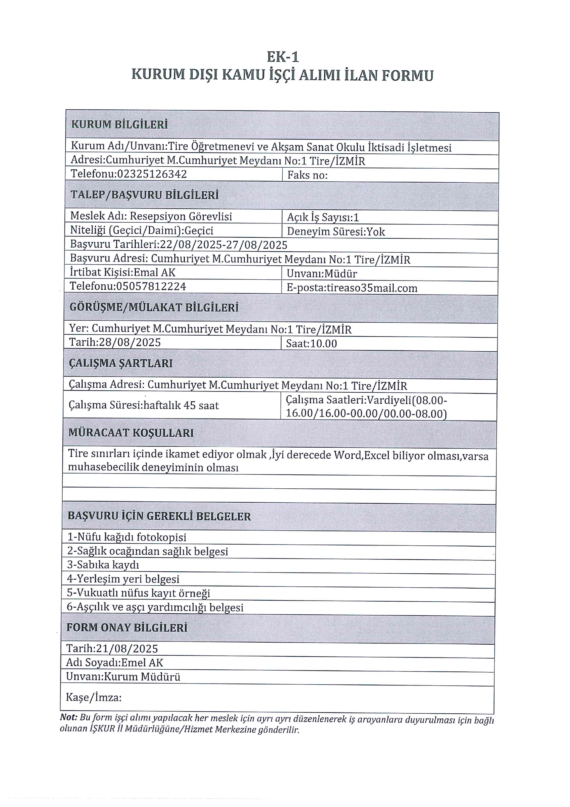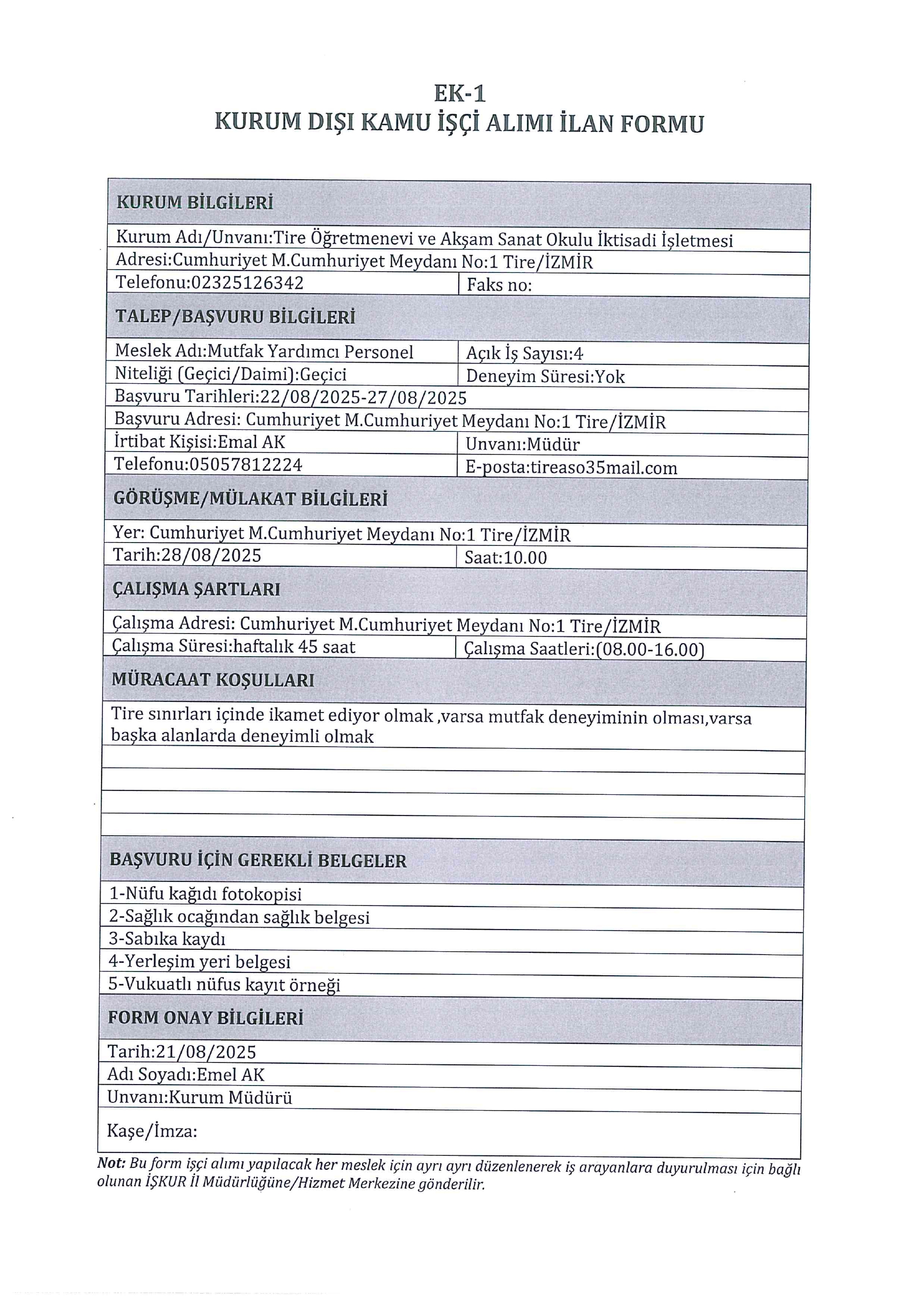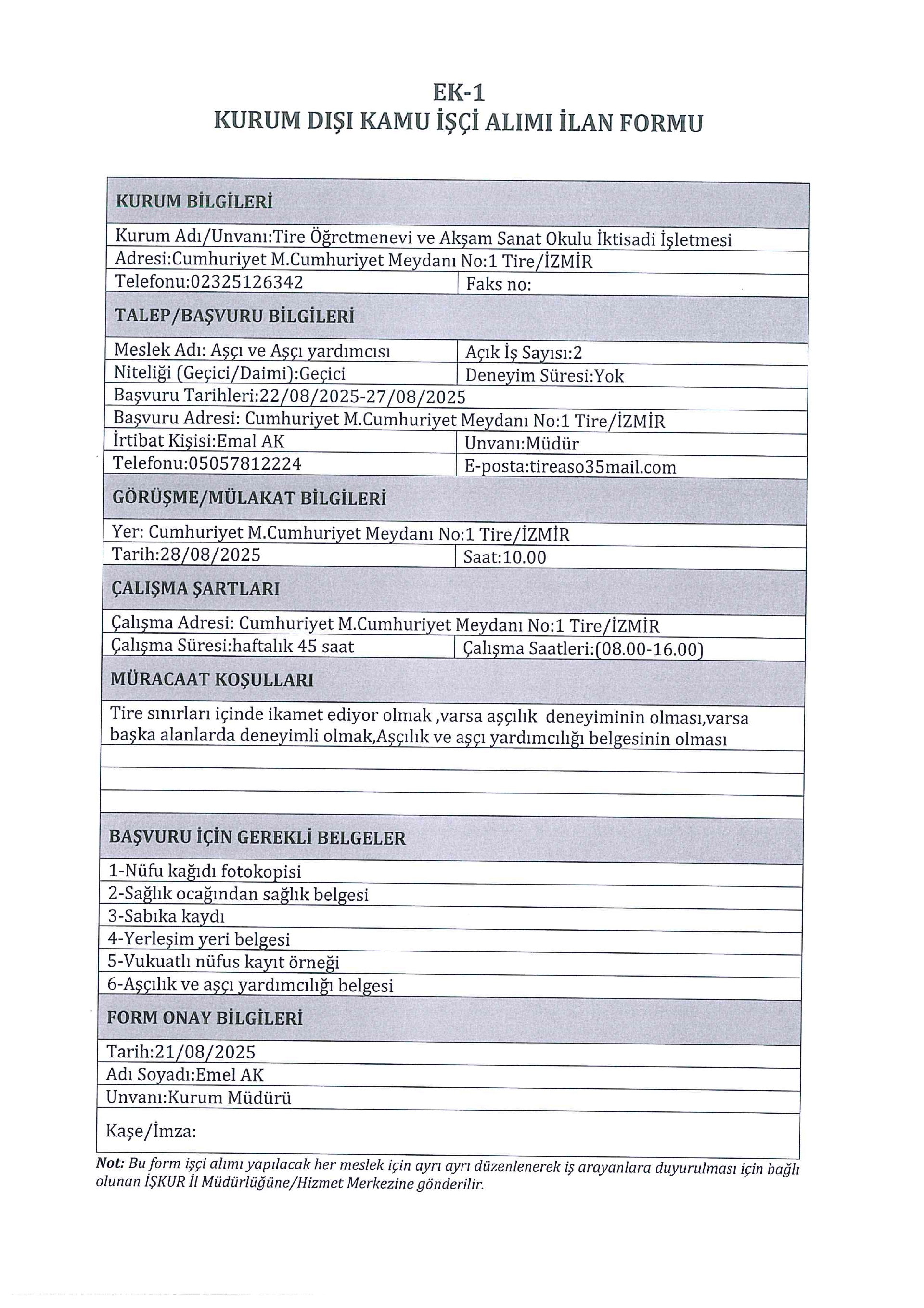 İzmir Tire Öğretmenevi Geçici 8 İşçi Alacak. Son başvuru tarihi 27 ağustos 2025