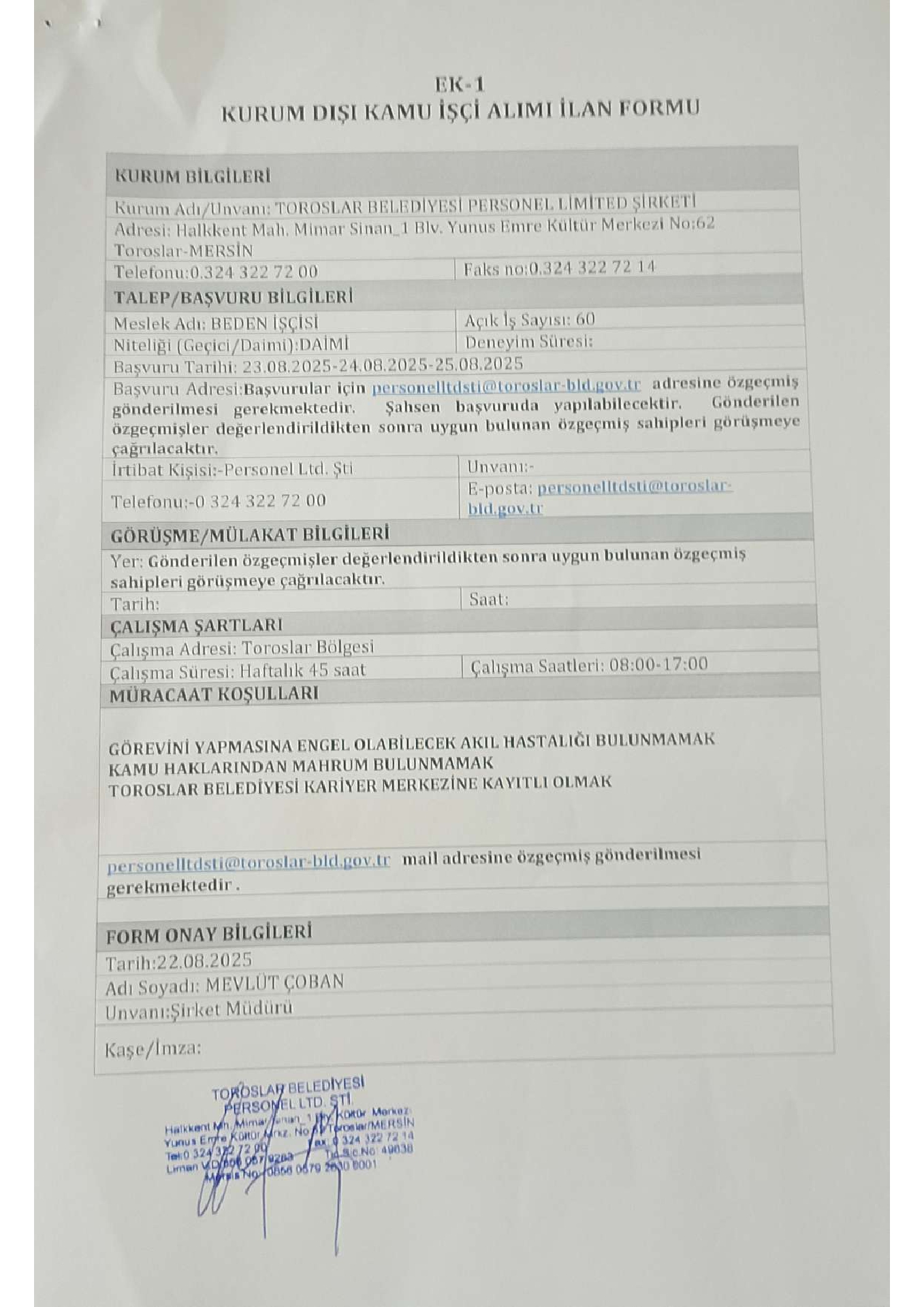 Mersin Toroslar Belediyesi 60 İşçi Alacak. Son başvuru tarihi 25 ağustos 2025