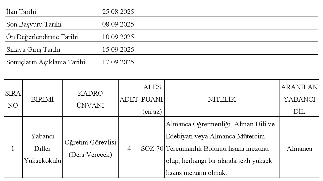 Üniversitemize "Öğretim Üyesi Dışındaki Öğretim Elemanı Kadrolarına Yapılacak Atamalarda Uygulanacak Merkezi Sınav ile Giriş Sınavlarına İlişkin Usul ve Esaslar Hakkında Yönetmelik" hükümleri uyarınca açıktan veya yeniden atama yoluyla, 2547 sayılı Kanunun 31. maddesi uyarınca Öğretim Görevlisi alınacaktır.