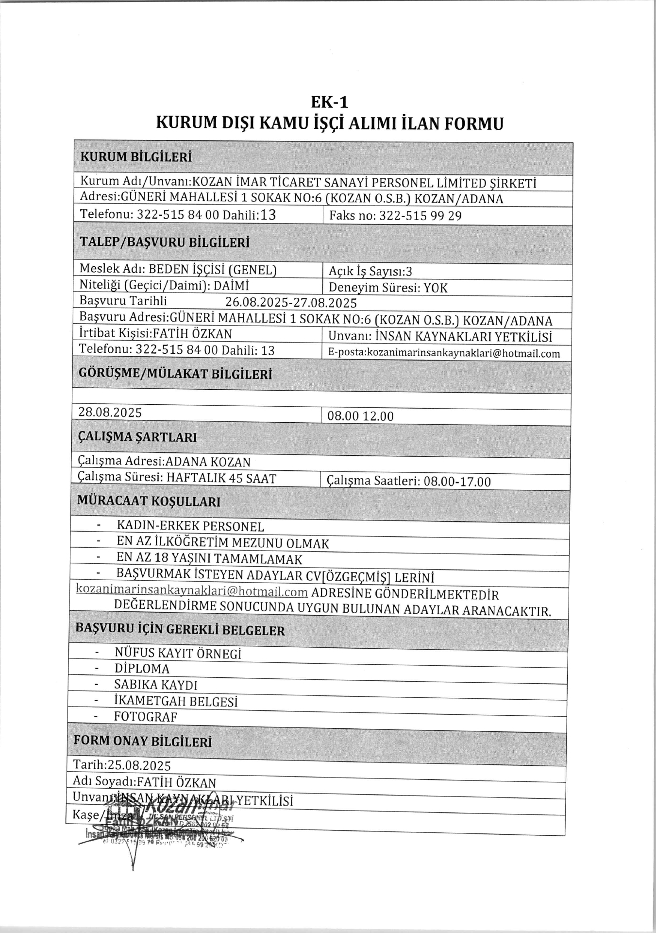 Adana Kozan İmar 3 İşçi Alacak. Son başvuru tarihi 27 ağustos 2025