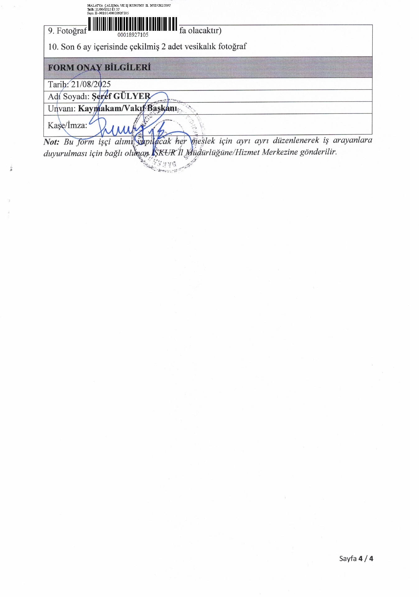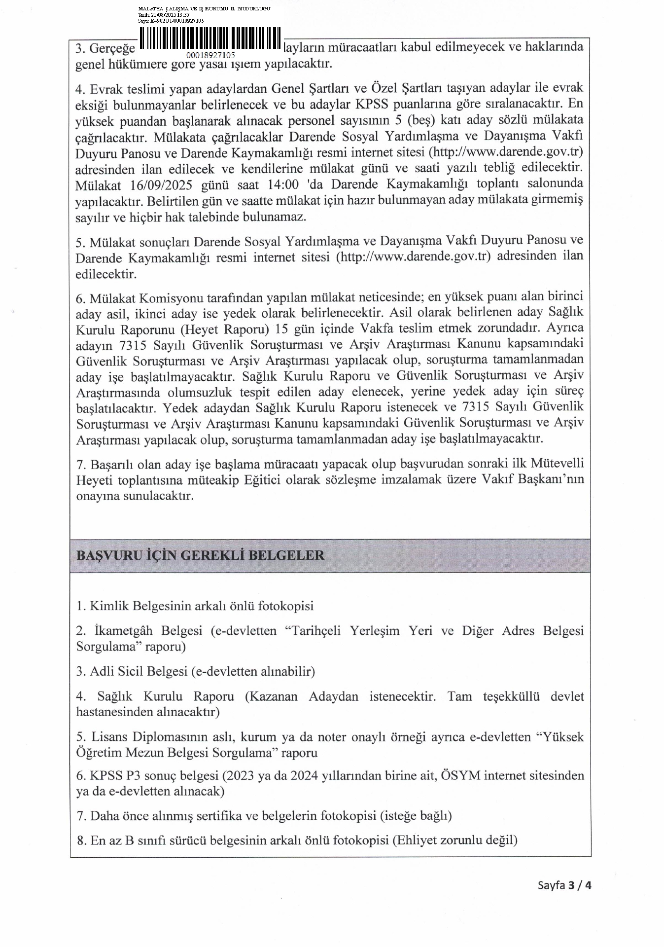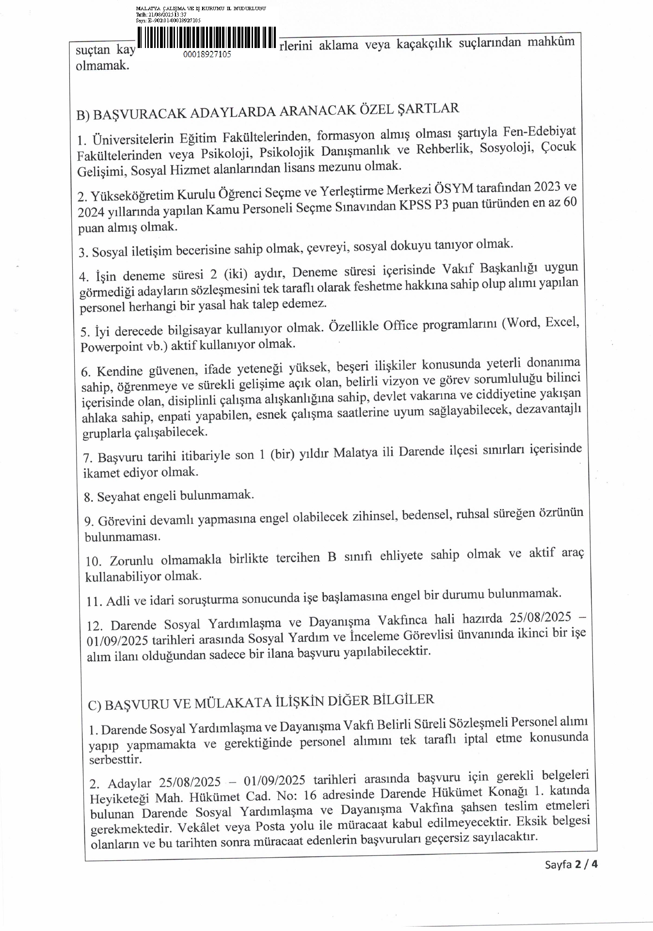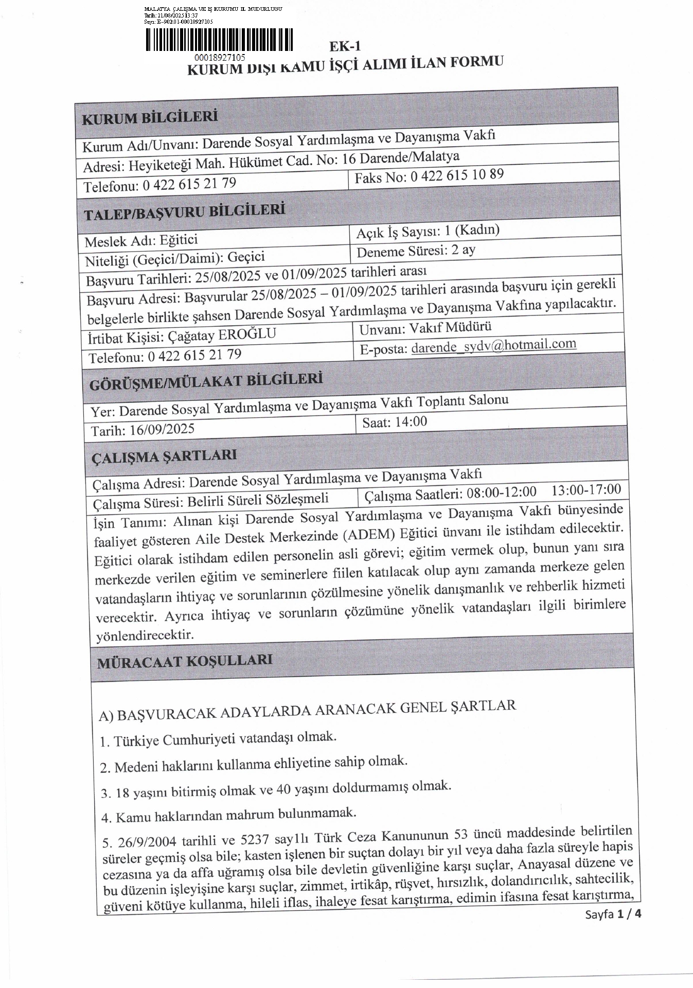 Malatya Derende SYDV Geçici 1 İşçi Alacak. Son başvuru tarihi 1 eylül 2025