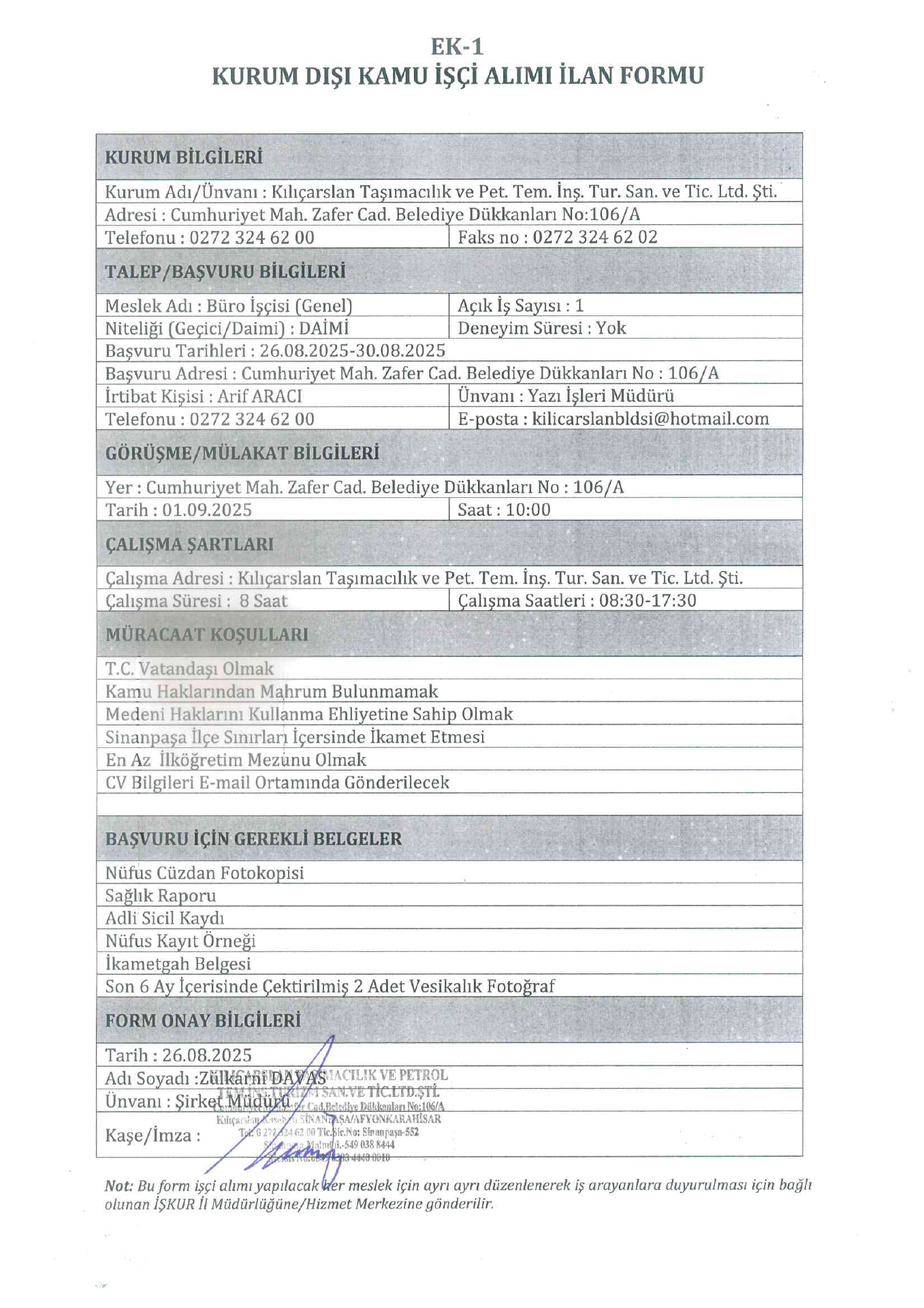 Afyonkarahisar Kılıçarslan Taşımacılık 1 İşçi Alacak. Son başvuru tarihi 30 Ağustos 2025