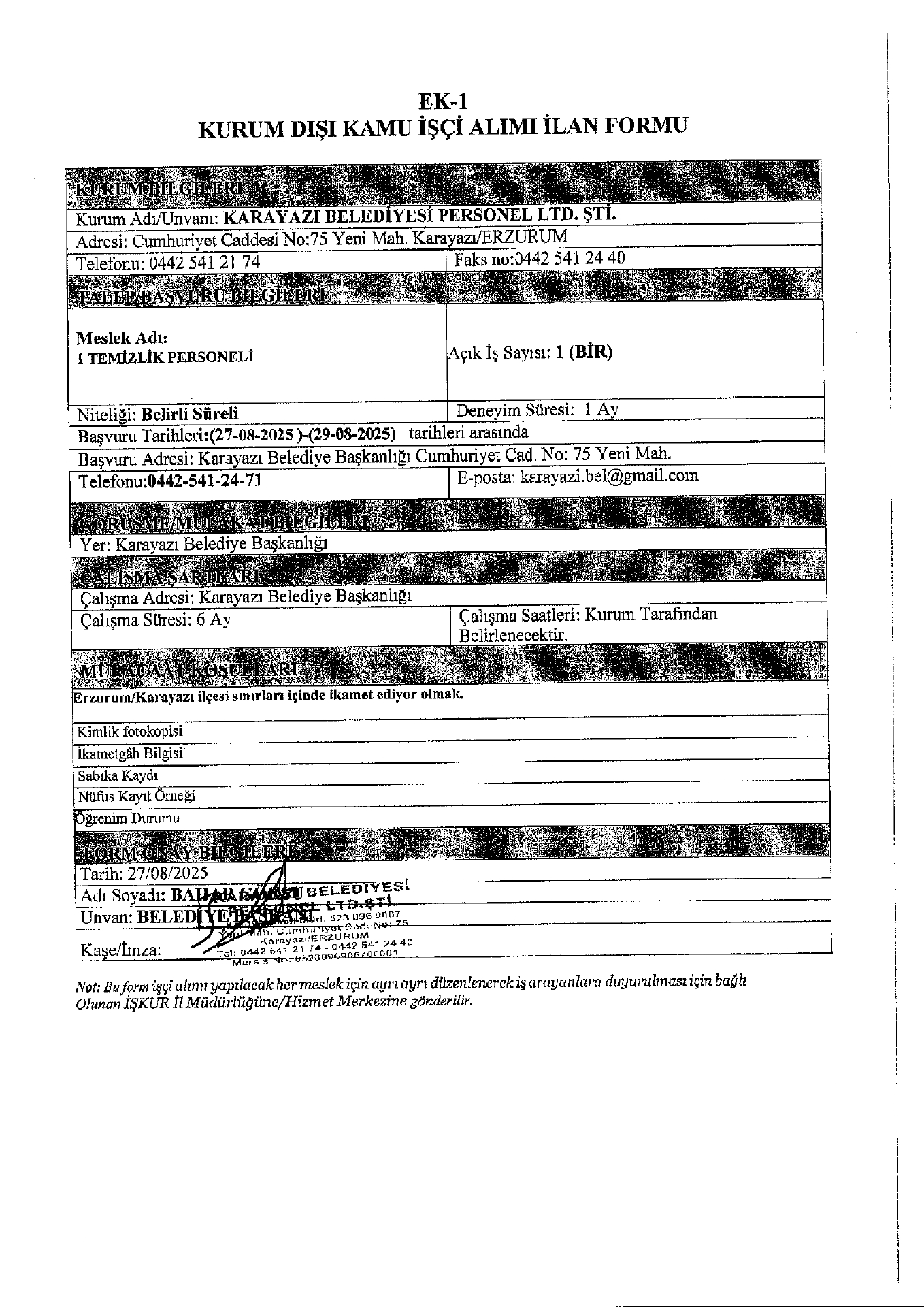 Erzurum Karayazı Belediyesi 1 İşçi Alacak. Son başvuru tarihi 29 ağustos 2025