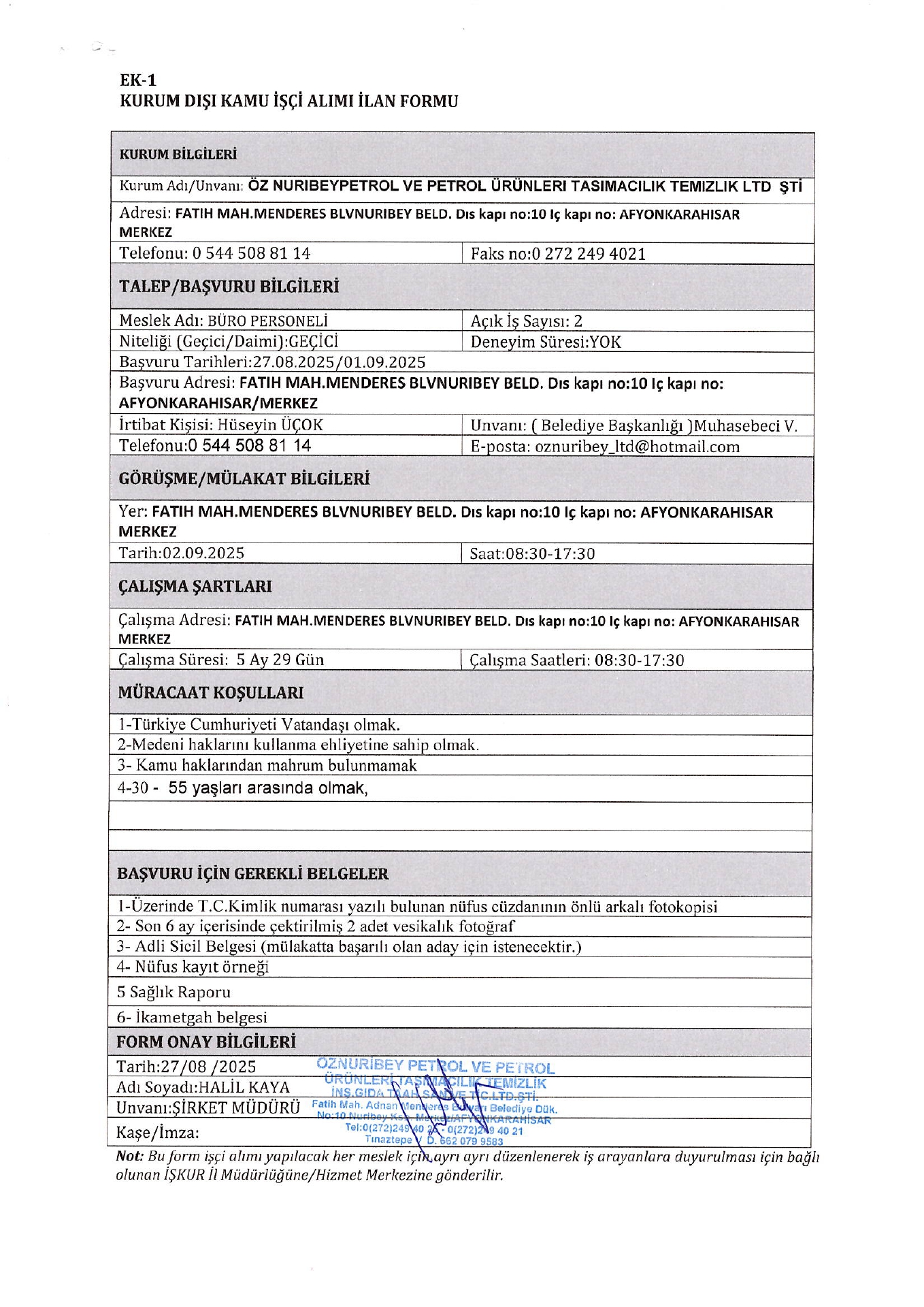Afyonkarahisar Öz Nuribey Petrol Geçici 2 İşçi Alacak. Son başvuru tarihi 1 eylül 2025