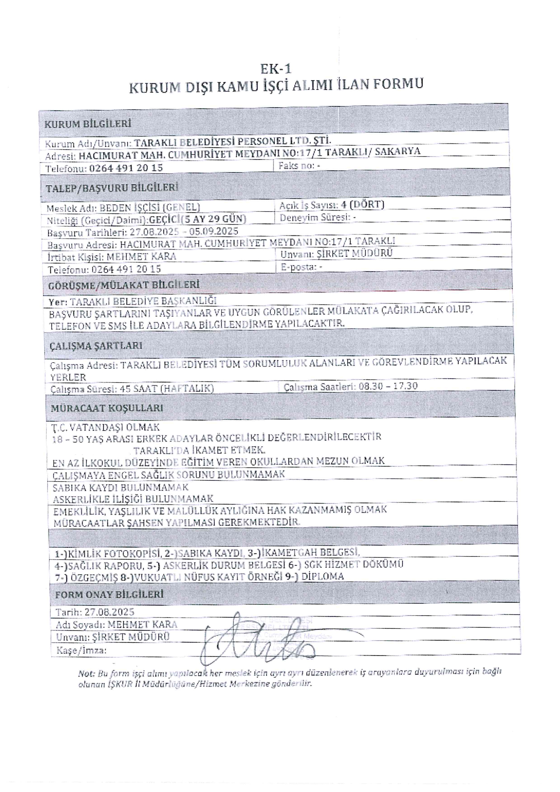 Sakarya Taraklı Belediyesi Geçici 4 İşçi Alacak. Son başvuru tarihi 5 eylül 2025