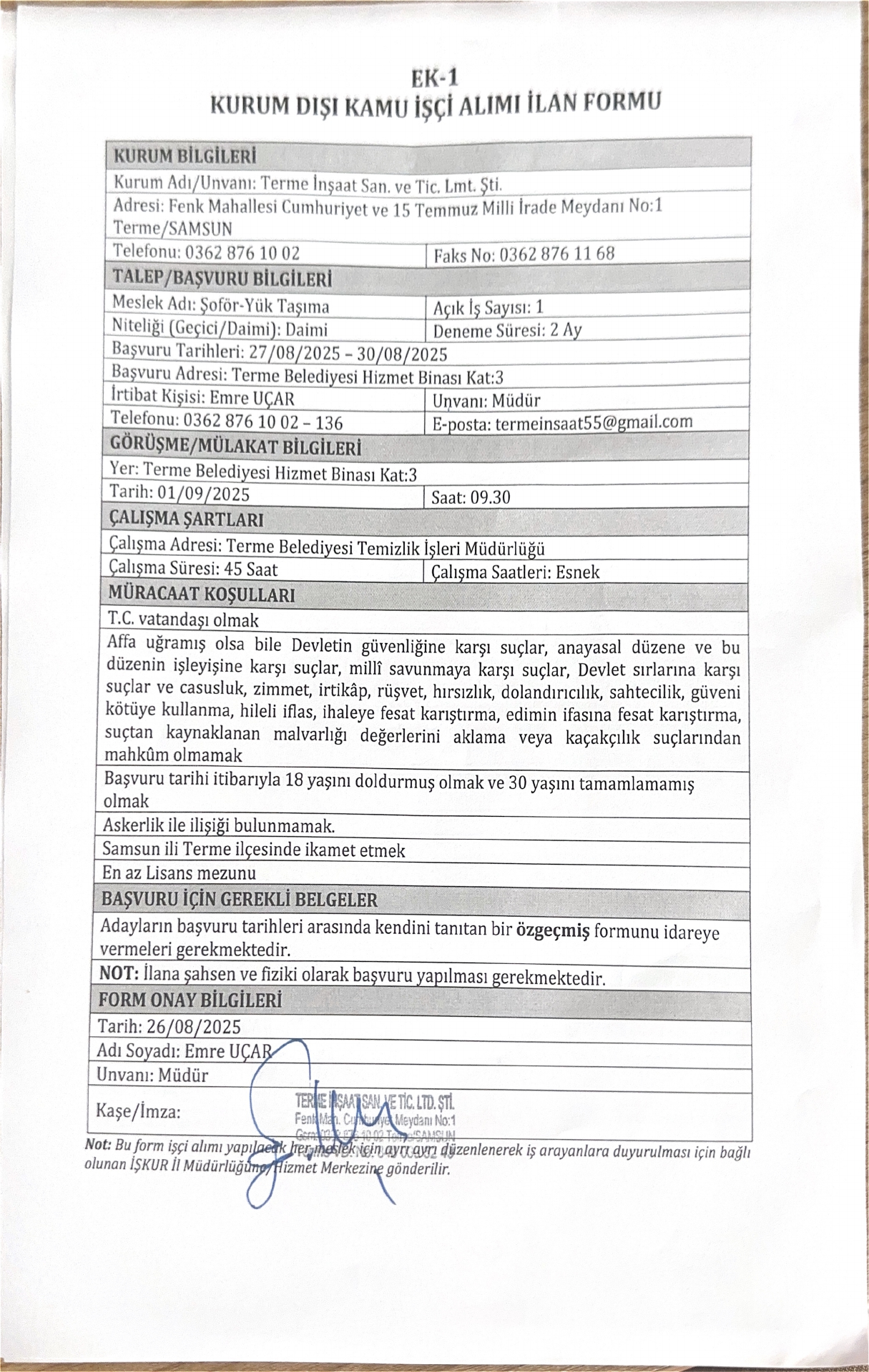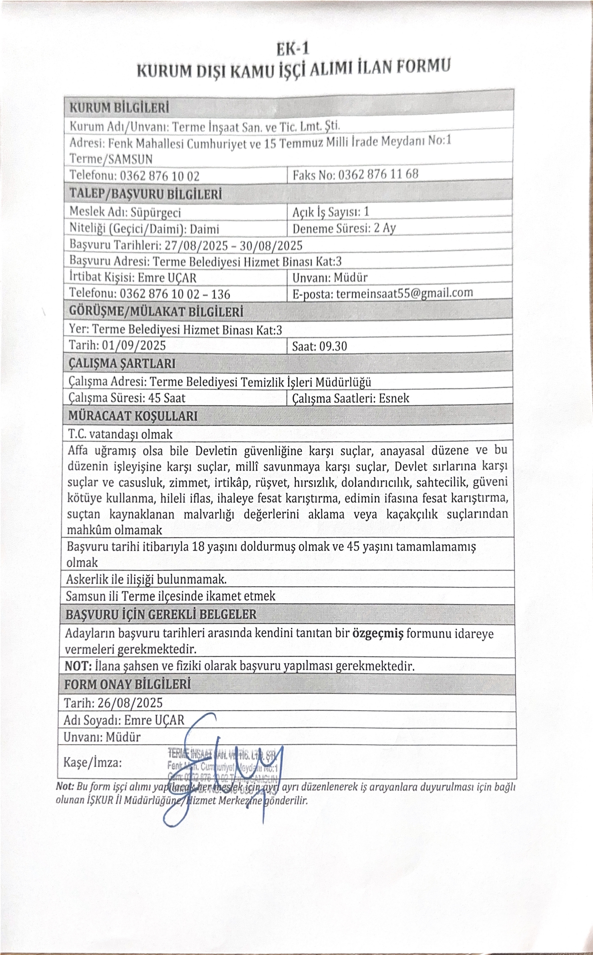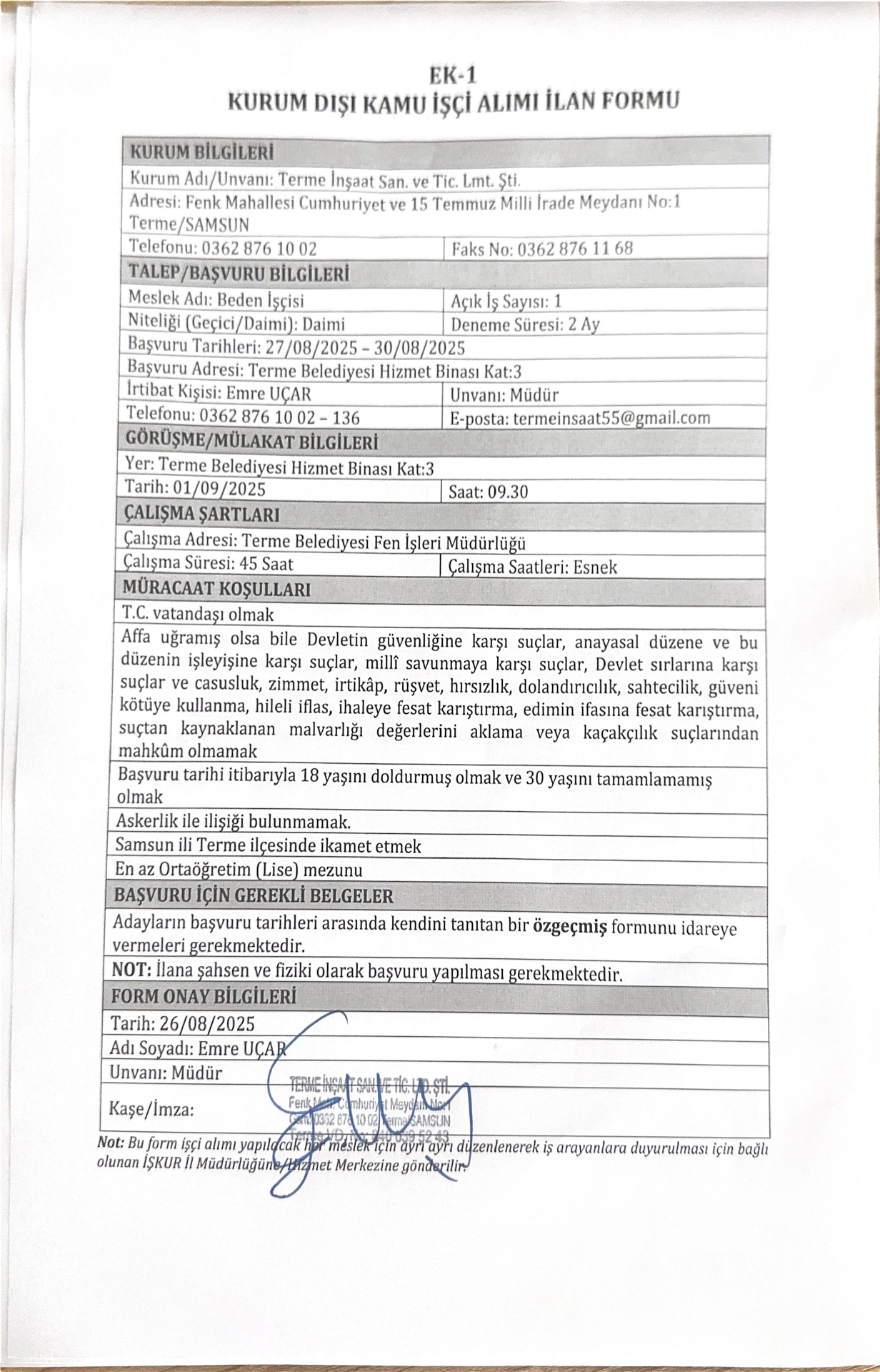 Samsun Terme İnşaat 3 İşçi Alacak. Son başvuru tarihi 30 ağustos 2025