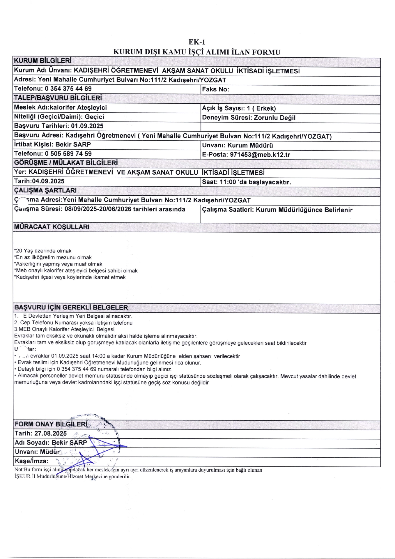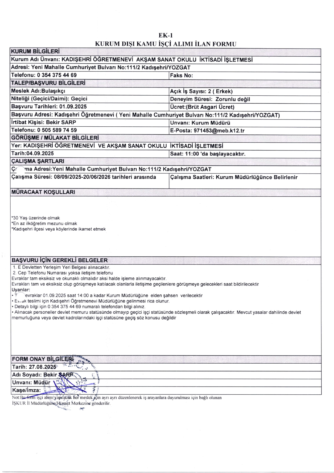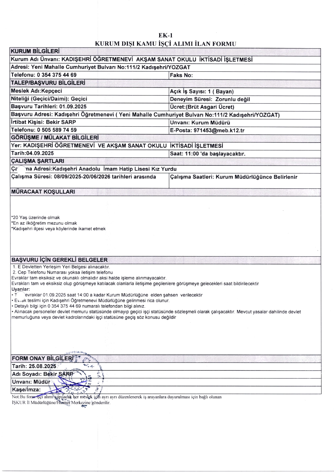 Yozgat Kadışehir Öğretmenevi Geçici 11 İşçi Alacak. Son başvuru tarihi 1 eylül 2025