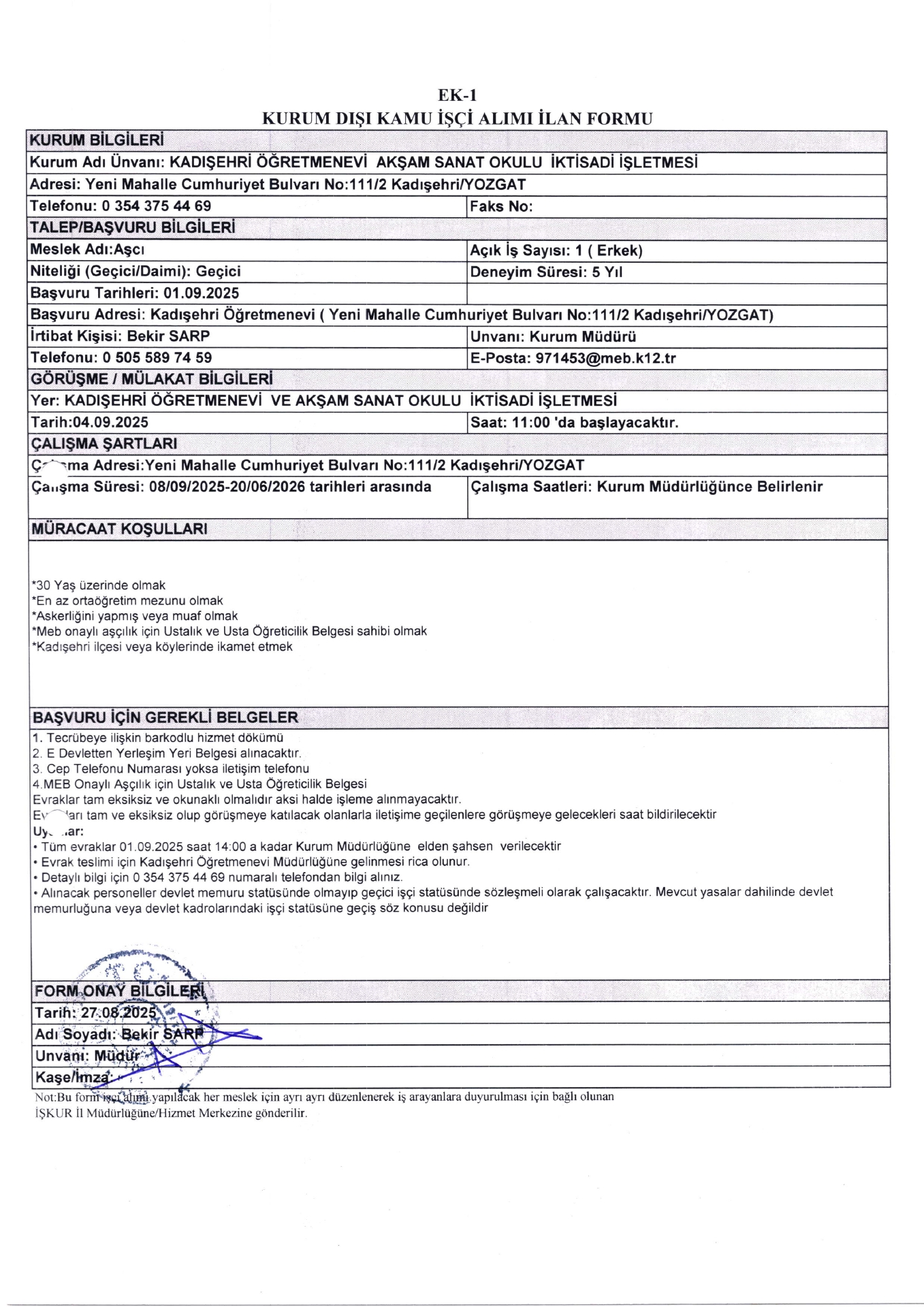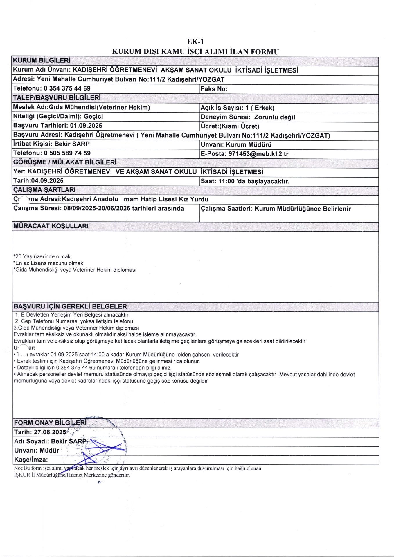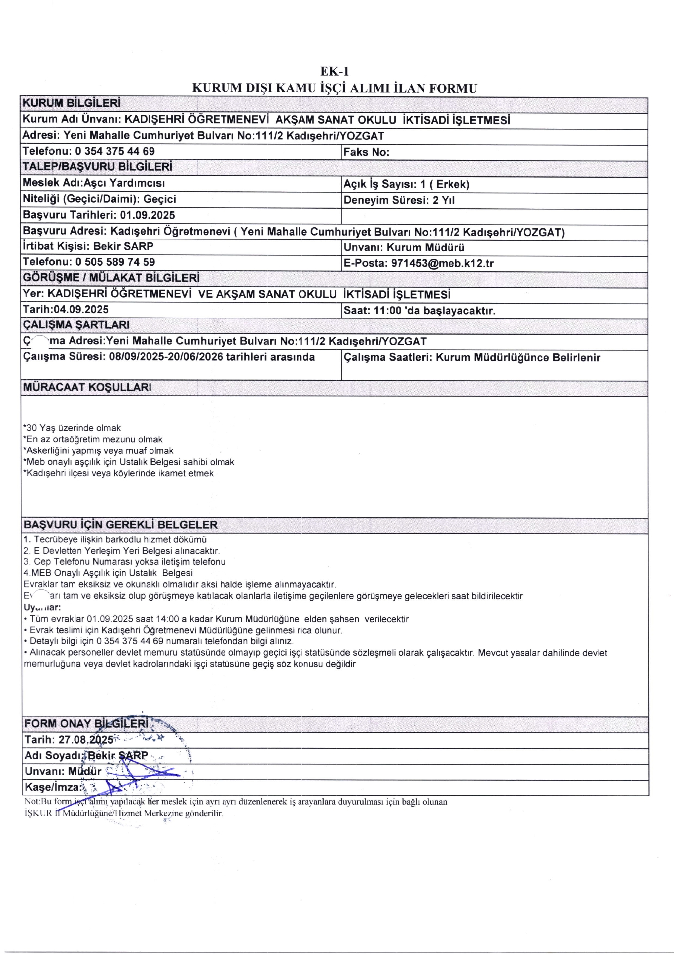 Yozgat Kadışehir Öğretmenevi Geçici 11 İşçi Alacak. Son başvuru tarihi 1 eylül 2025