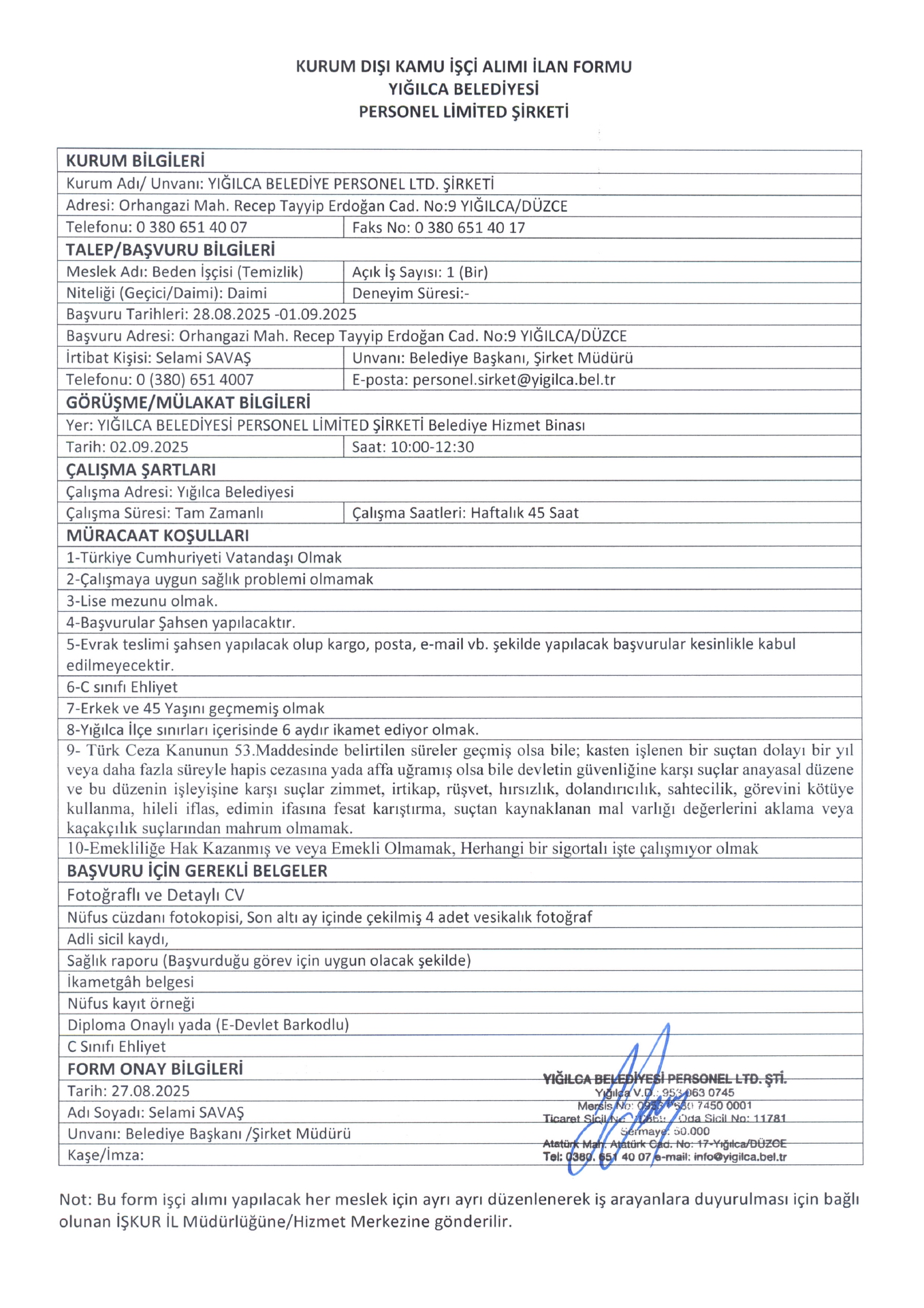 Düzce Yığılca Belediyesi 1 İşçi Alacak. Son başvuru tarihi 1 eylül 2025