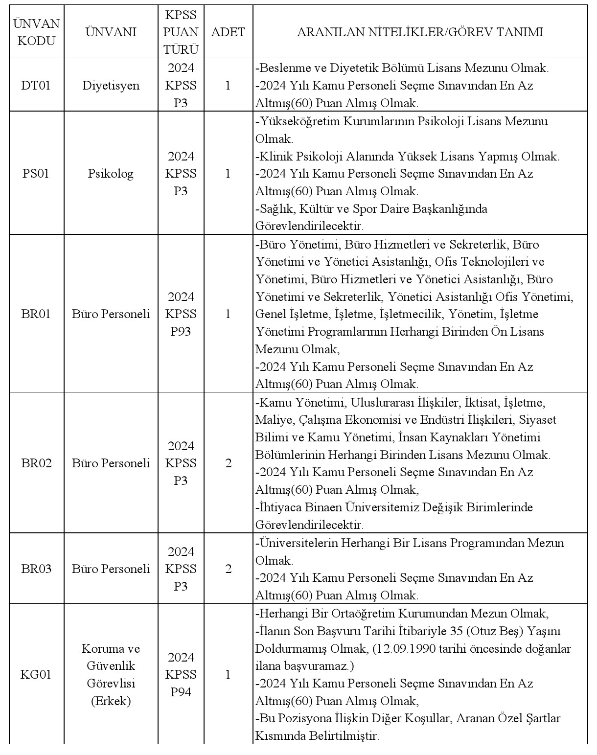 Üniversitemize bağlı birimlerde çalıştırılmak ve giderleri özel bütçeden karşılanmak kaydıyla, 657 sayılı Devlet Memurları Kanunu'nun 4'üncü maddesinin (B) fıkrası uyarınca istihdam edilmek üzere, 06.06.1978 tarihli ve 7/15754 sayılı Bakanlar Kurulu Kararı ile yürürlüğe konulan "Sözleşmeli Personel Çalıştırılmasına İlişkin Esaslar"da yer alan Ek-2'inci maddenin (b) fıkrası gereğince yazılı ve/veya sözlü sınav yapılmaksızın, KPSS (B) grubu puan sıralaması esas alınmak suretiyle aşağıda belirtilen pozisyonlara sözleşmeli personel alınacaktır.