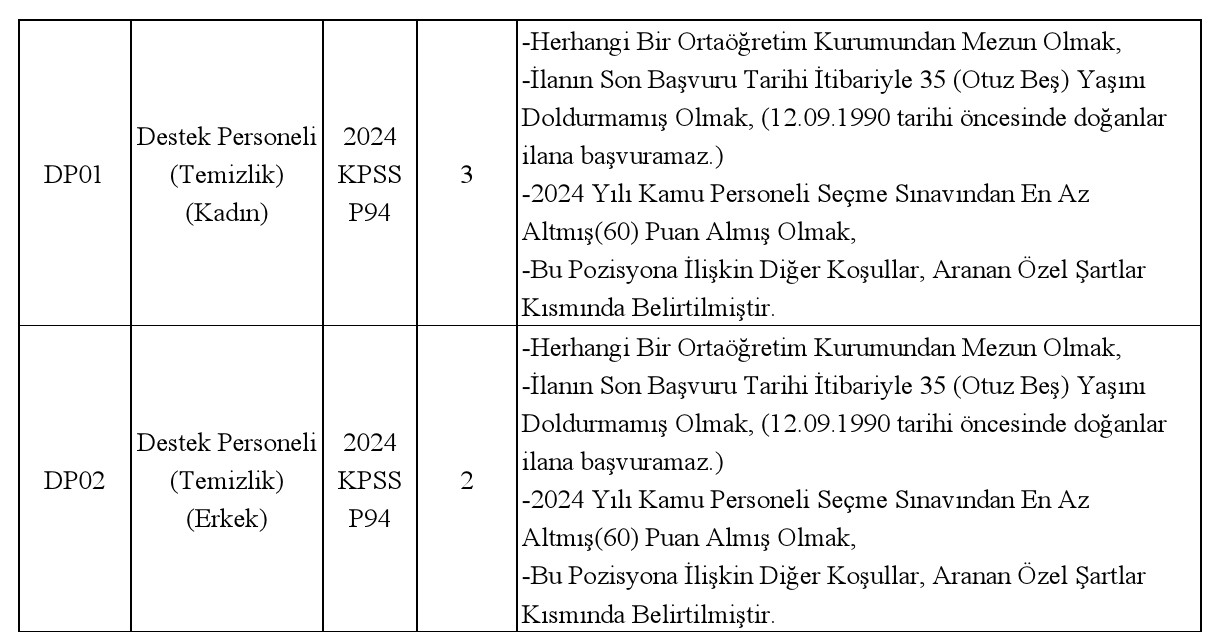 DESTEK PERSONELİ POZİSYONU İÇİN ARANAN ÖZEL ŞARTLAR