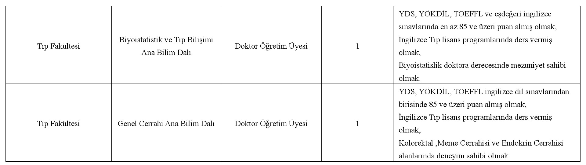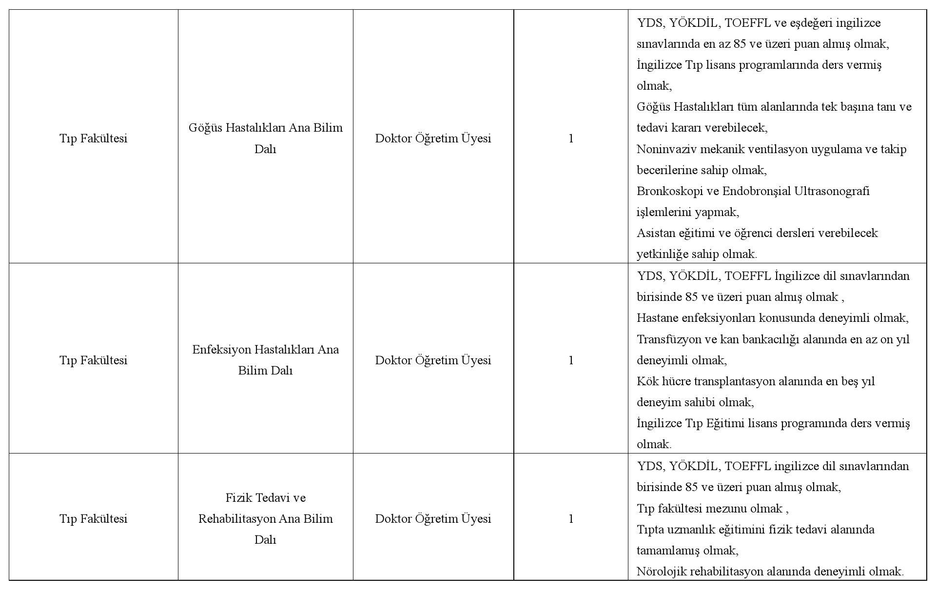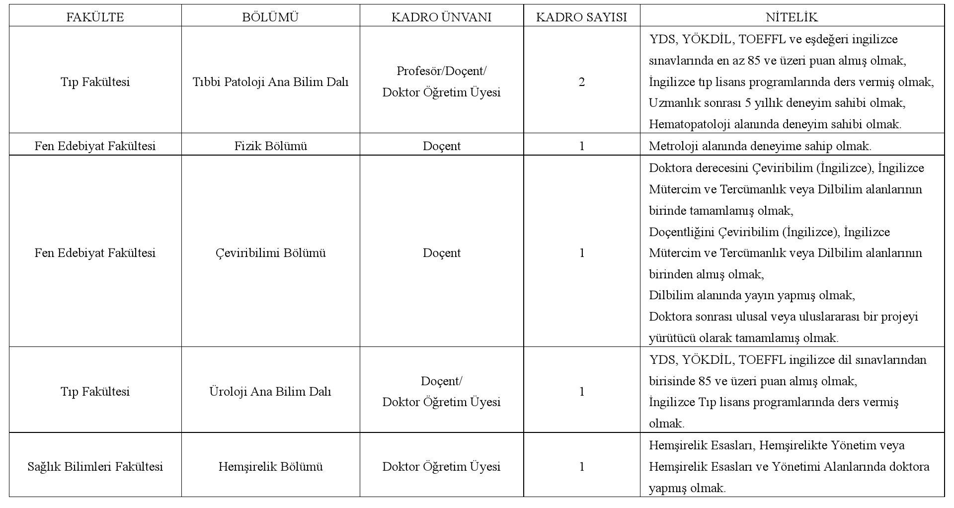 Üniversitemizin aşağıda belirtilen birimlerinde açık bulunan Profesör, Doçent ve Doktor Öğretim Üyesi kadrolarına 2547 sayılı Yükseköğretim Kanununun 26., 24. ve 23. maddesi ile Öğretim Üyeliğine Yükseltilme ve Atanma Yönetmeliğinin ilgili maddeleri hükümlerine göre tam zamanlı statüde Öğretim Üyeleri alınacaktır.