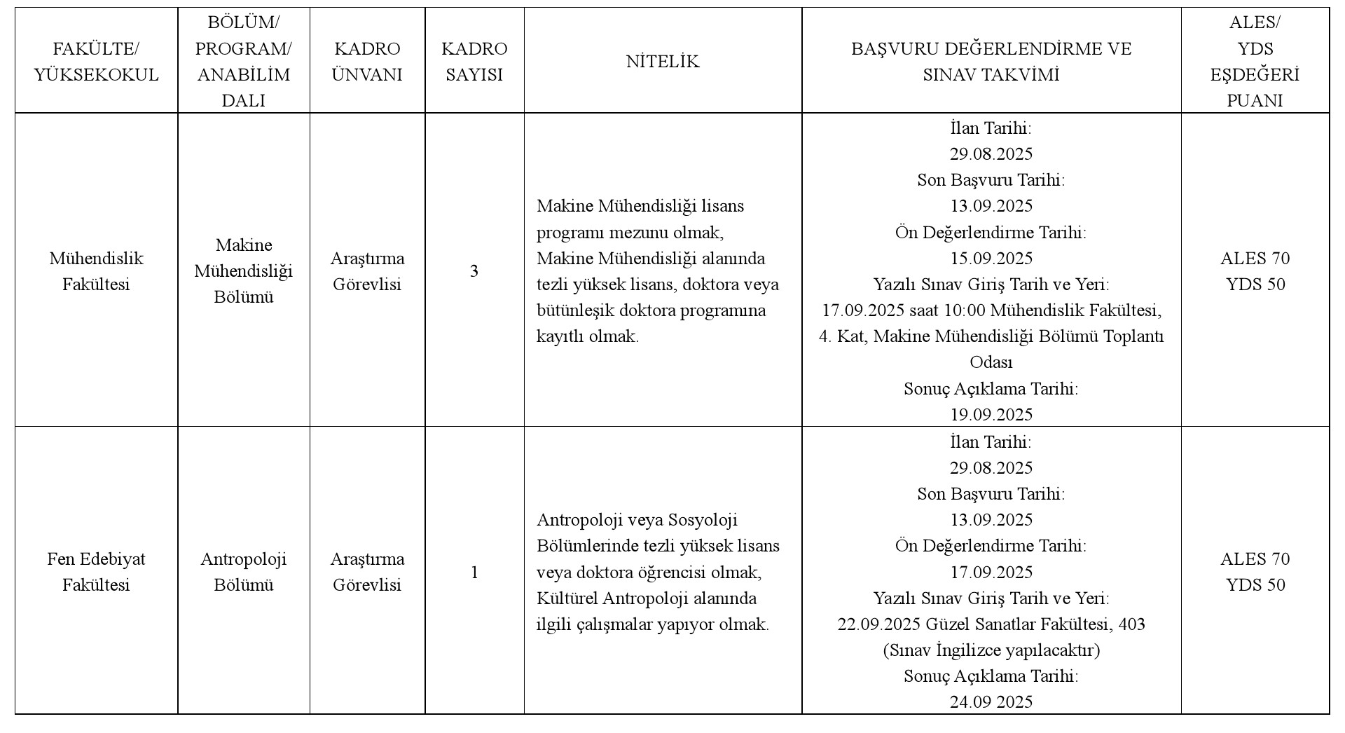 Üniversitemize 2547 sayılı Yükseköğretim Kanunu'nun 31. maddesi ile 09 Kasım 2018 tarihli, 30590 sayılı Resmi Gazete'de yayımlanan ve "Öğretim Üyesi Dışındaki Öğretim Elemanı Kadrolarına Yapılacak Atamalarda Uygulanacak Merkezi Sınav ile Giriş Sınavlarına İlişkin Usul ve Esaslar Hakkında Yönetmelik'in ilgili maddeleri uyarınca ünvanı ve nitelikleri belirtilen kadrolara Öğretim Elemanları alınacaktır.
