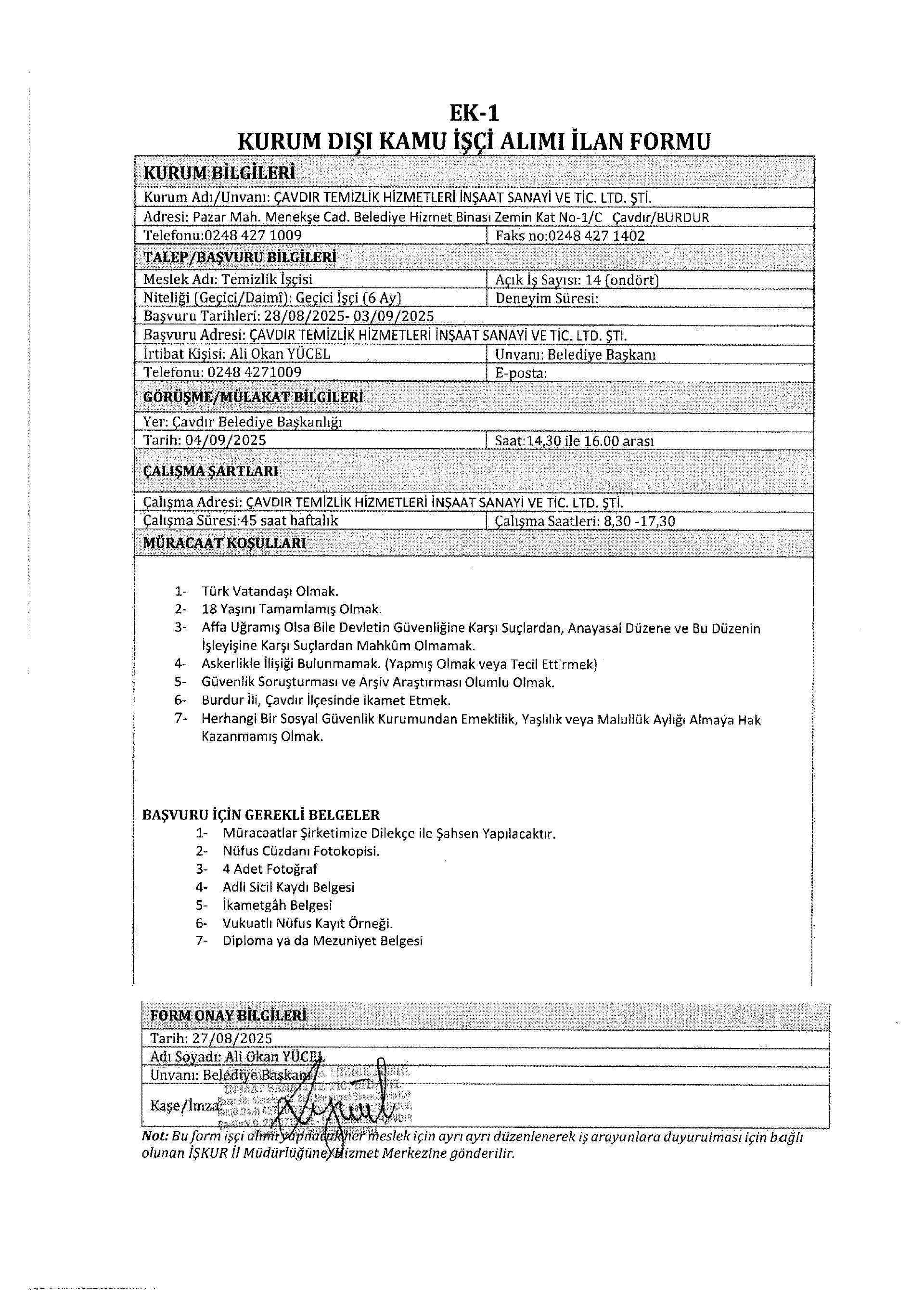 Burdur Çavdır Temizlik Geçici 14 İşçi Alacak. Son başvuru tarihi 3 eylül 2025