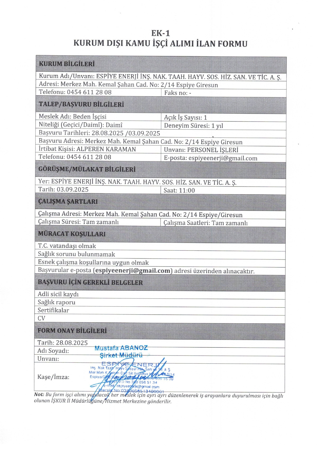 Giresun Espiye Enerji 1 İşçi Alacak. Son başvuru tarihi 3 eylül 2025