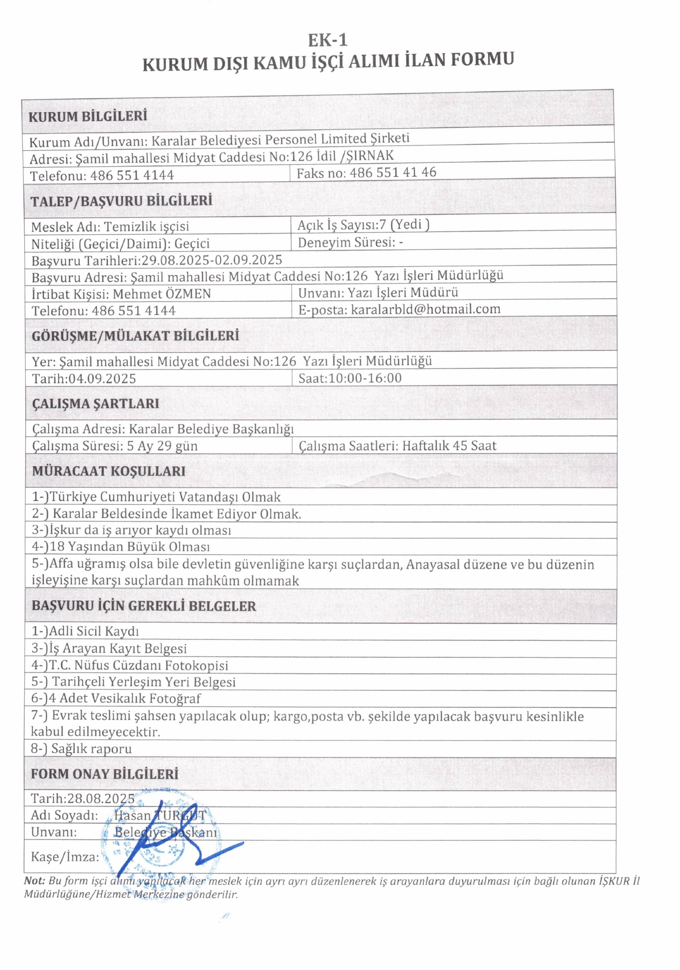 Şırnak Karalar Belediyesi Geçici 7 İşçi Alacak. Son başvuru tarihi 2 eylül 2025