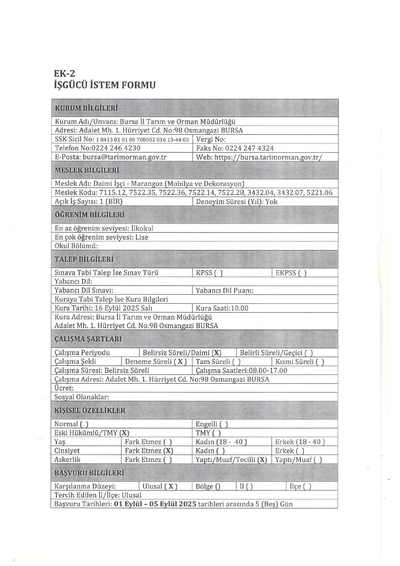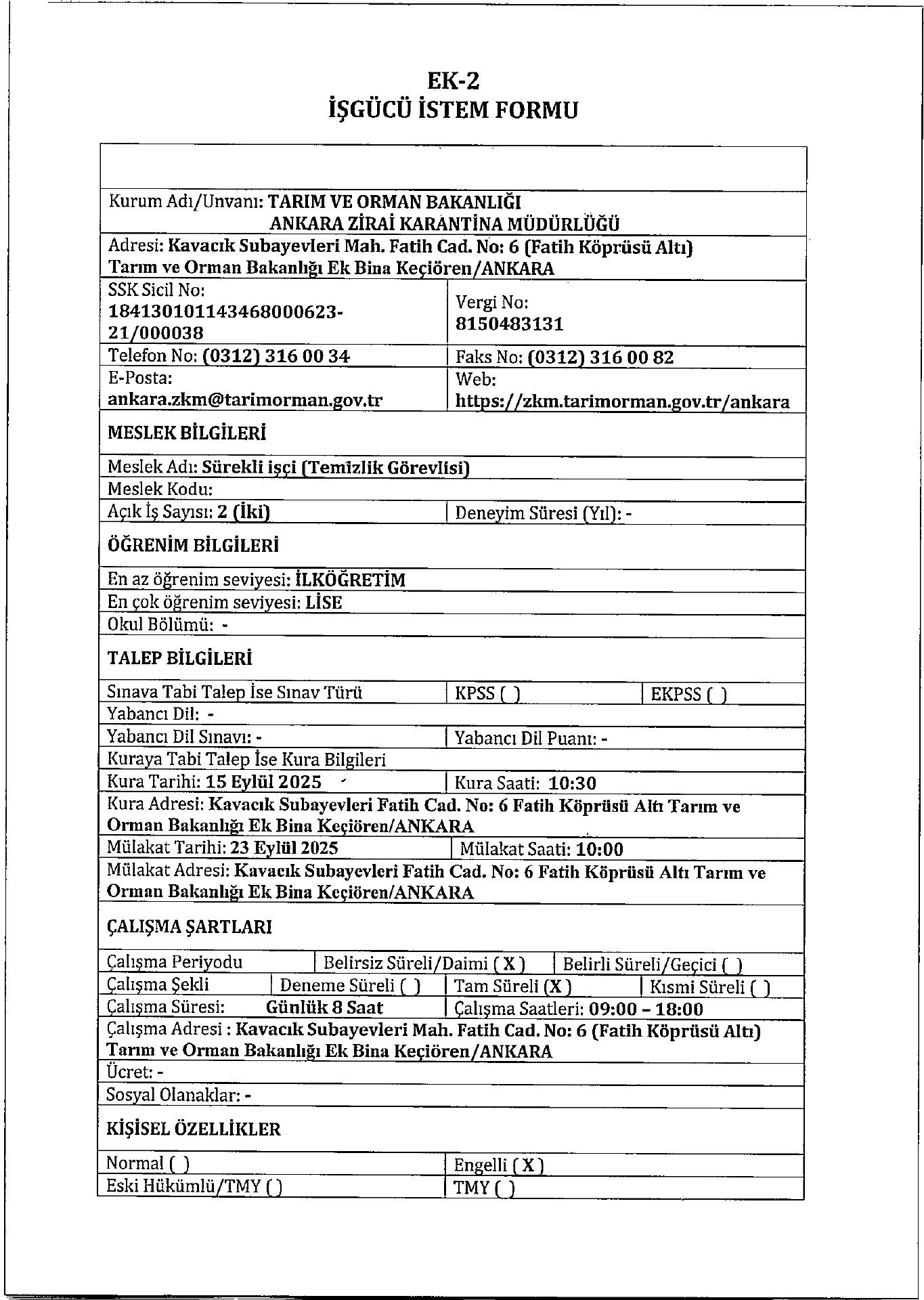 Tarım ve Orman Bakanlığı 3 Engelli ve Eski Hükümlü İşçi Alacak. Son başvuru tarihi5 eylül 2025