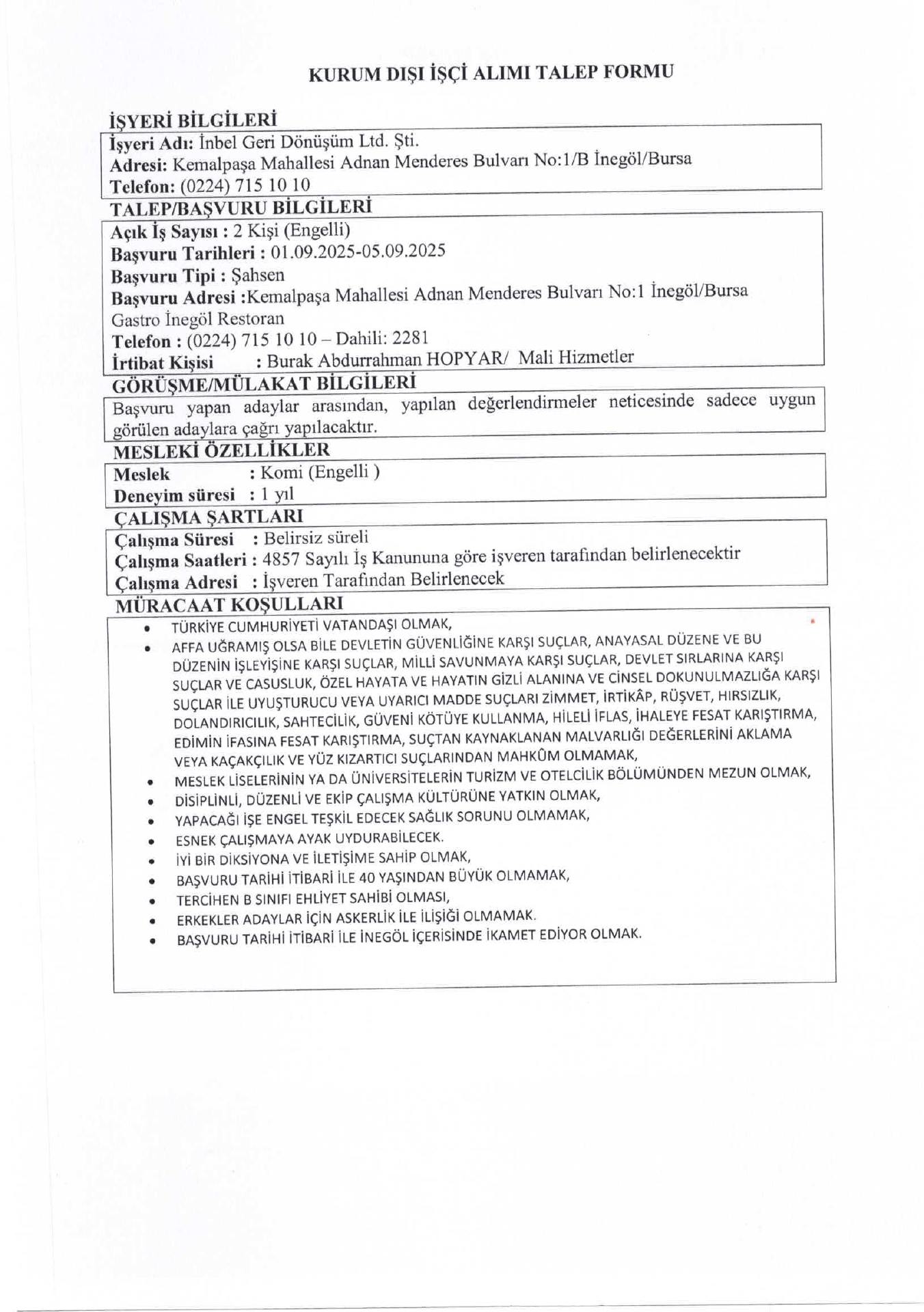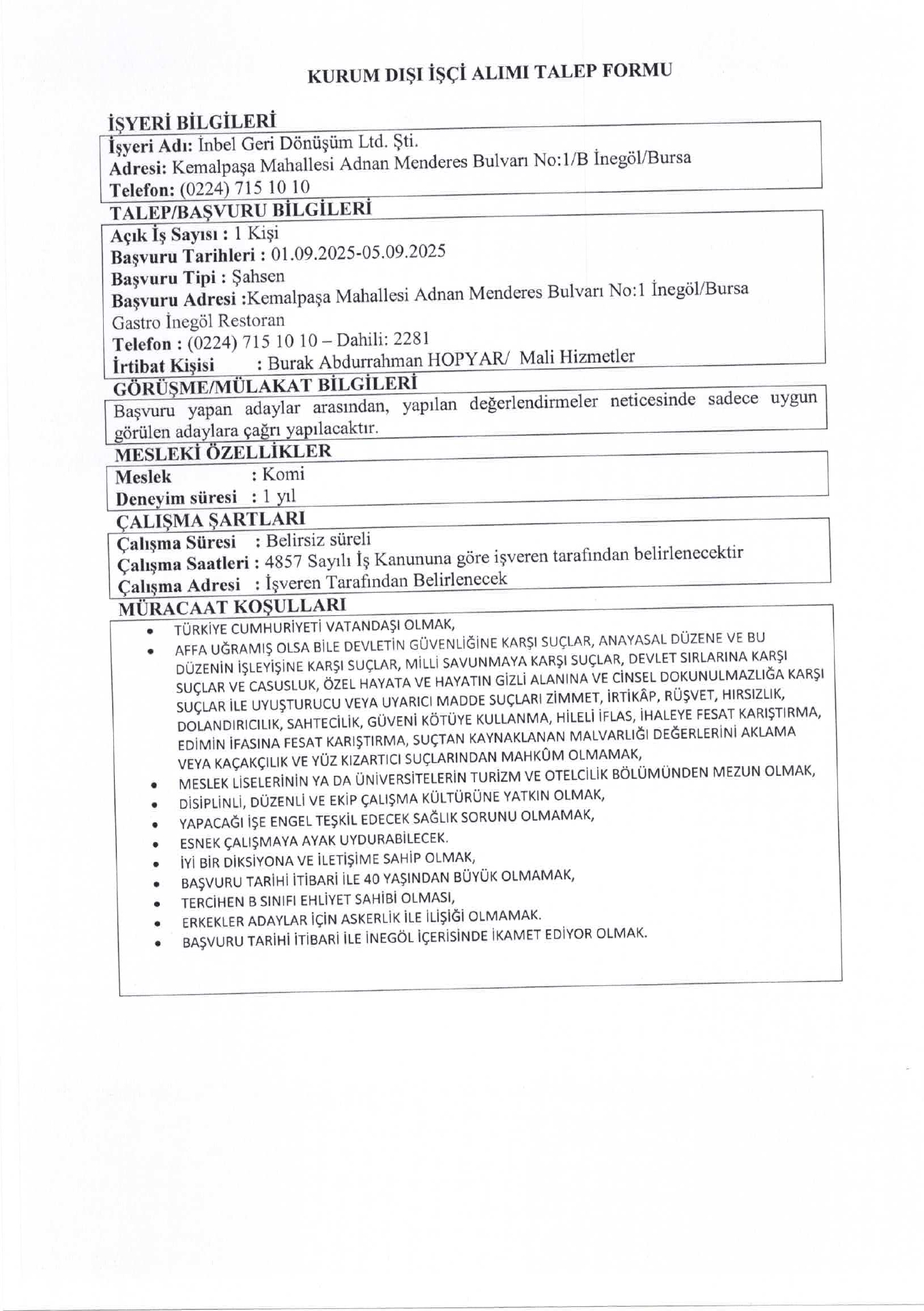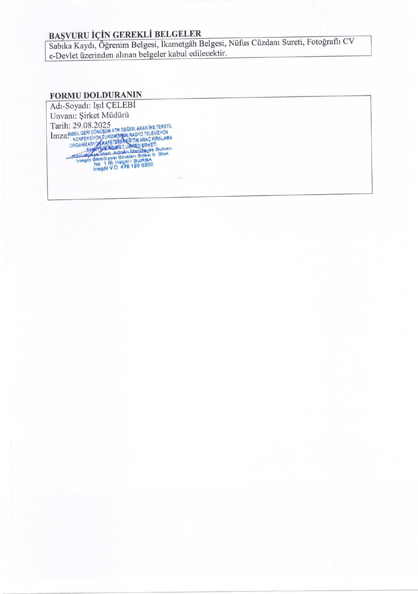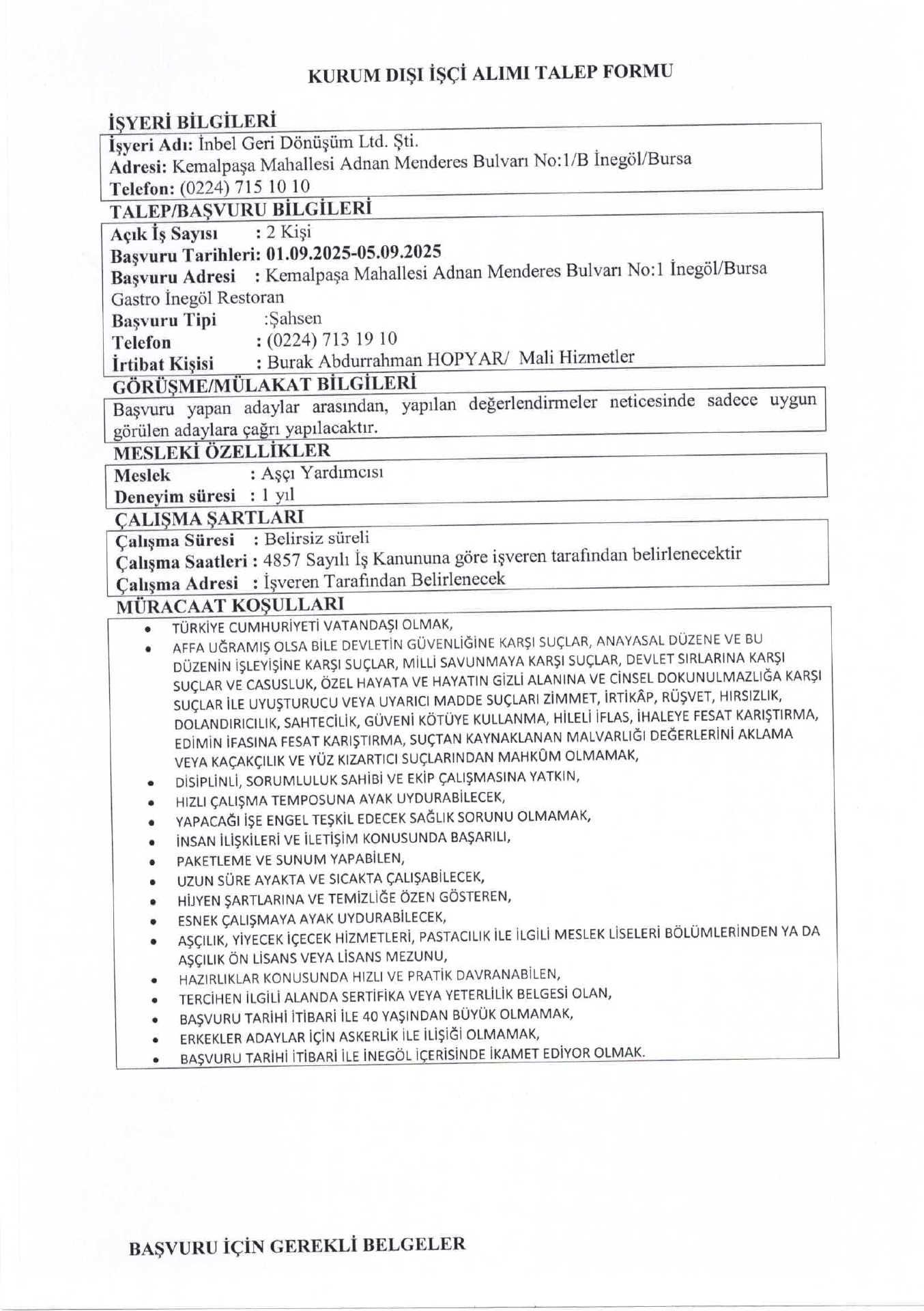 Bursa İnbel 5 İşçi Alacak. Son başvuru tarihi 5 eylül 2025