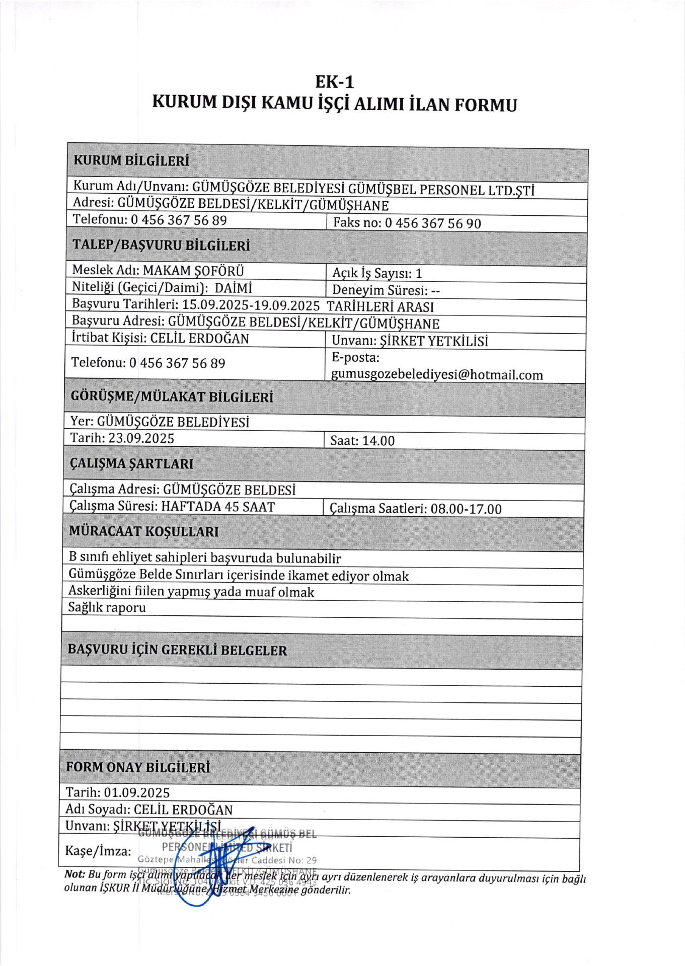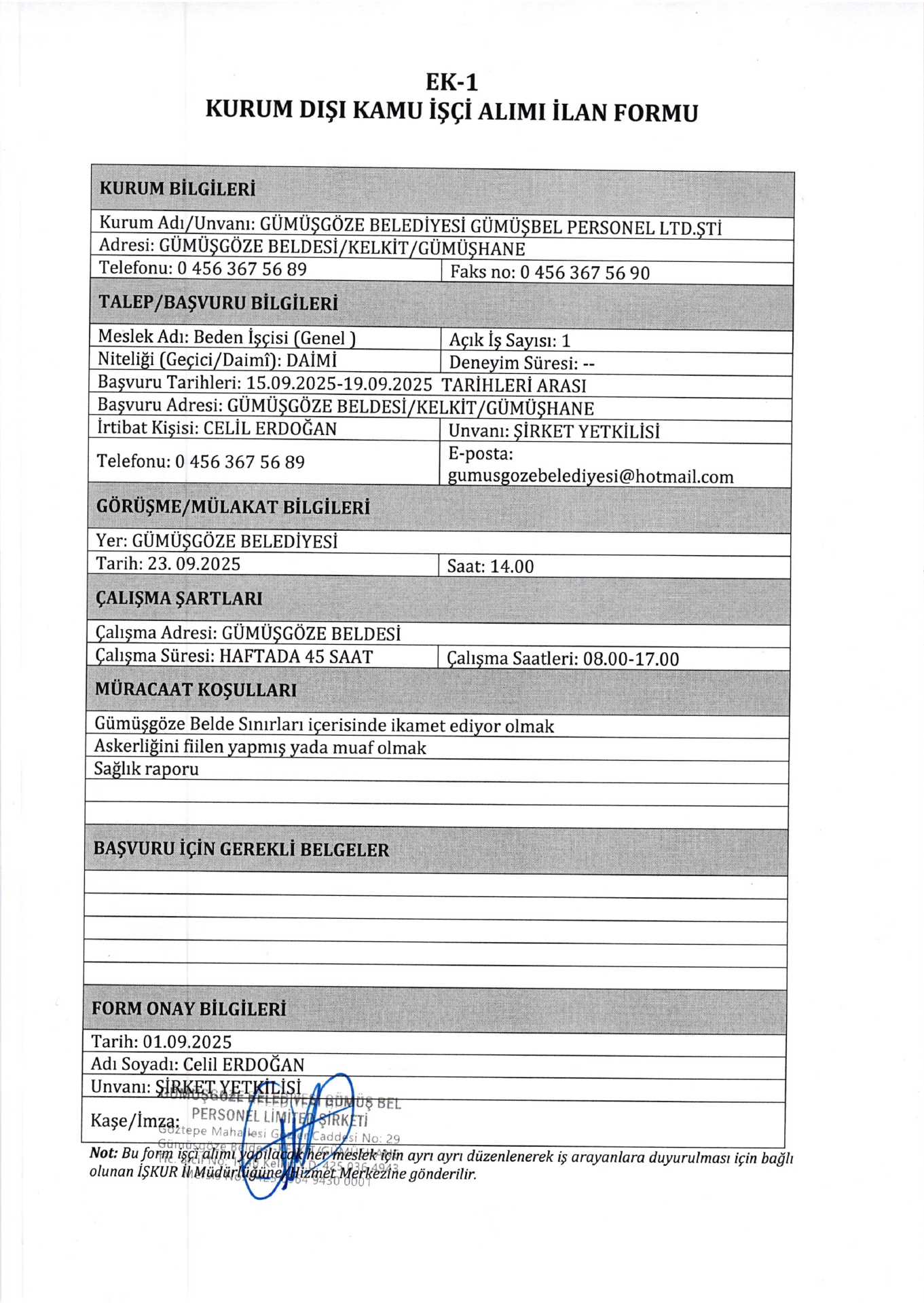 Gümüşhane Gümüşgöze Belediyesi 2 İşçi Alacak. Son başvuru tarihi 19 eylül 2025