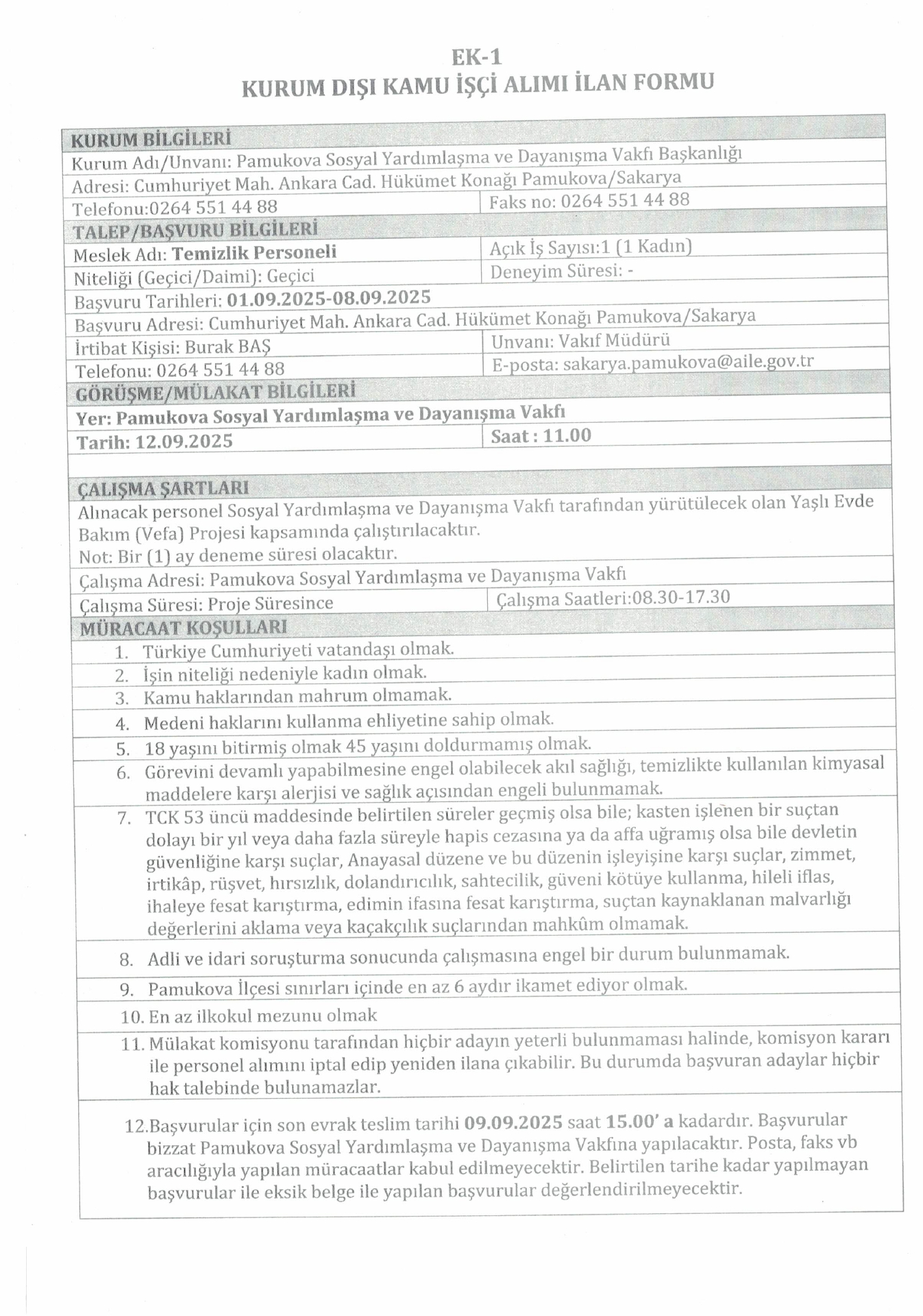 Sakarya SYDV Geçici 1 İşçi Alacak. Son başvuru tarihi 8 eylül 2025