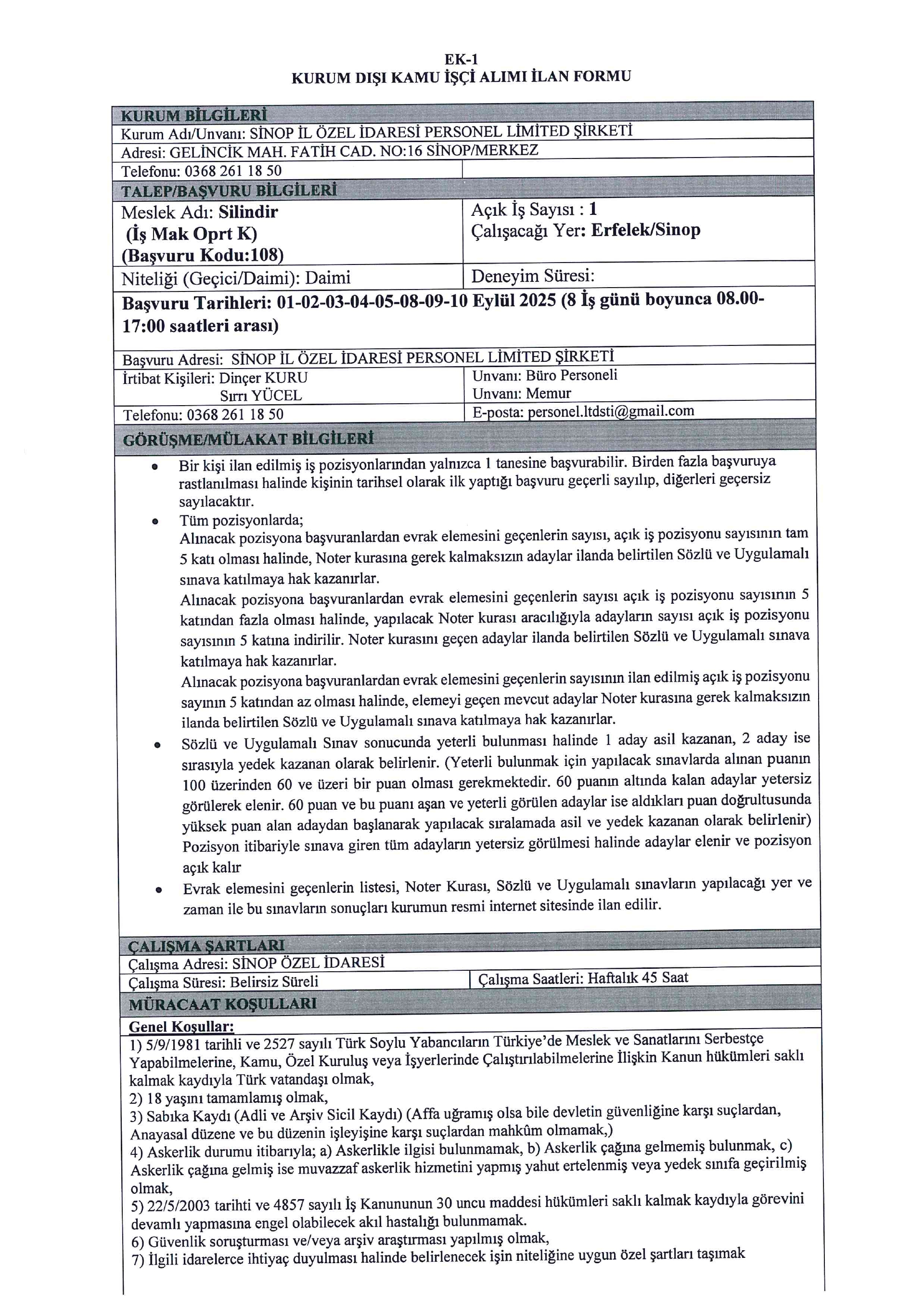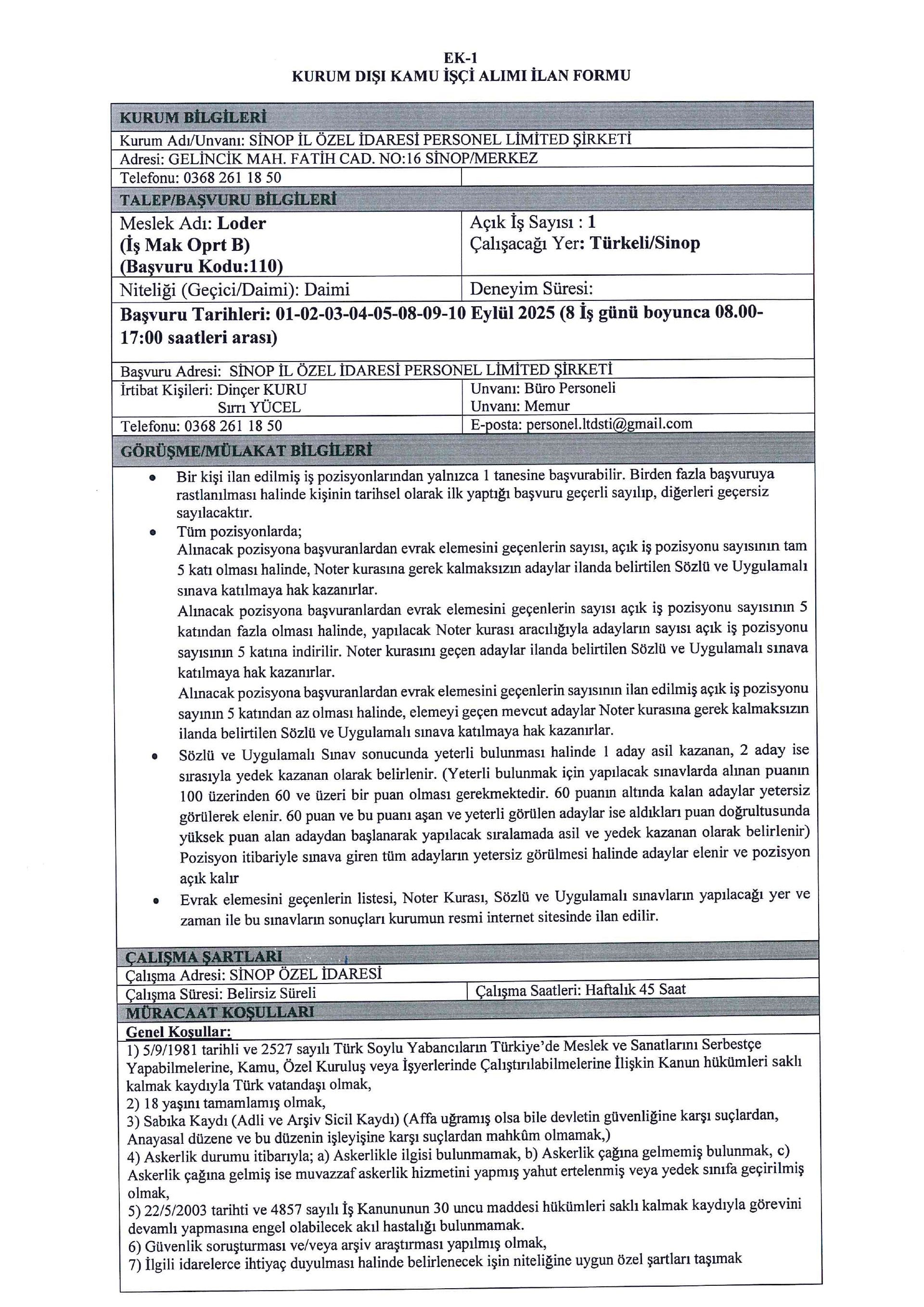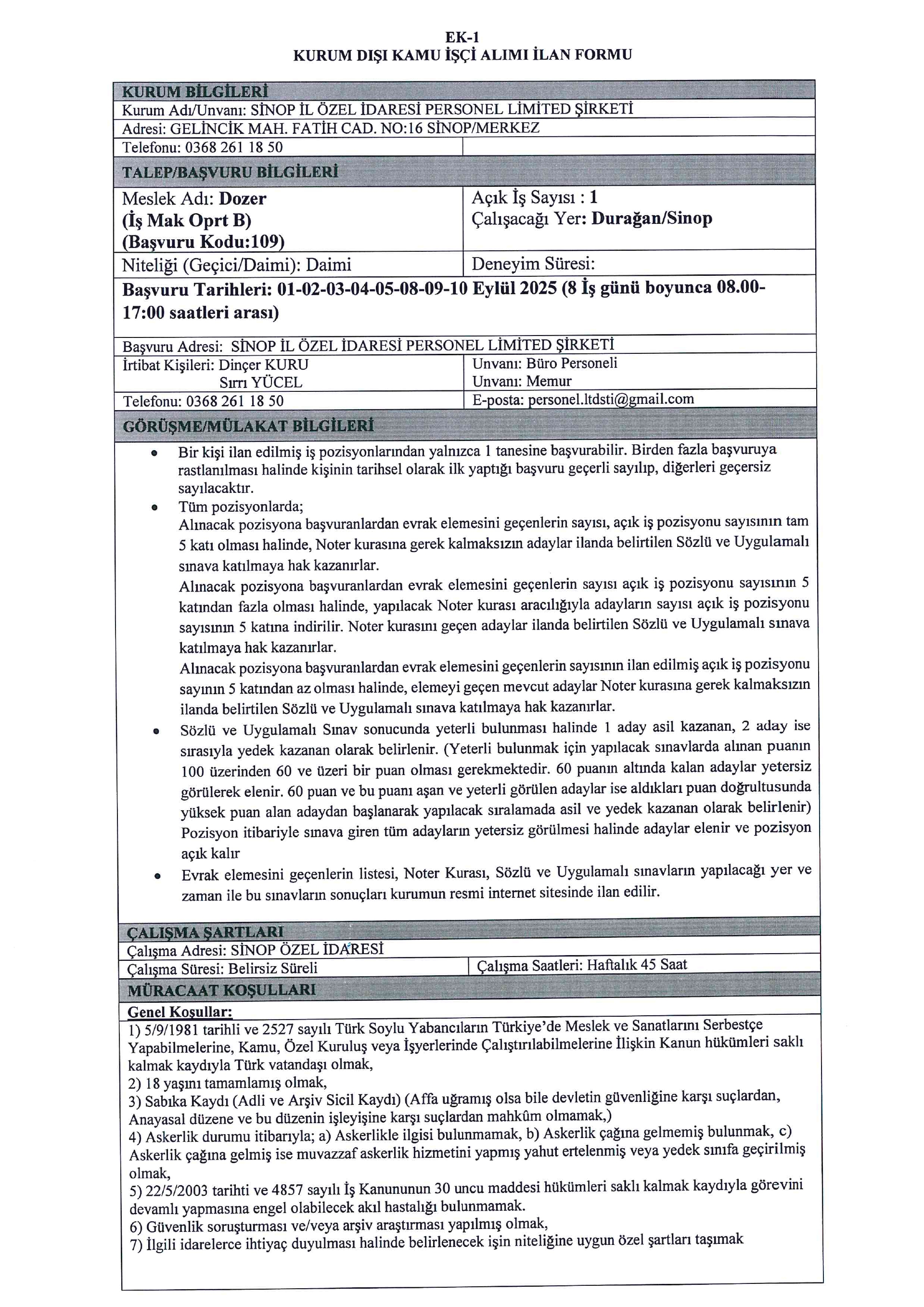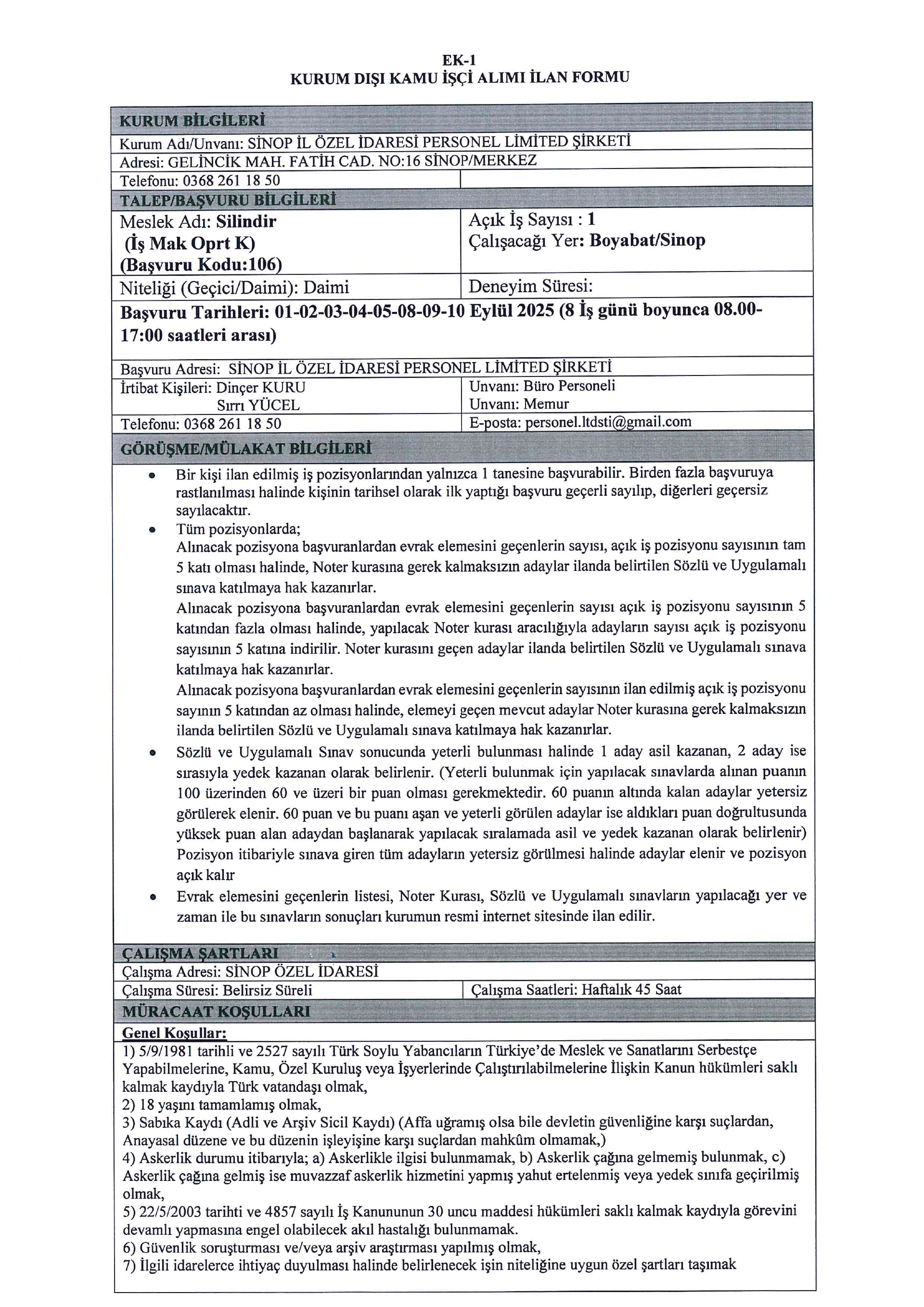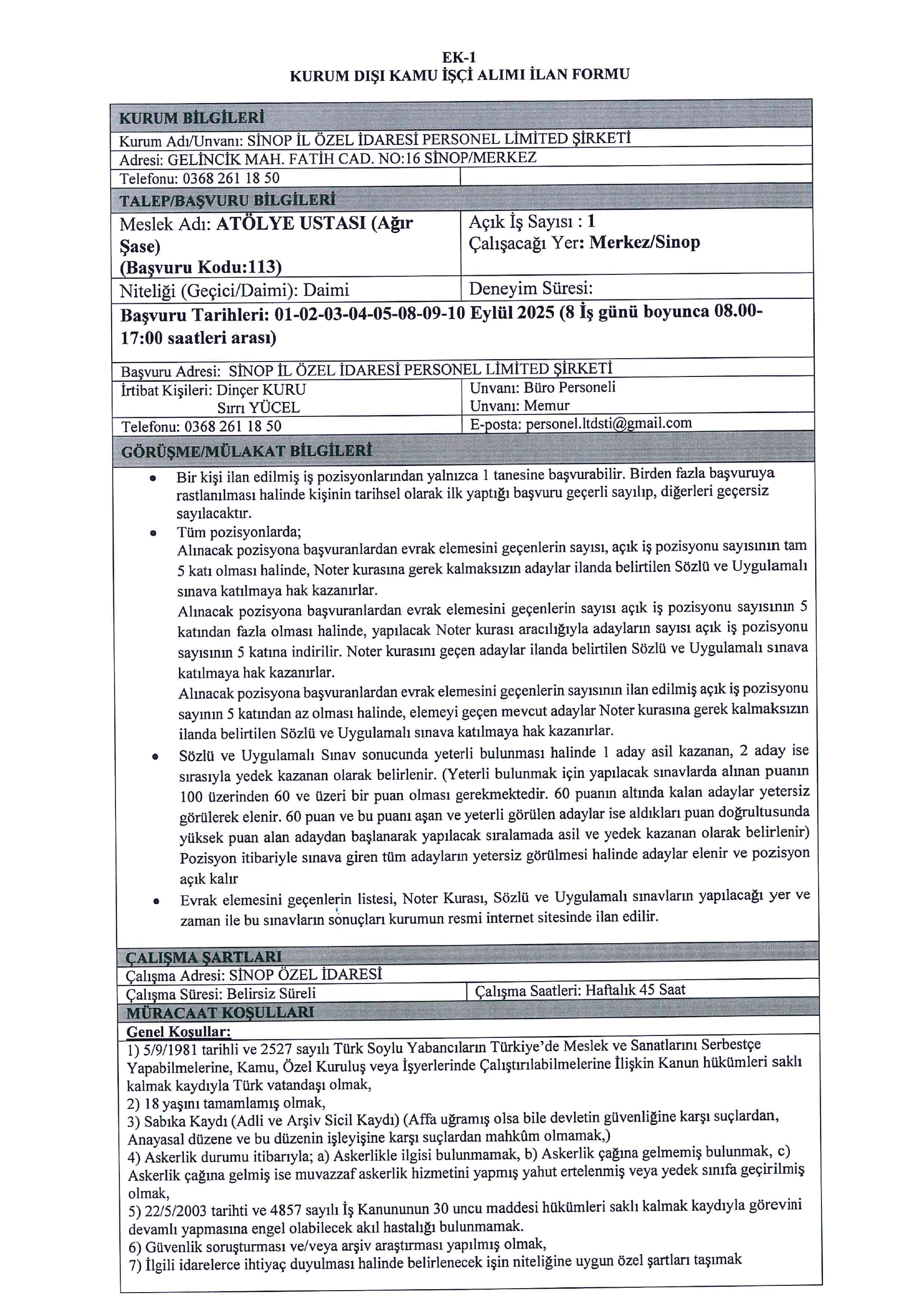 Sinop İl Özel İdaresi 14 İşçi Alacak. Son başvuru tarihi 10 eylül 2025
