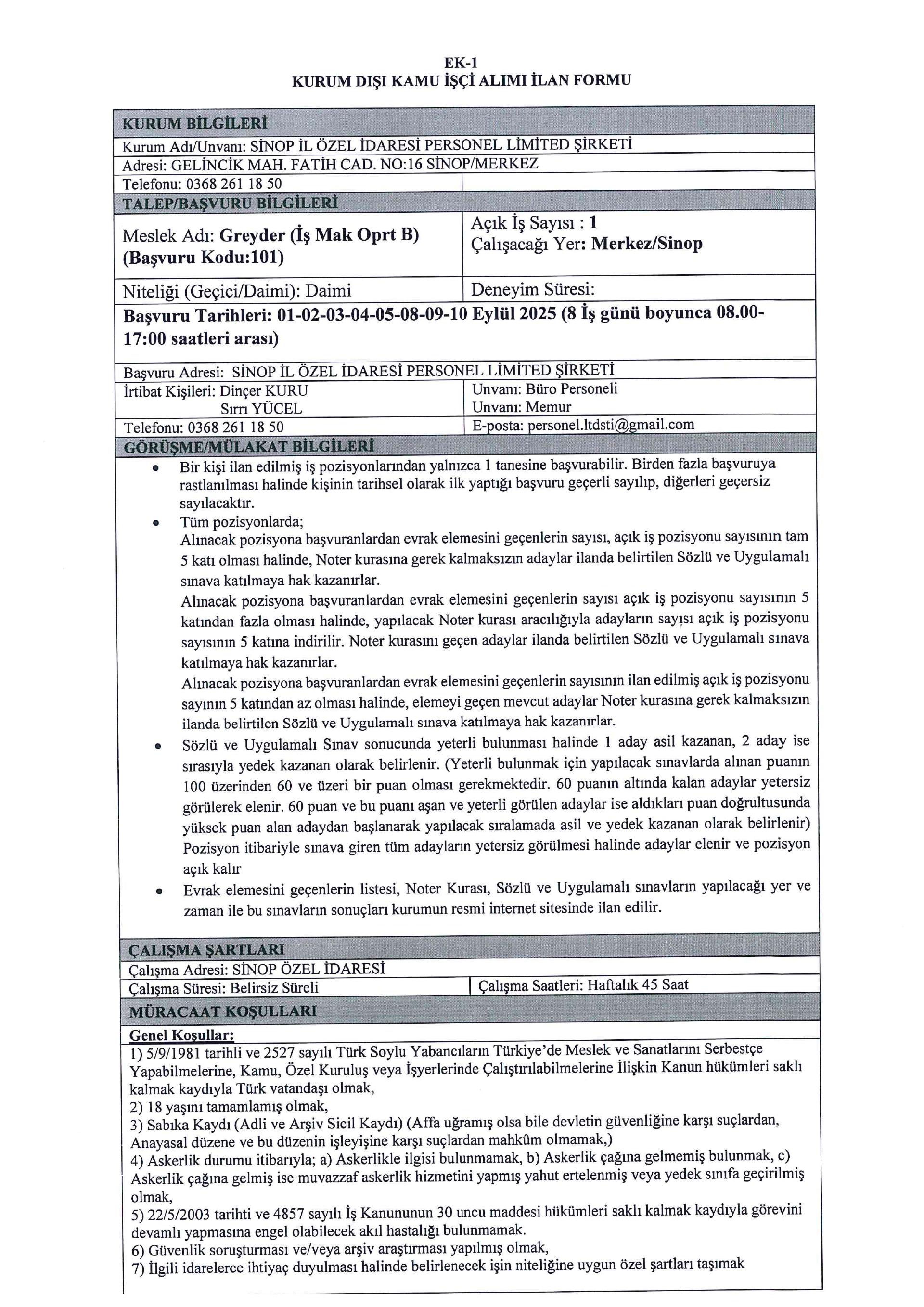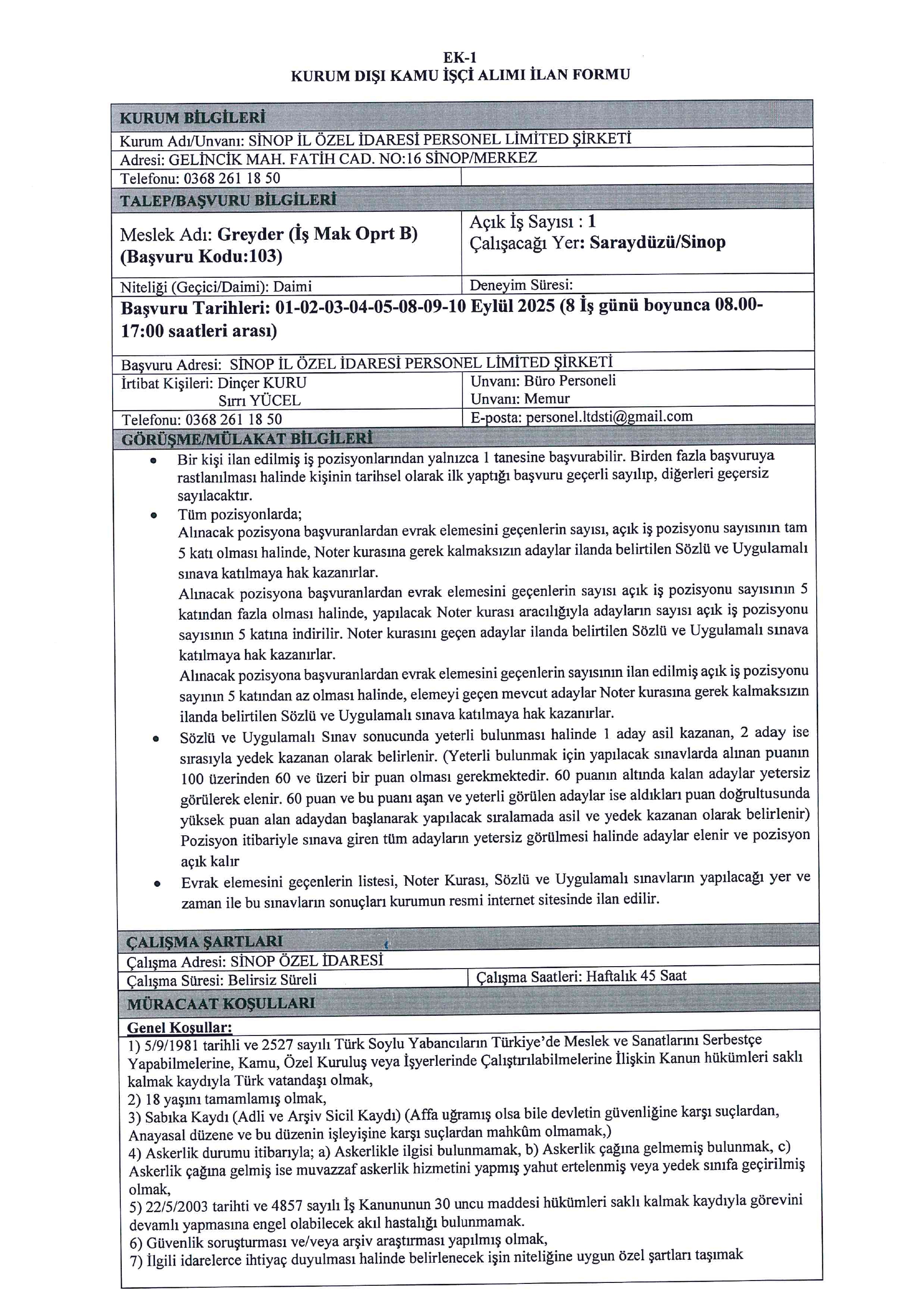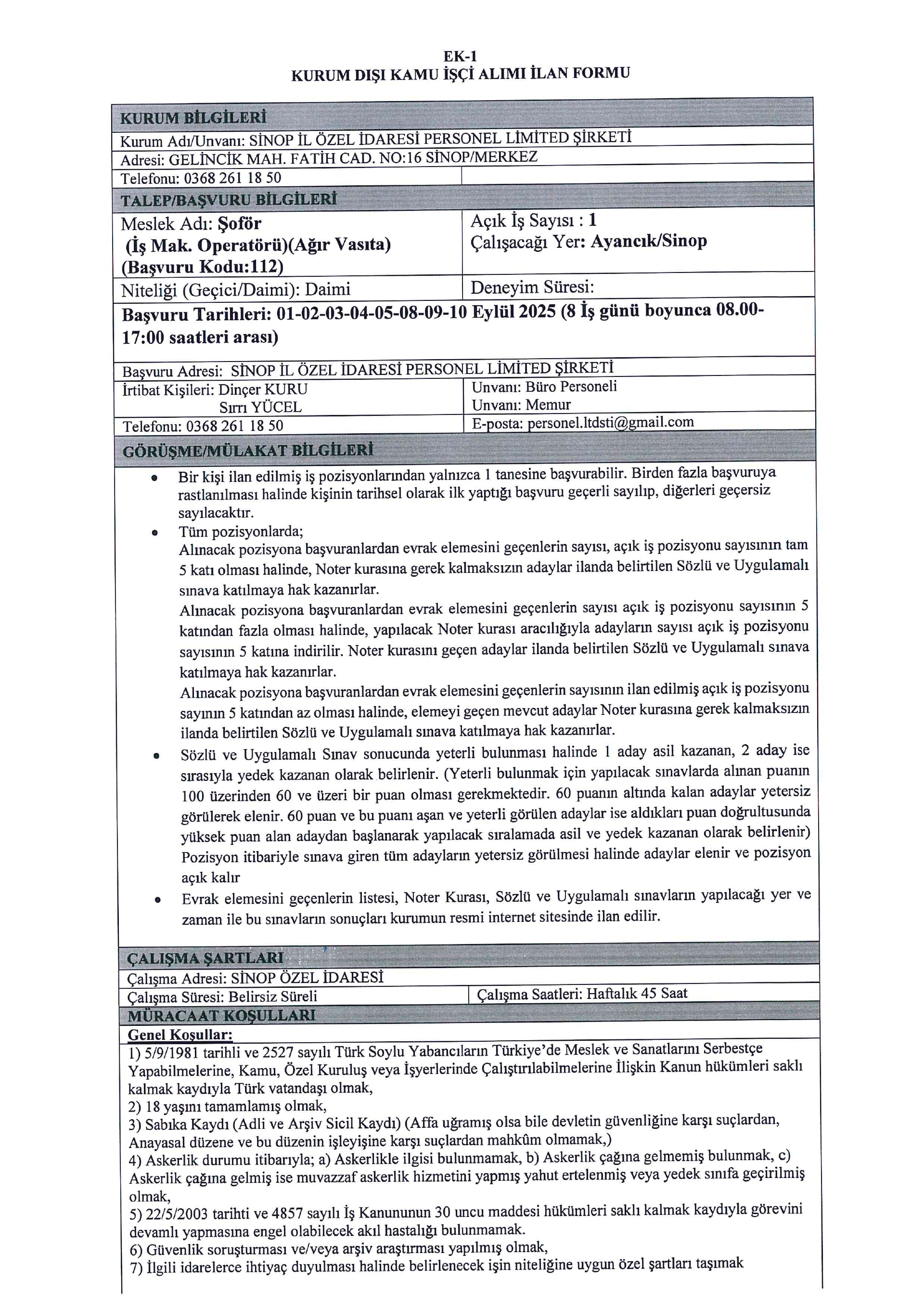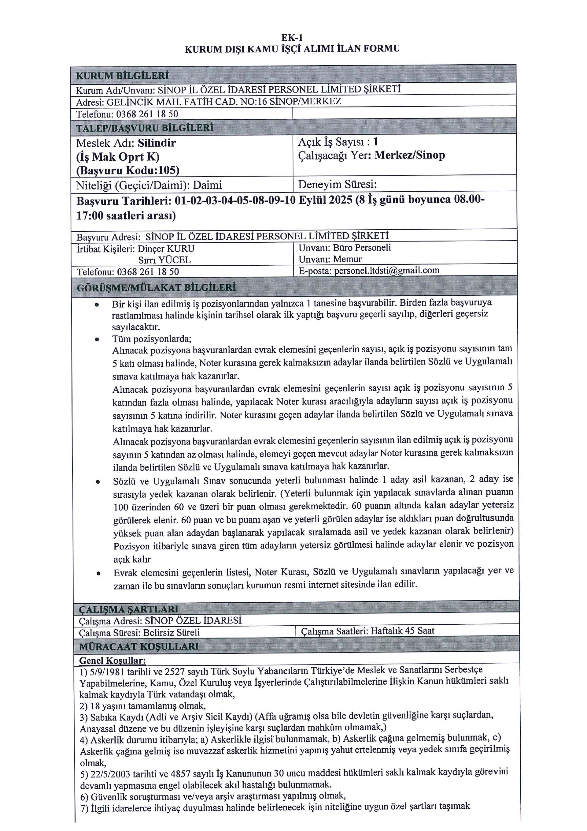 Sinop İl Özel İdaresi 14 İşçi Alacak. Son başvuru tarihi 10 eylül 2025