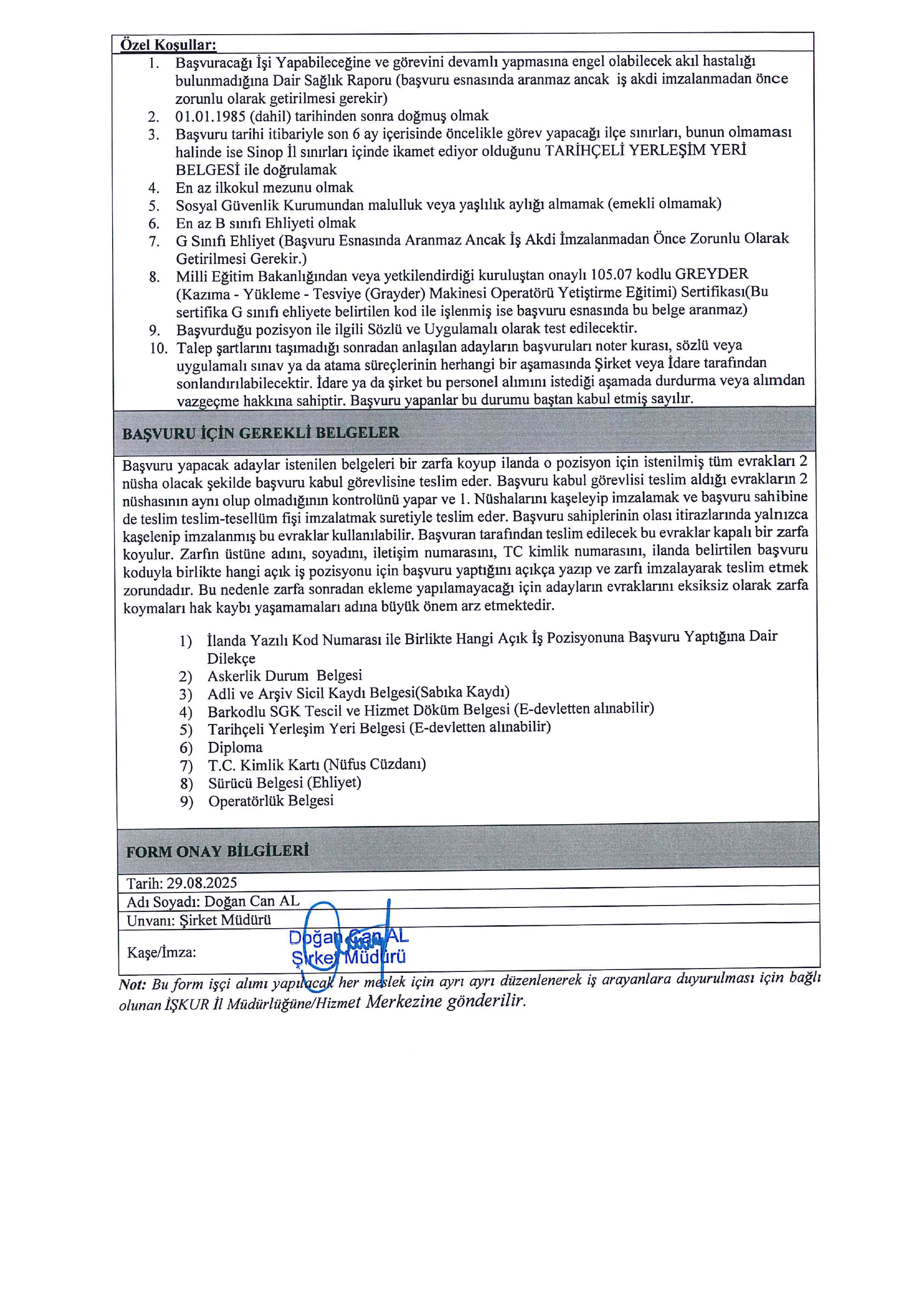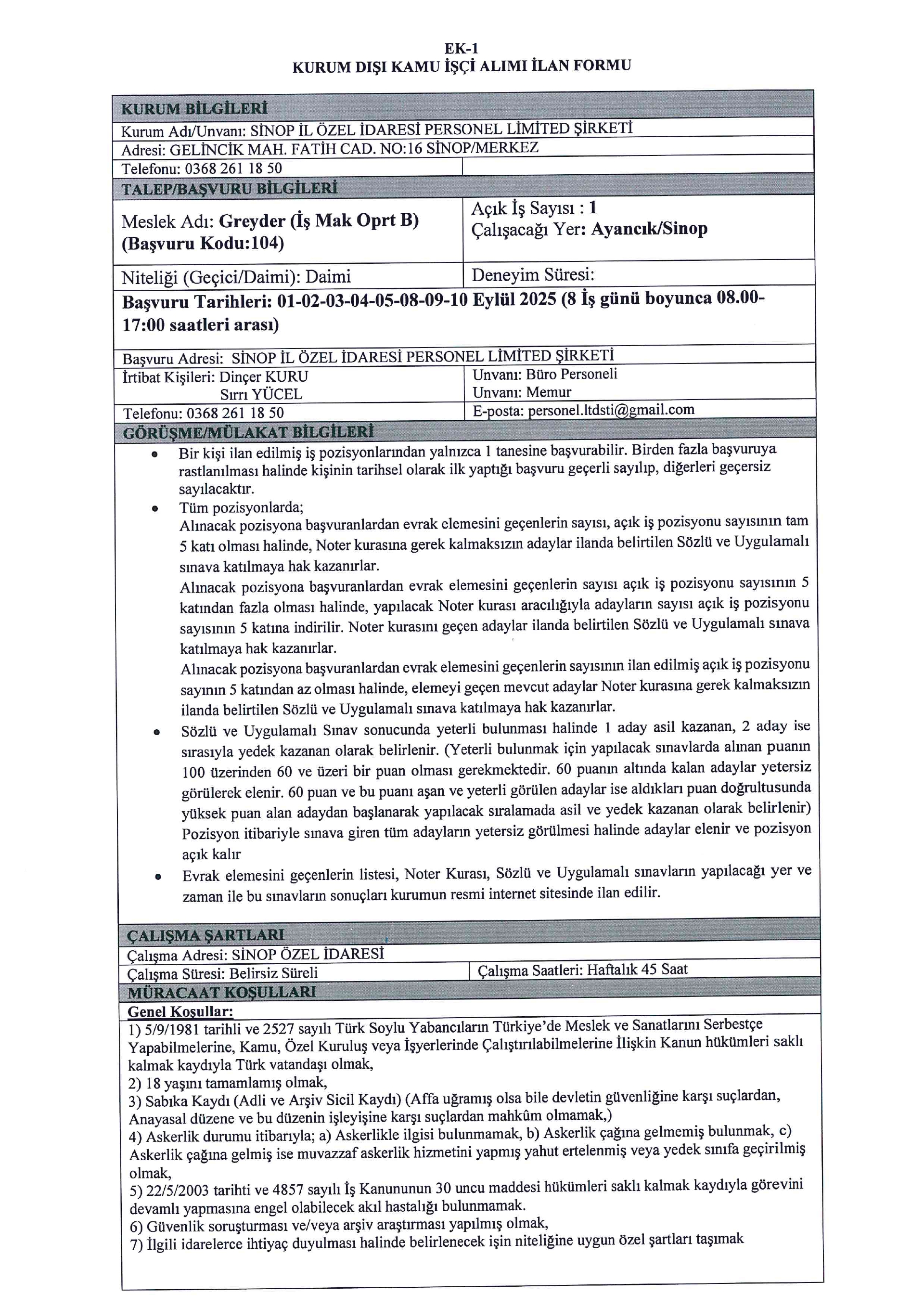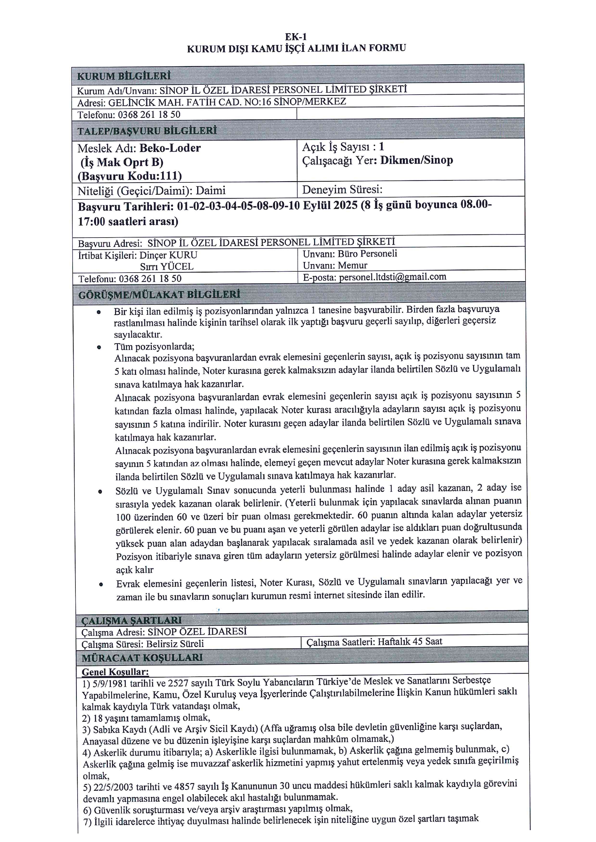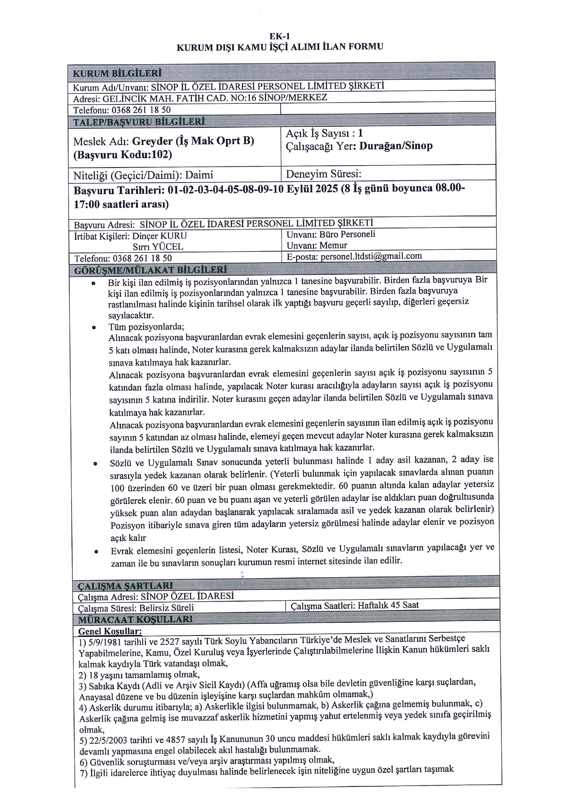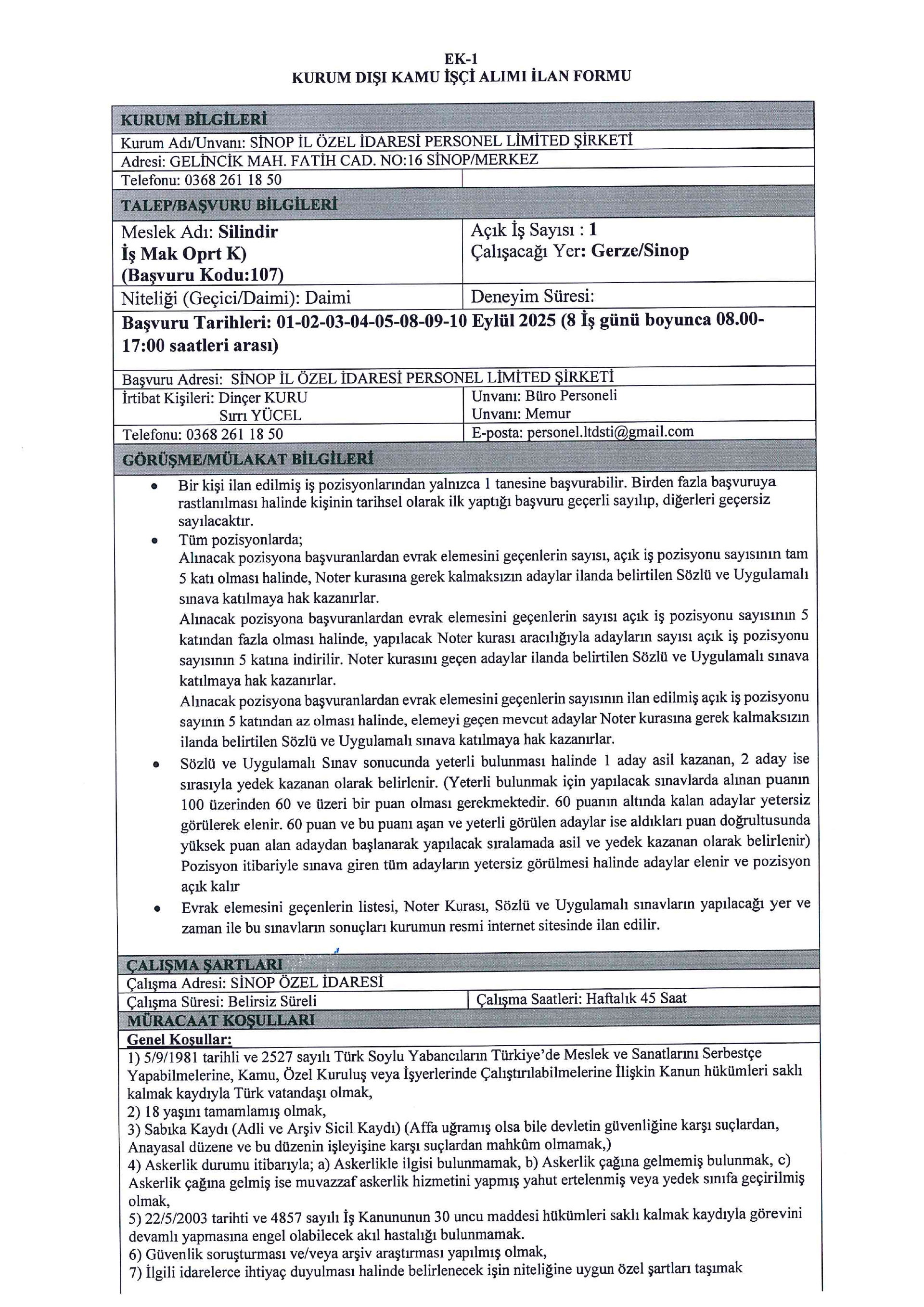 Sinop İl Özel İdaresi 14 İşçi Alacak. Son başvuru tarihi 10 eylül 2025